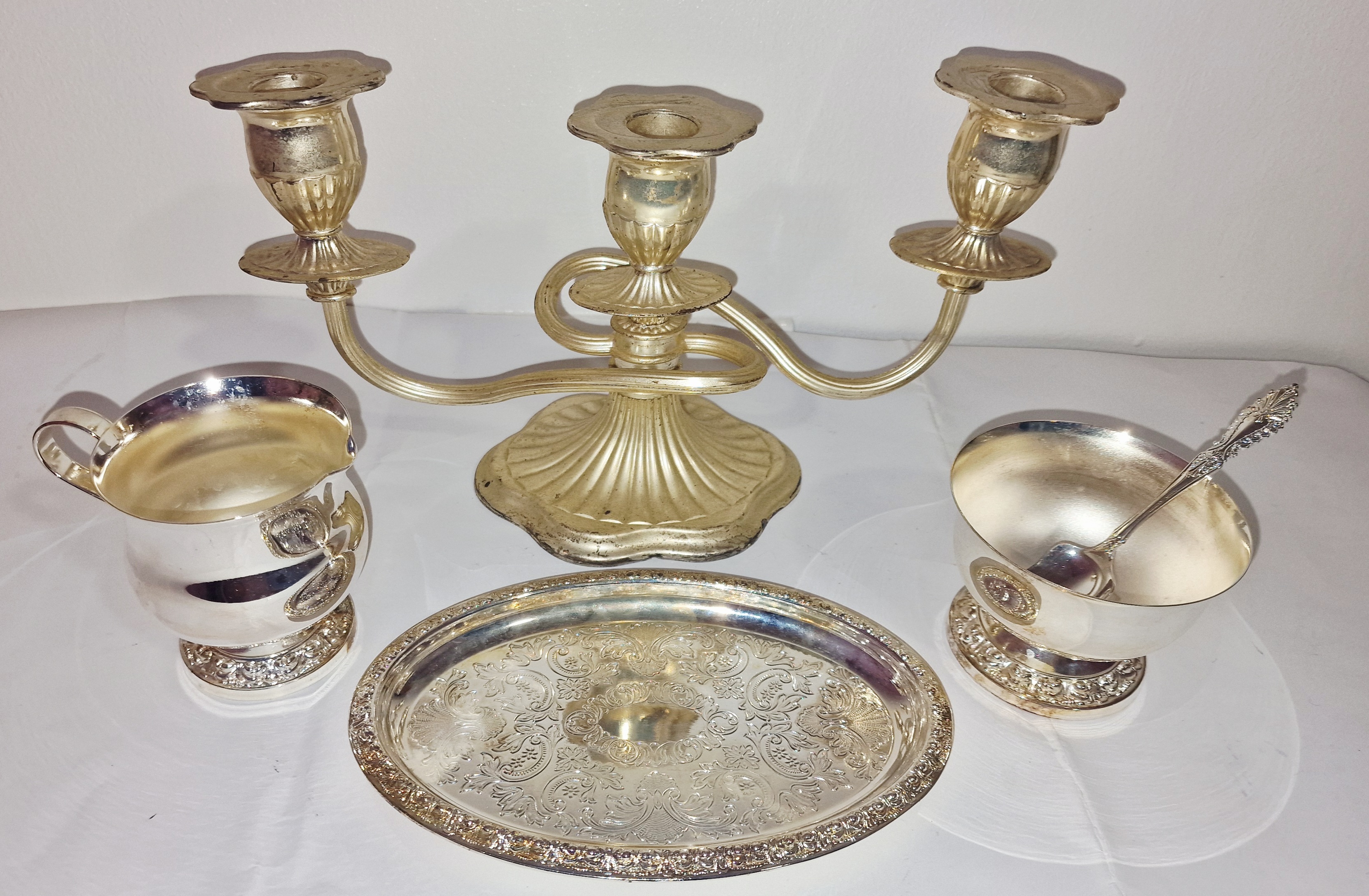 A classic set of silver plated tableware comprising a sugar bowl with matching spoon, cream jug, and serving platter, all stamped Made in England. This traditional grouping is complemented by a silver tone three-candle centrepiece candelabra, adding a decorative and functional element for elegant dining or display.