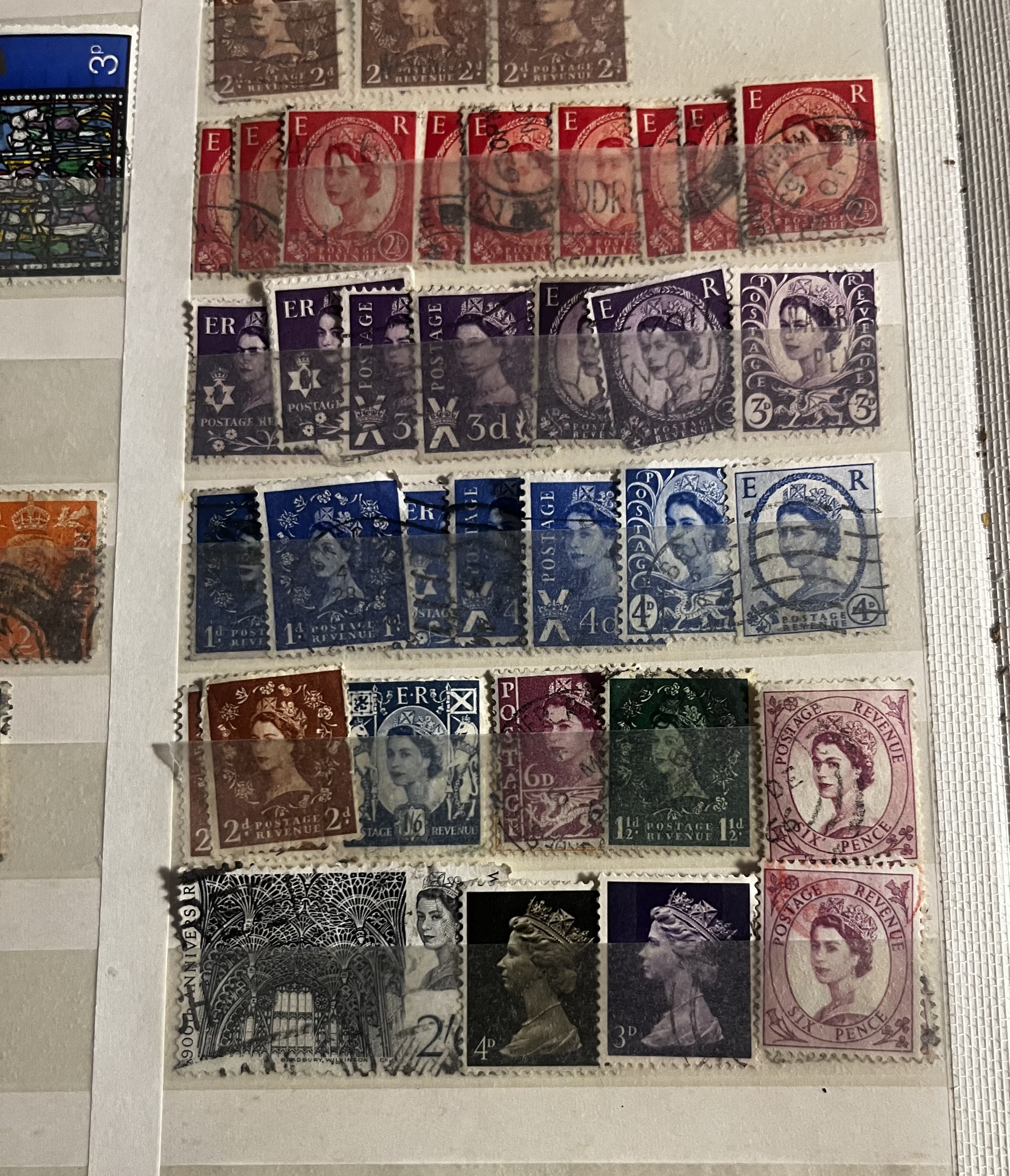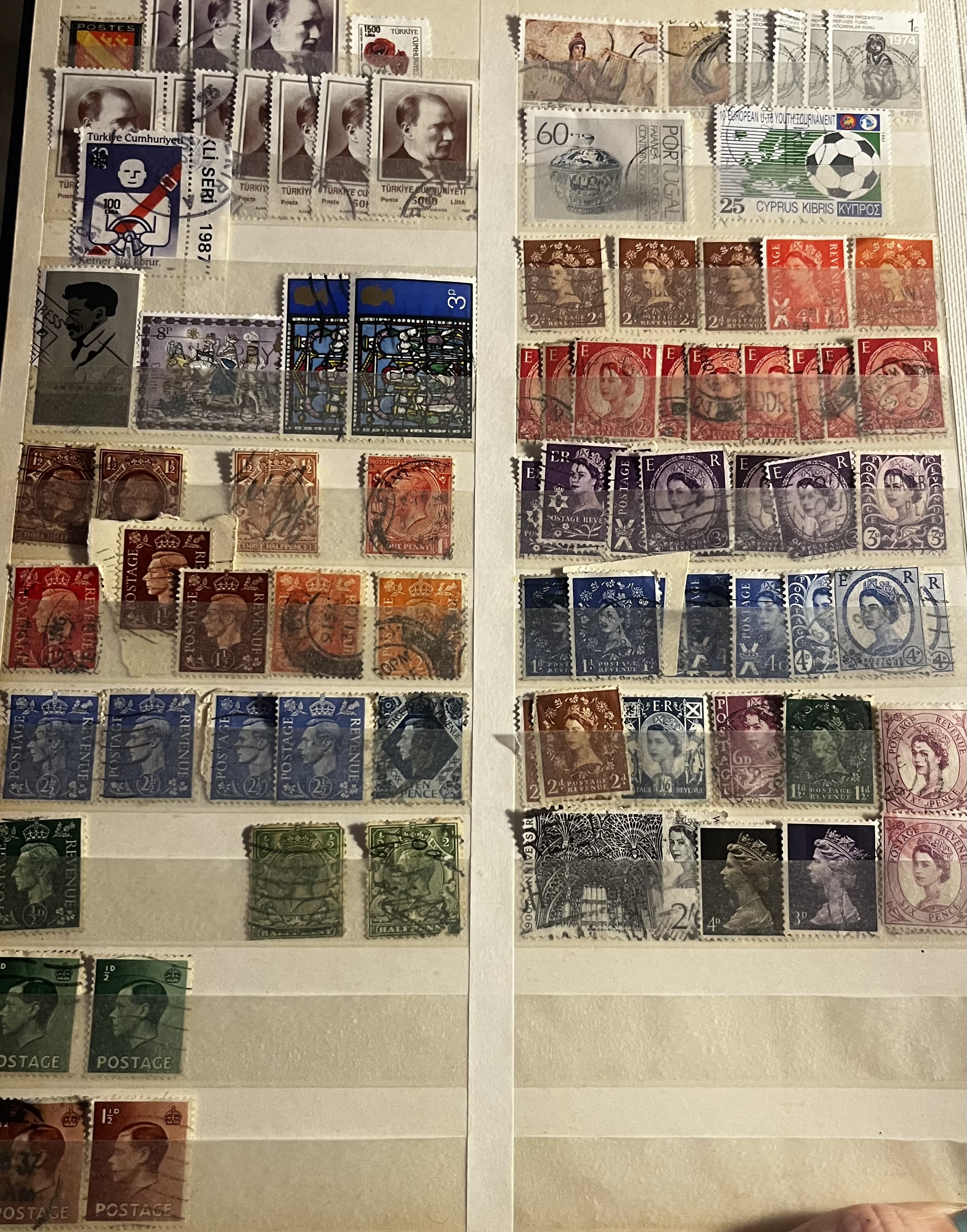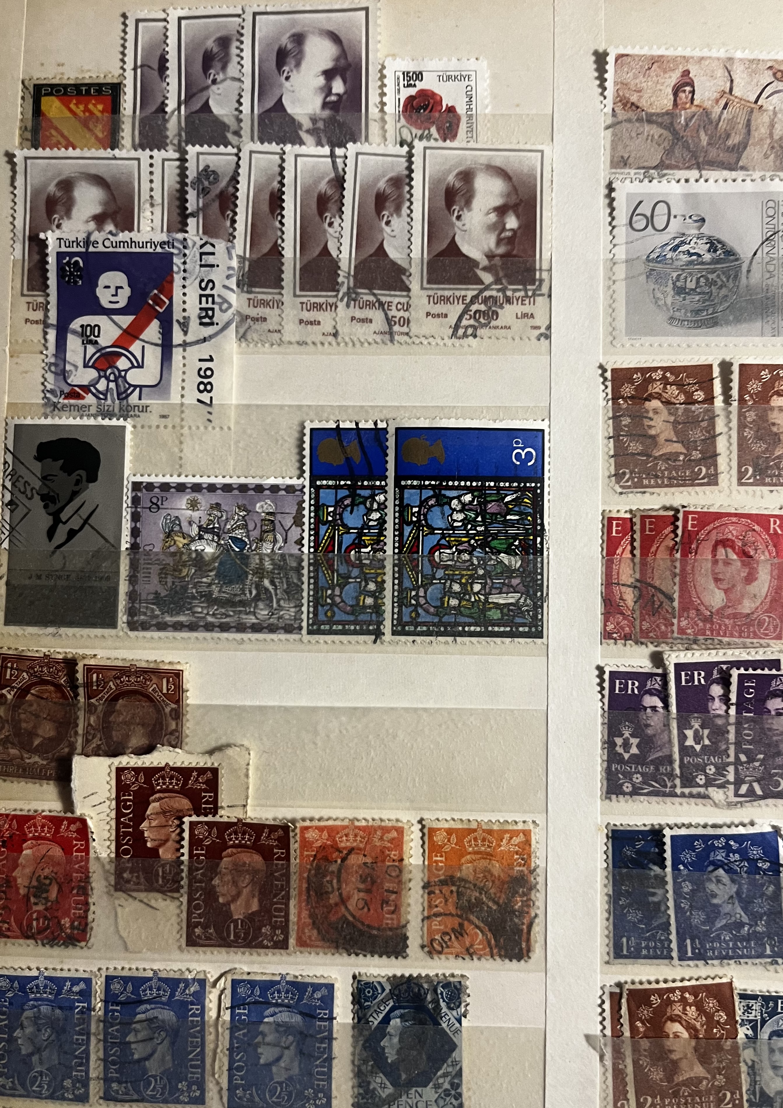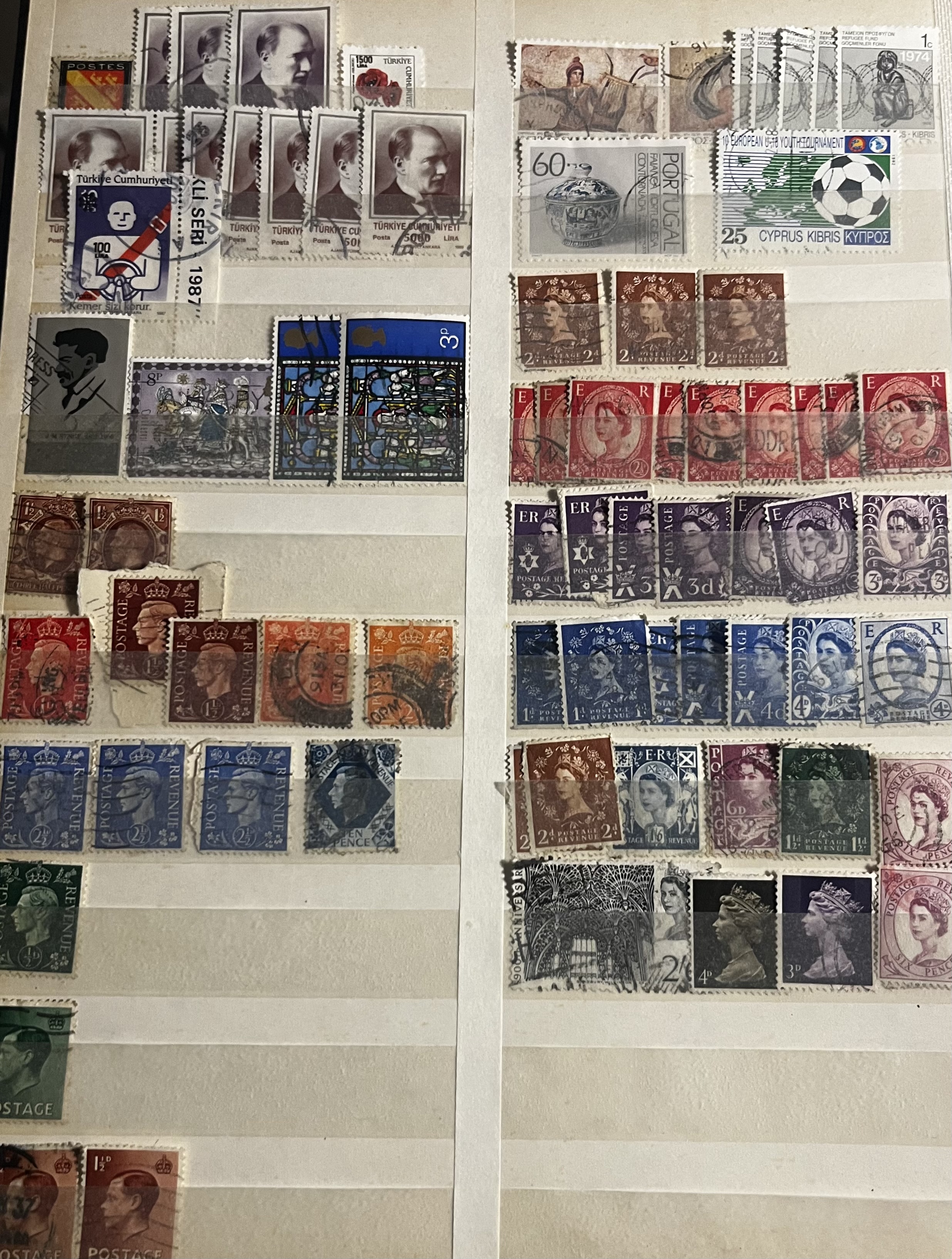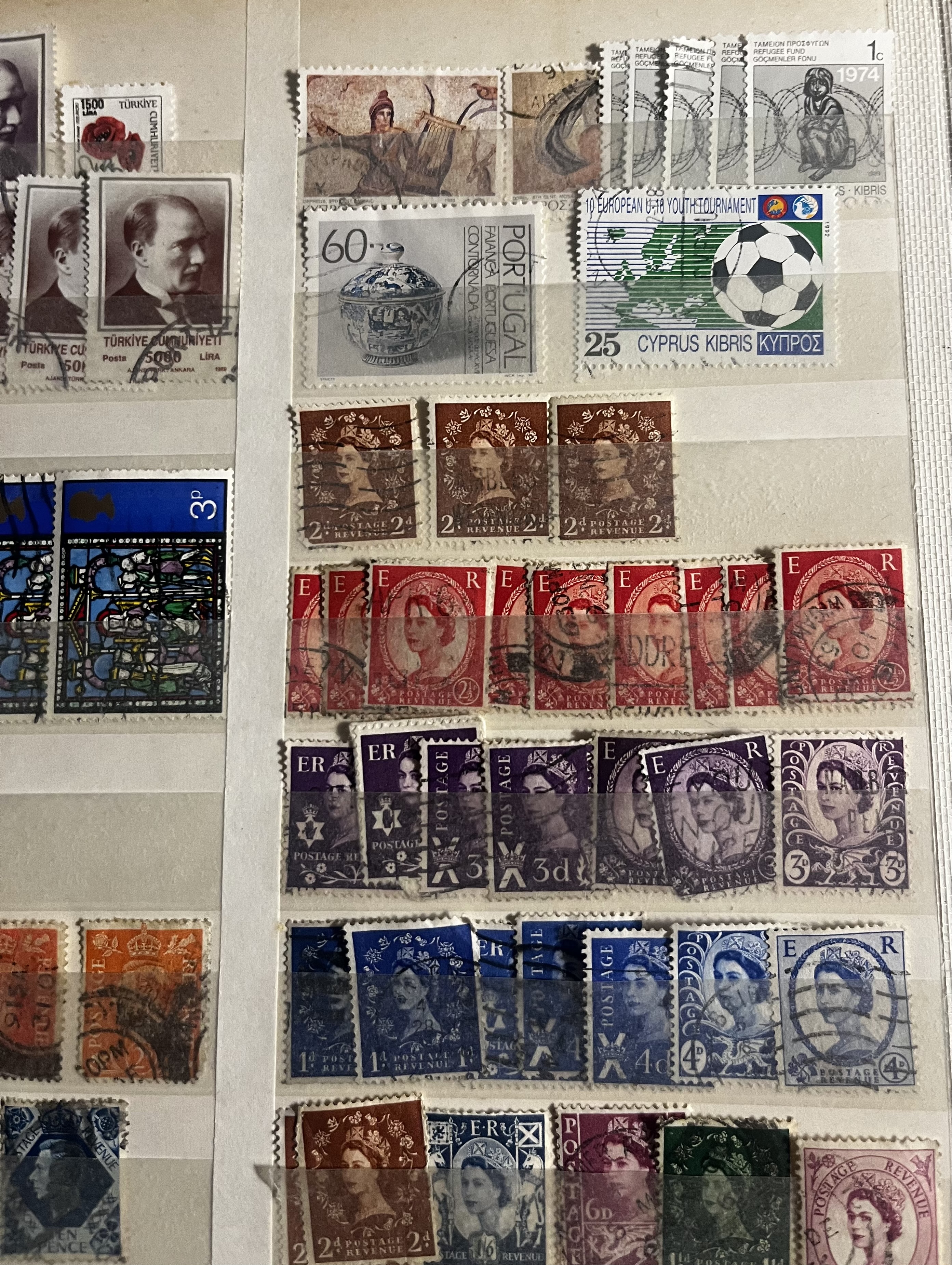 Includes a mix of used commemoratives and definitives, with notable appearances from early QEII issues, George VI, and a range of foreign stamps including Turkey, Cyprus, Portugal, and more.