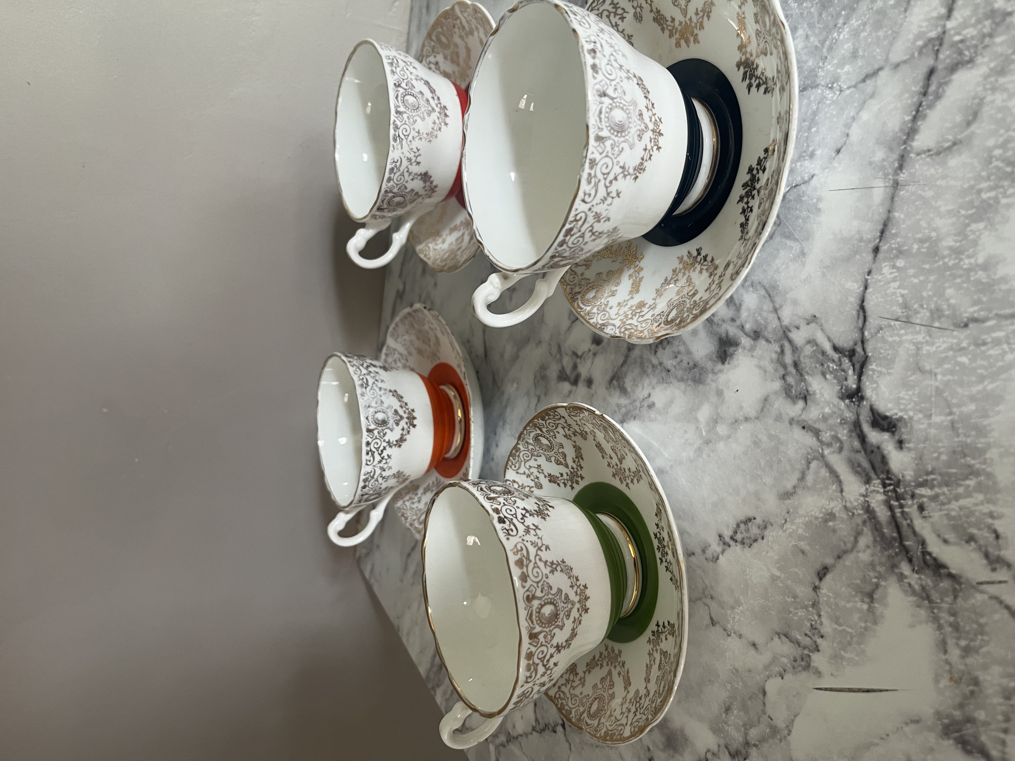 The sets come in various “Harlequin Colours” for the base of the cup, as seen in the image with green, orange, black, and red options
