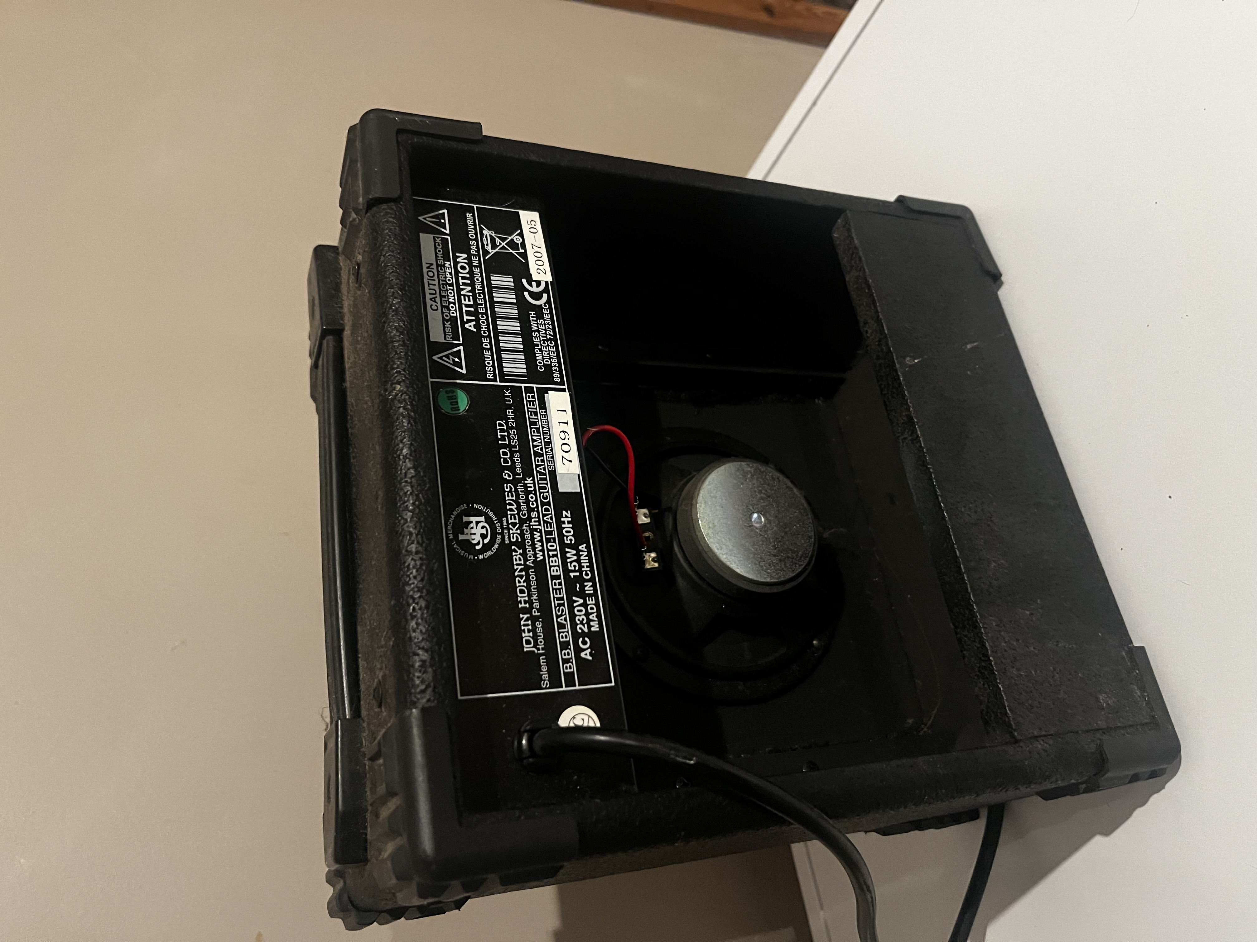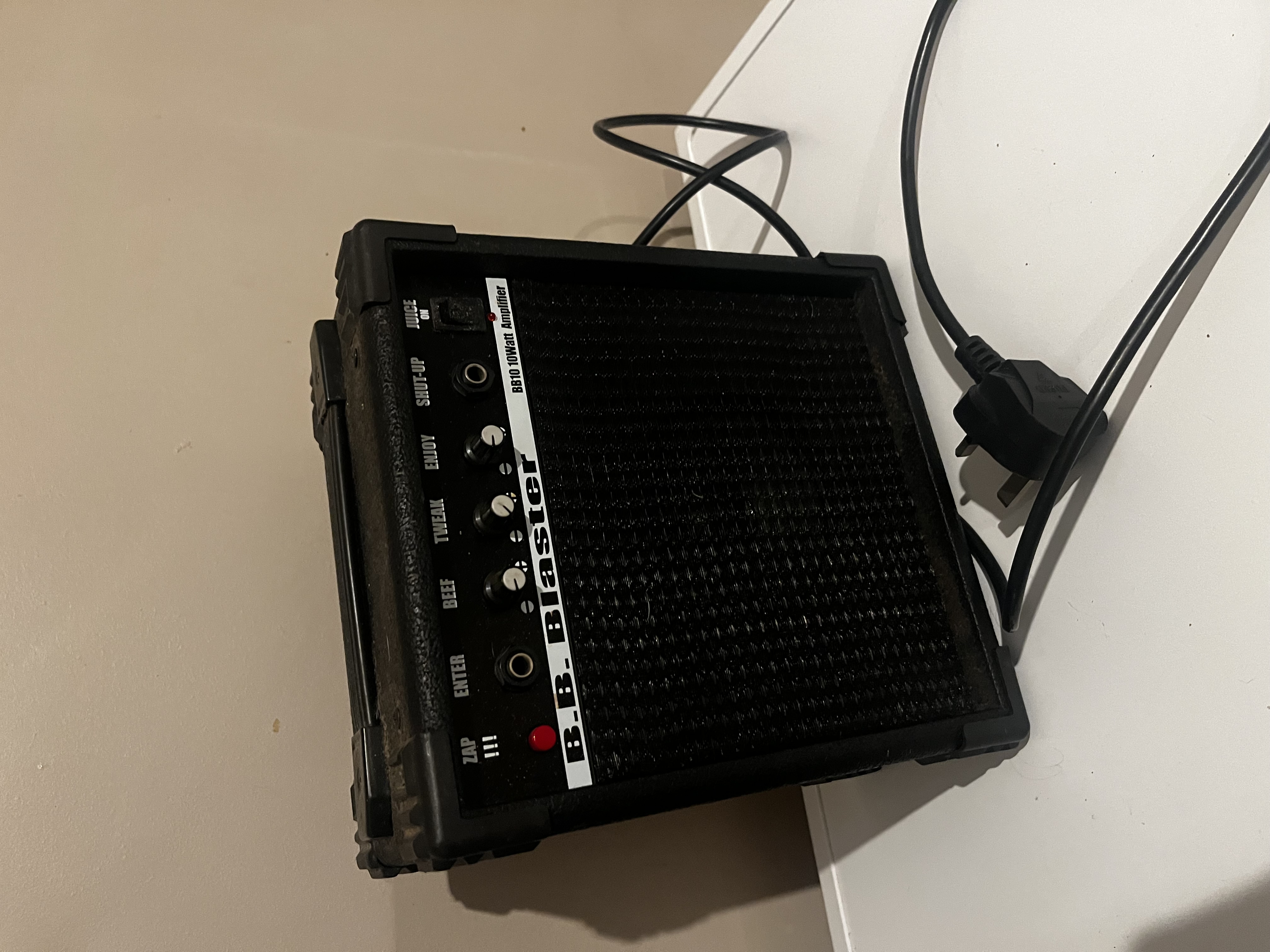 The image shows a B.B. Blaster BB10 10 Watt Guitar Amplifier. This is a compact 10-watt guitar practice amplifier,