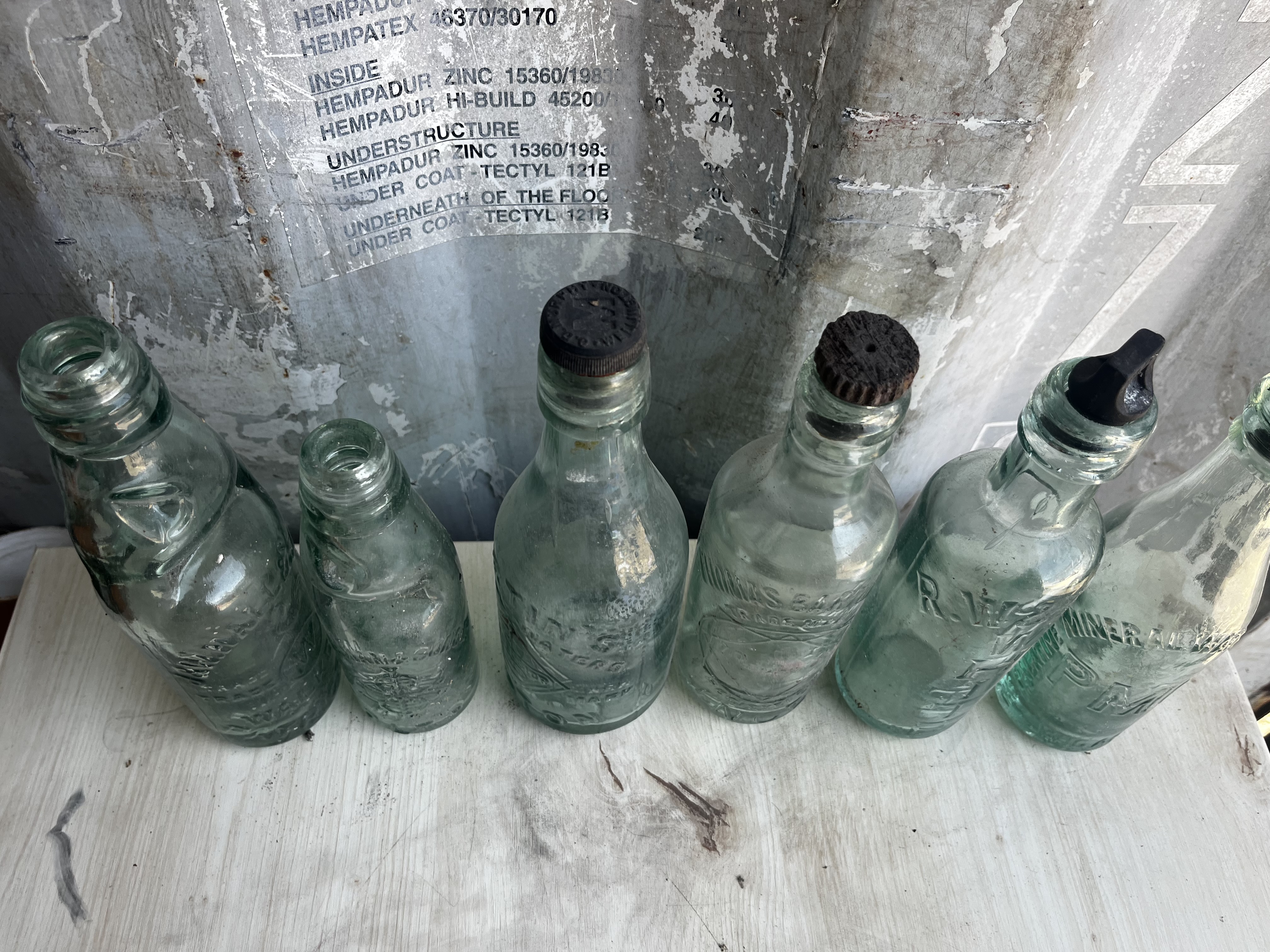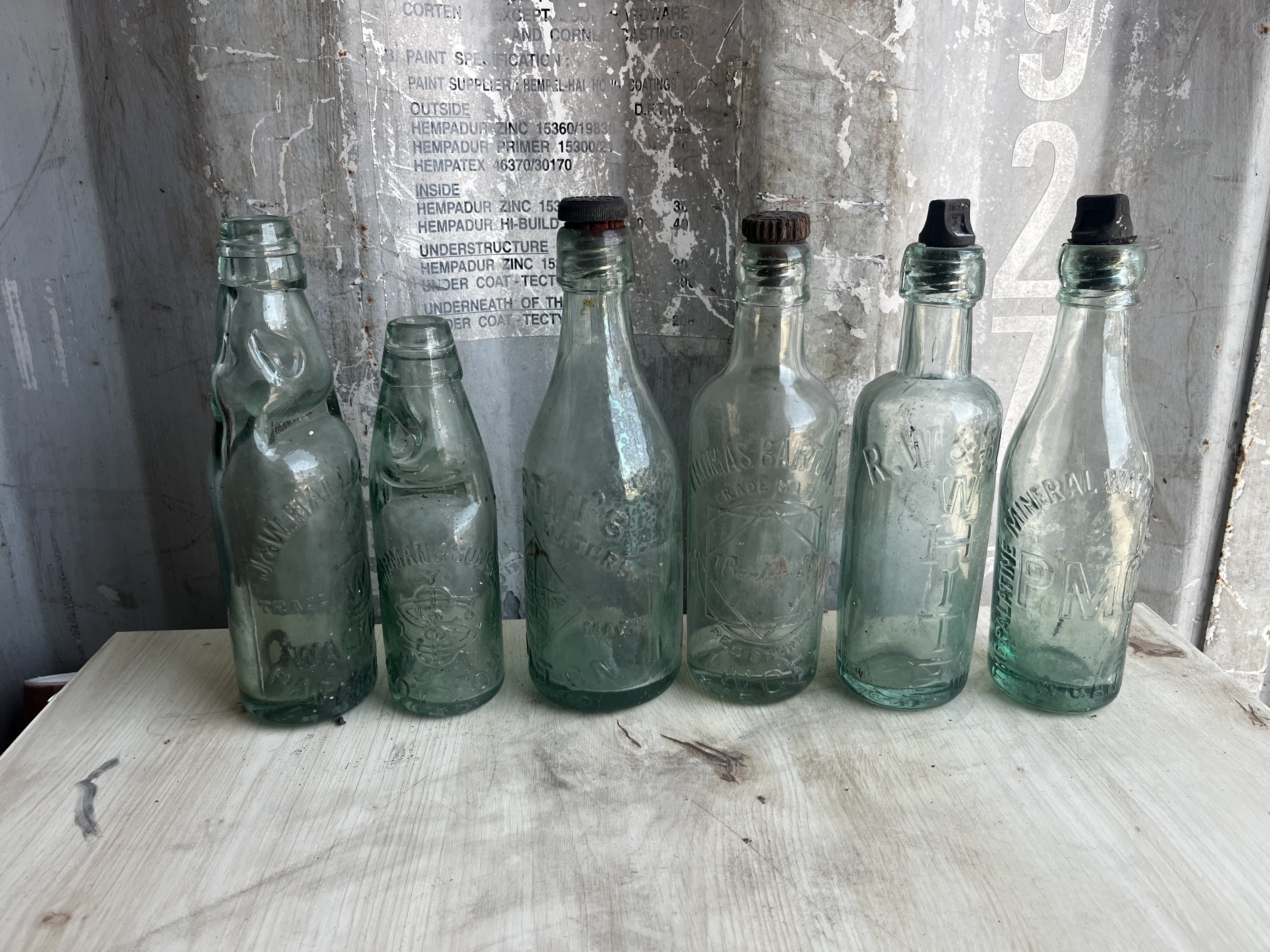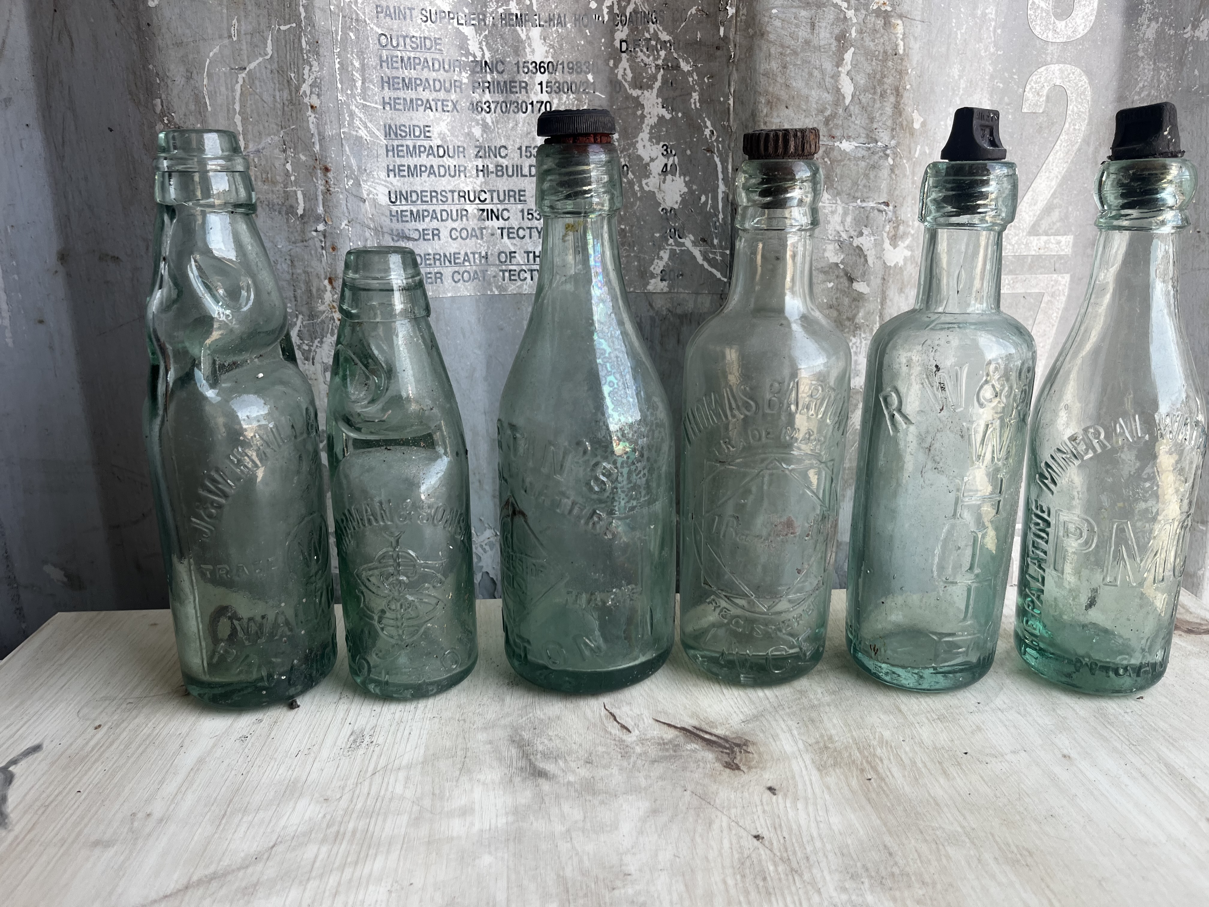Assorted Styles: The lot includes various bottle forms, such as a distinctive Codd-neck style bottle with its characteristic pinched neck designed to house a marble stopper for carbonated drinks, alongside other blob-top and potentially crown-top examples.