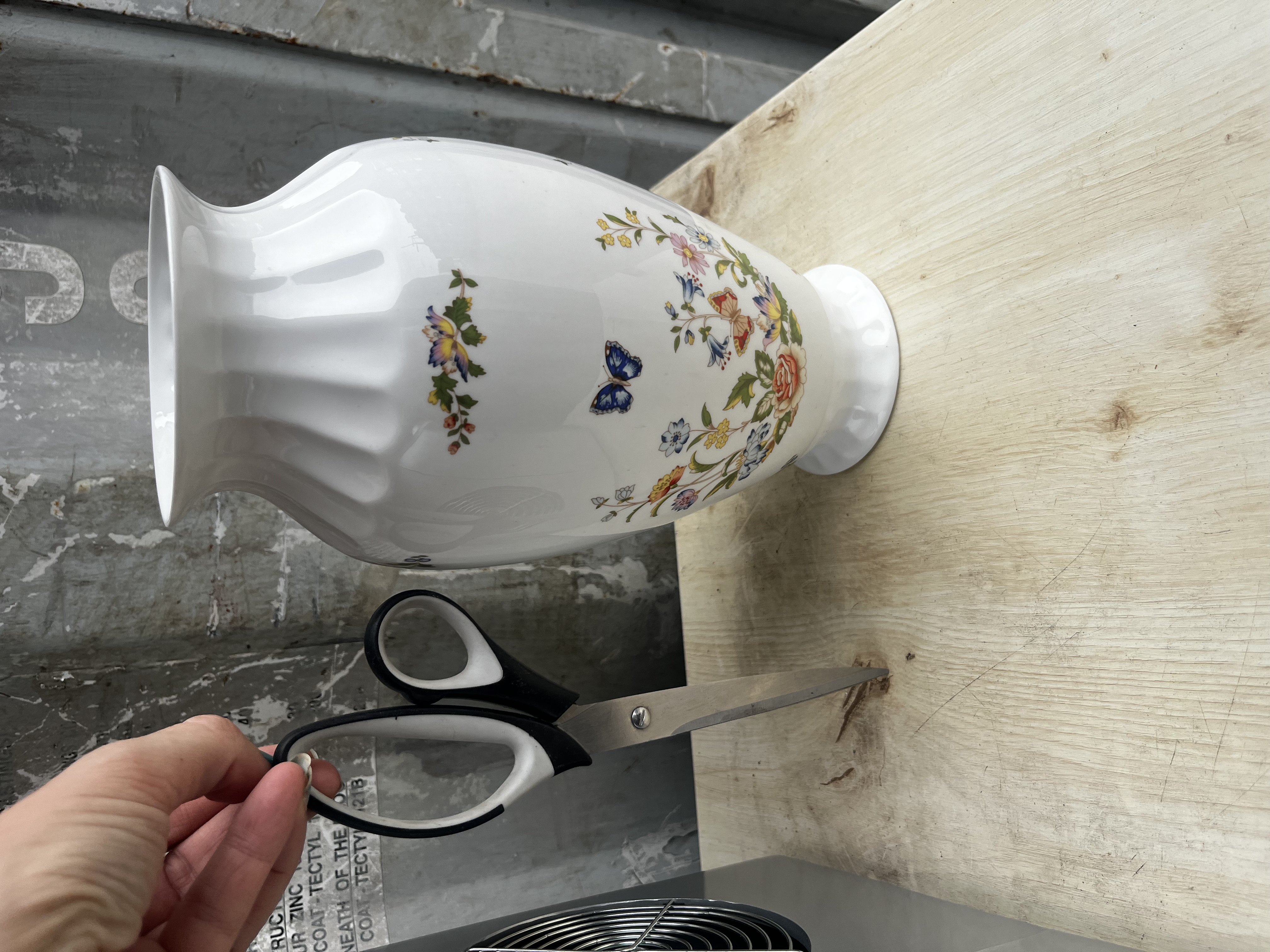 fine bone china, decorated with a vibrant array of small flowers and delicate butterflies on a fluted, swirled background. Crafted in England by Aynsley China Limited, this charming vase combines timeless English garden style with fine porcelain craftsmanship. Ideal for displaying fresh flowers or as a standalone decorative piece, it adds classic elegance to any interior.