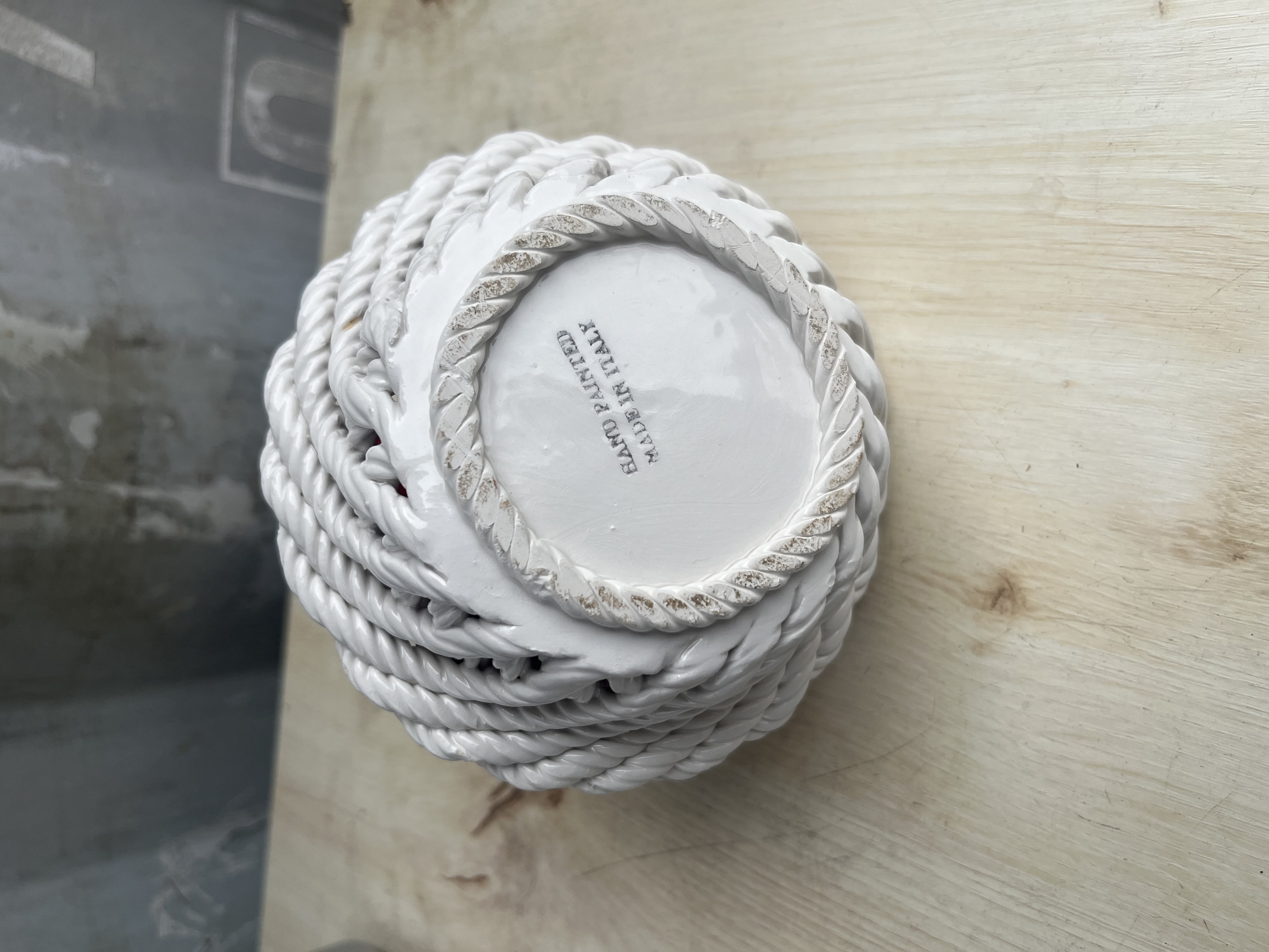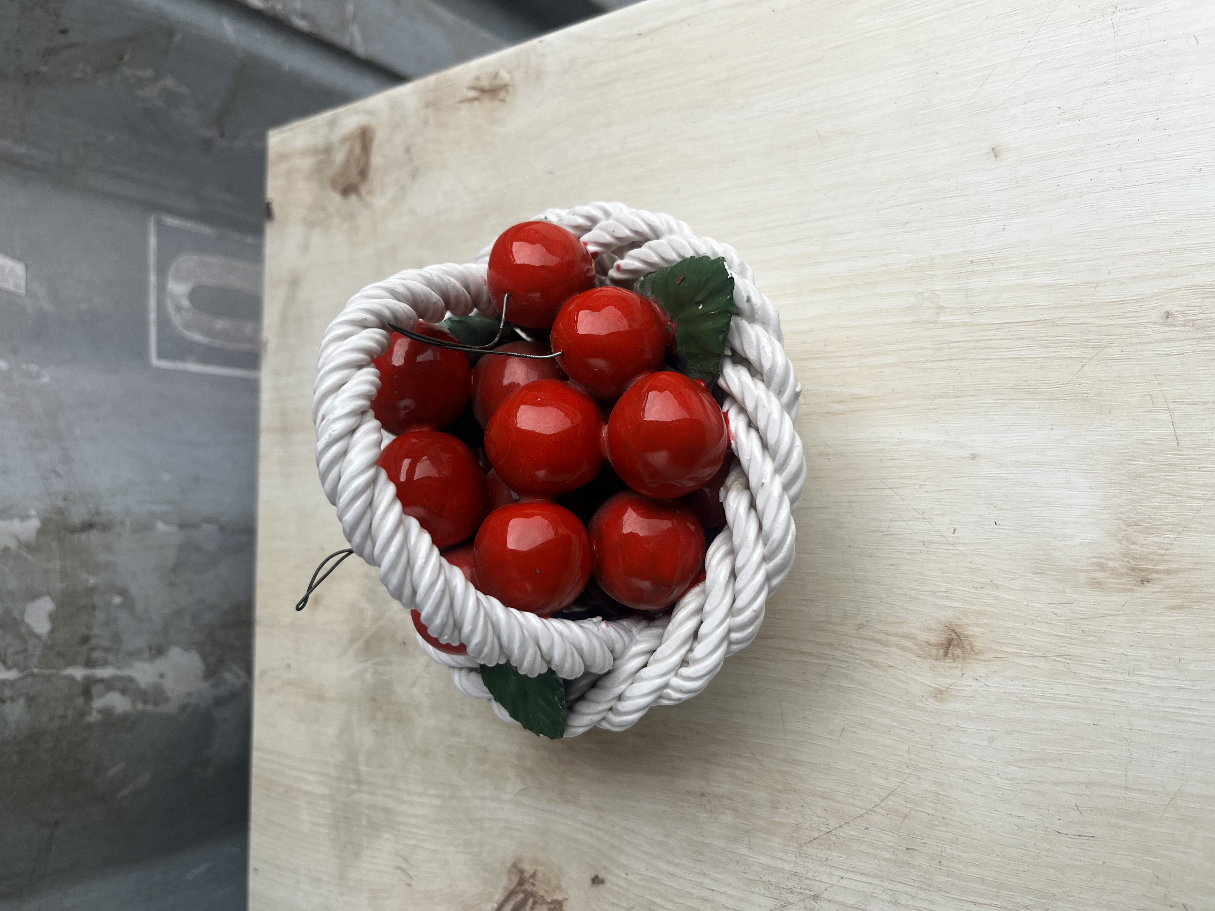 made in Italy. The piece is finely modelled with a ceramic basket and cherries, the stems formed from wire. A decorative example of Capodimonte’s detailed style and a popular collectible for enthusiasts of Italian porcelain.