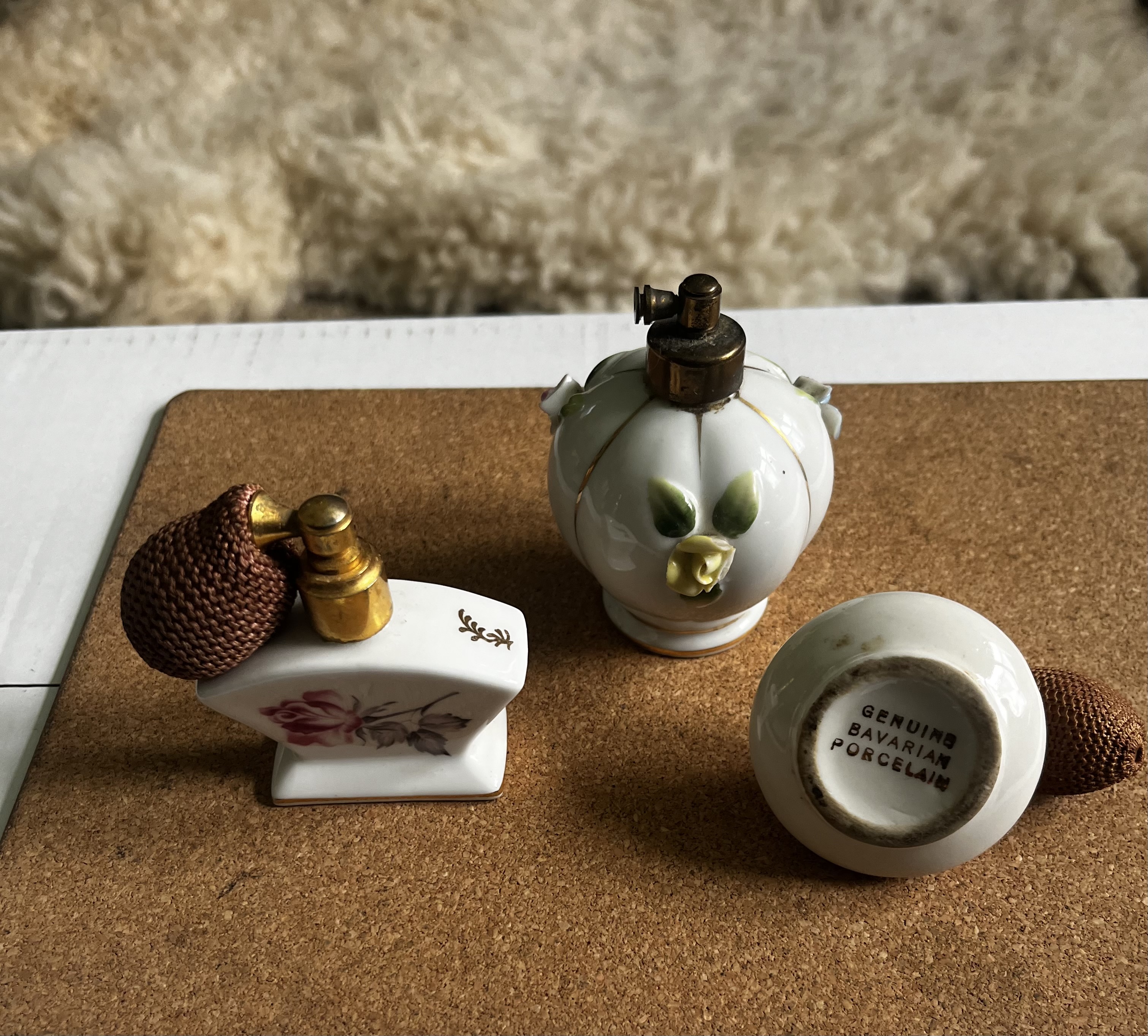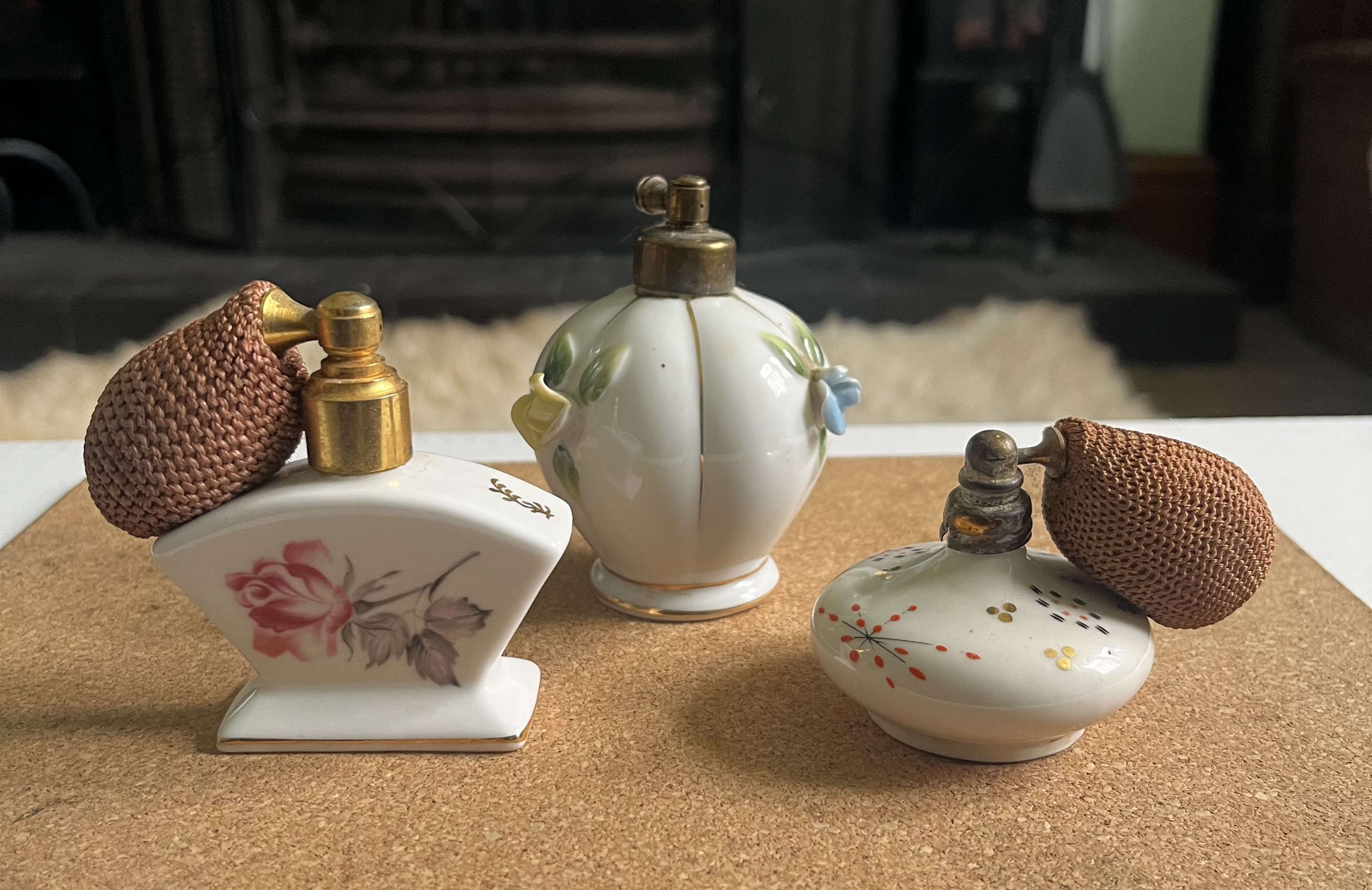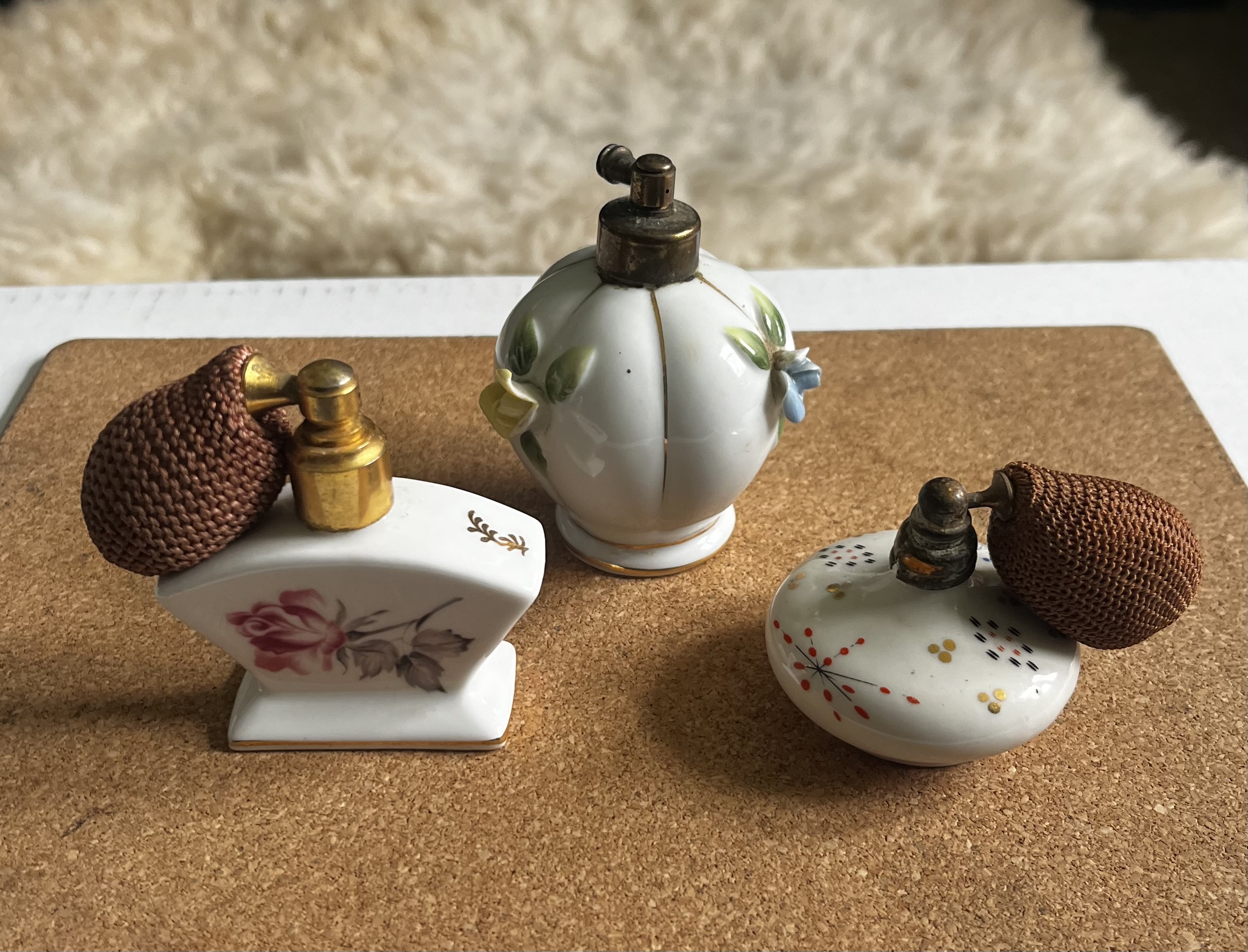 A decorative trio of vintage bone china perfume atomisers, each with delicate detailing and classic floral motifs: