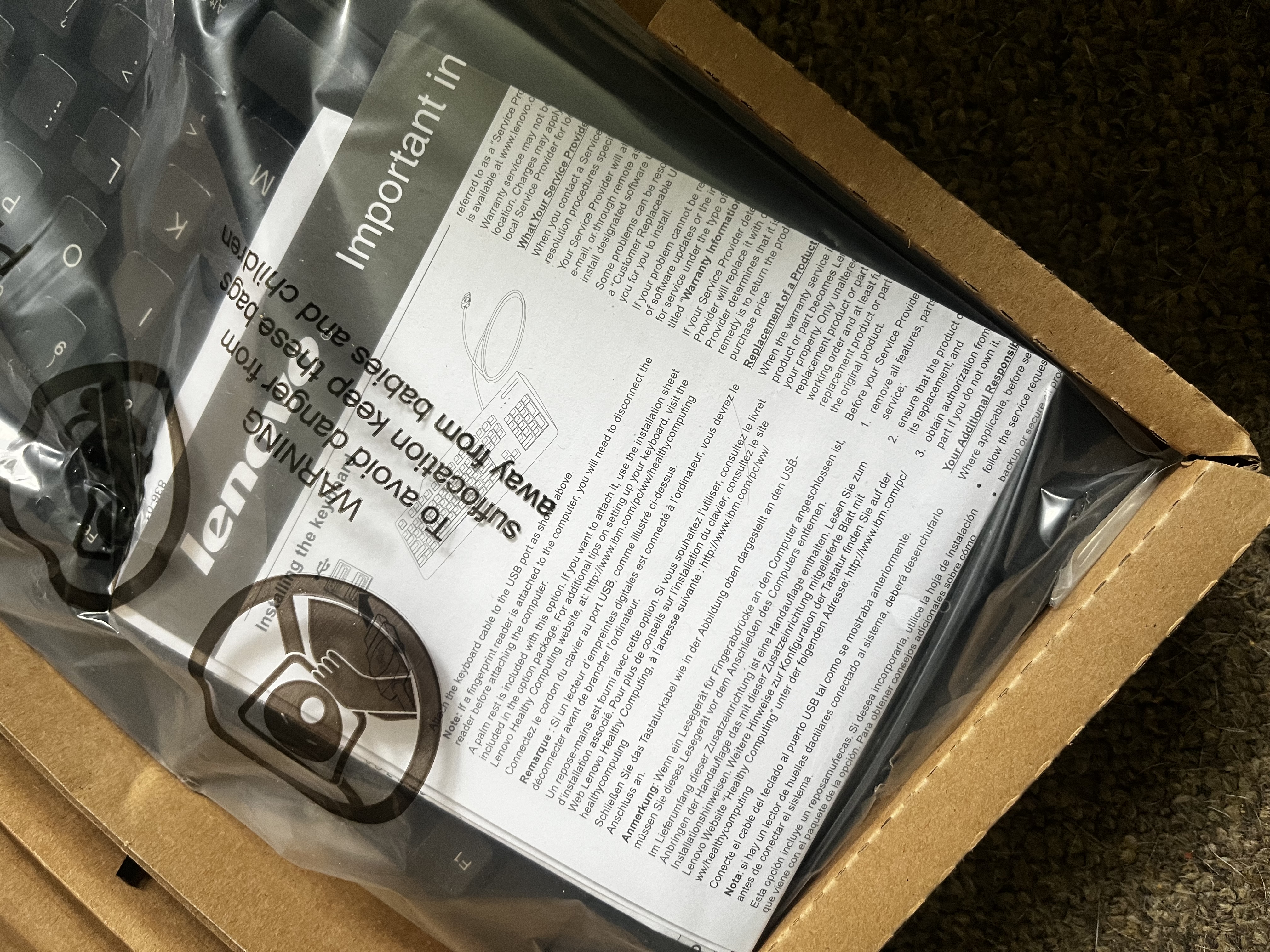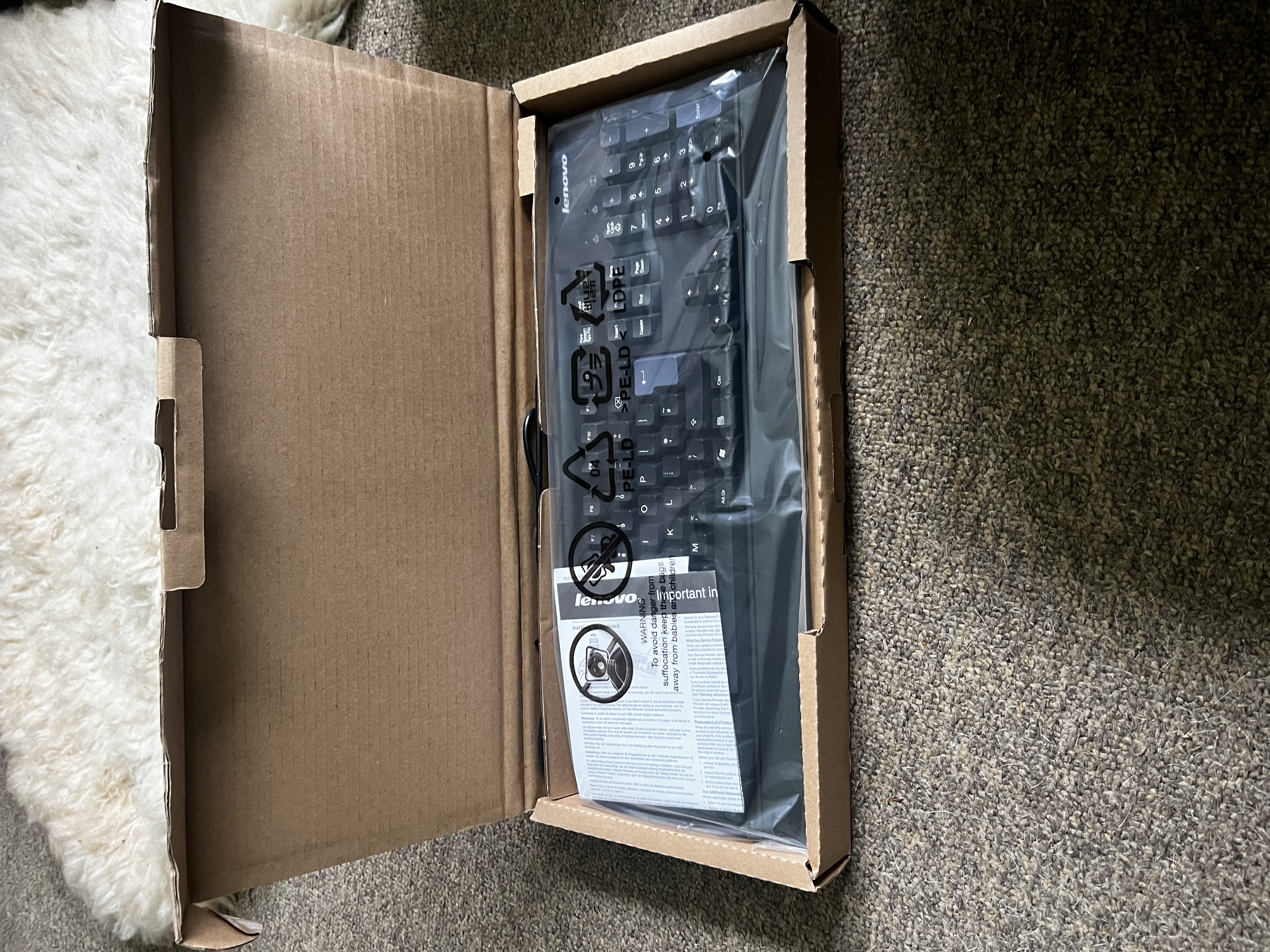 A brand-new full-sized Lenovo wireless keyboard, unopened and in original packaging.