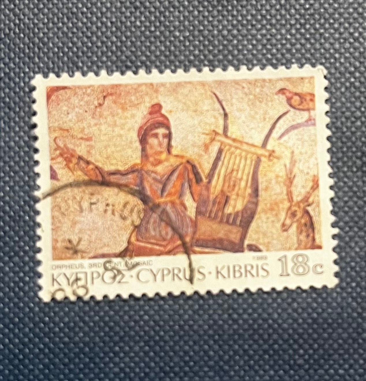 A used postage stamp from Cyprus, issued in 1989, depicting the ‘Paphos Mosaics – Orpheus, 3rd Cent. A.D.’ (SG 764, Mi:CY 738, Sn:CY 745, Yt:CY 736, Un:CY 737). This rectangular, perforated paper stamp features a central image of a robed figure playing a lyre, accompanied by a bird and a deer, consistent with the Orpheus mosaic. Below the central image, the text reads ‘ORPHEUS, 3RD CENT. MOSAIC, ‘ ‘KYΠΡΟΣ, ‘ ‘CYPRUS, ‘ ‘KIBRIS, ‘ along with the year ‘1989’ and a denomination of ’18c.’ A prominent, partial black cancellation mark is visible across the lower left and central areas of the stamp.