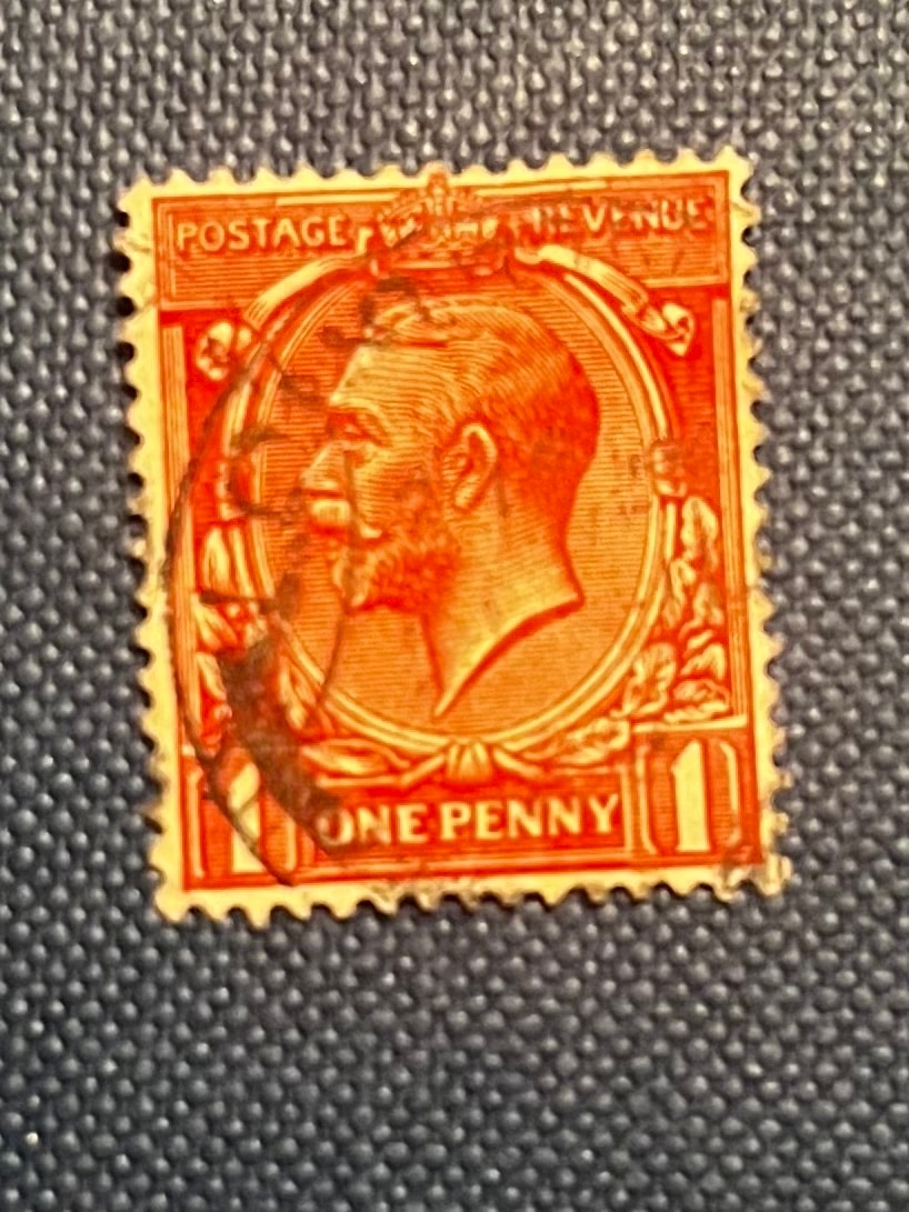 A Great Britain 1912-1913 King George V One Penny Red Postage Revenue stamp, identified by Scott catalogue number 160 or SG 358. This perforated postage stamp is printed in an orange-red hue on paper, featuring a classic engraved profile portrait of a bearded monarch facing left, adorned with a crown. Inscriptions include “POSTAGE” at the top left, “REVENUE” at the top right, “ONE PENNY” at the bottom left, and the numeral “1” at the bottom right. The stamp is visibly used.