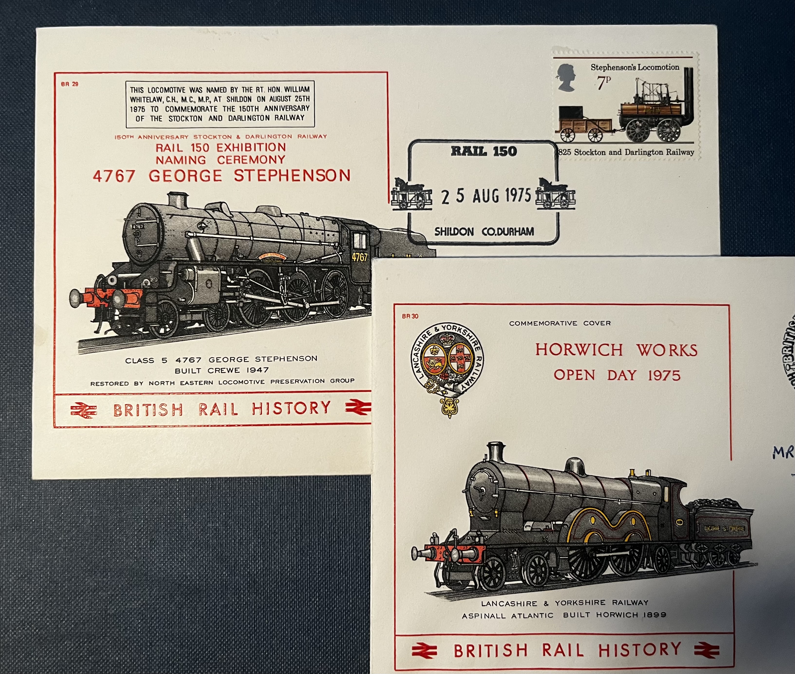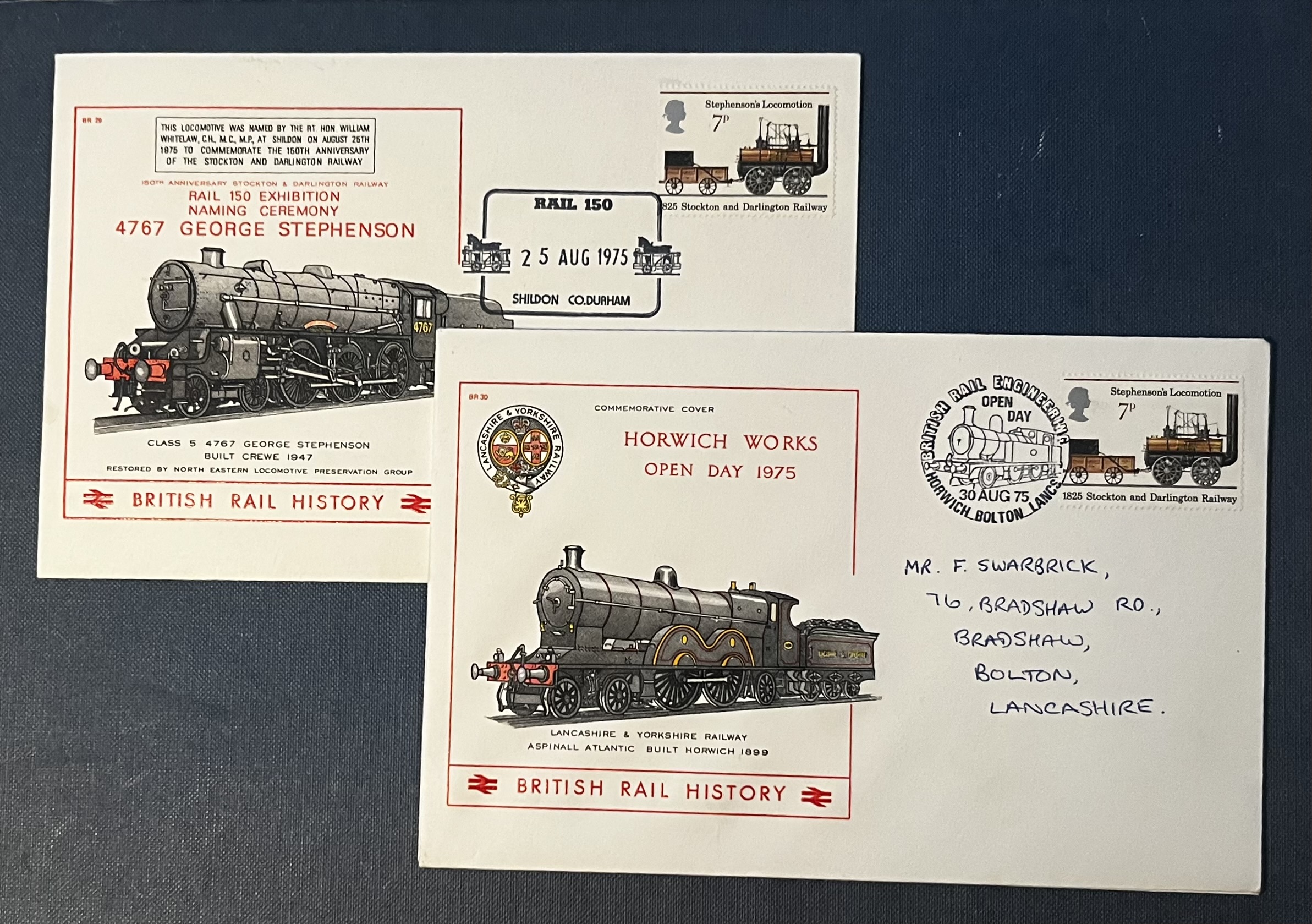 A pair of 1975 railway-themed commemorative covers marking significant events in British rail history. The first celebrates the naming of locomotive 4767 “George Stephenson” at Shildon, County Durham on 25 August 1975, part of the Rail 150 Exhibition commemorating the 150th anniversary of the Stockton and Darlington Railway. The second cover marks the Horwich Works Open Day held on 30 August 1975.