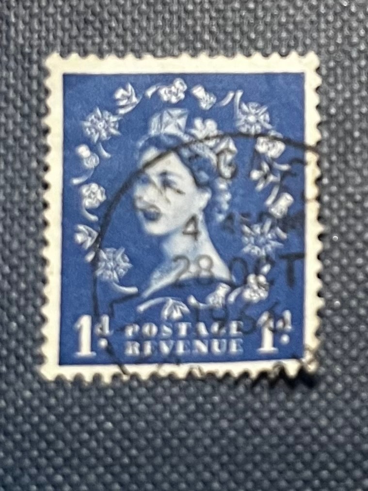 A single blue and white perforated postage stamp features a profile portrait of Queen Elizabeth II surrounded by a wreath, marked “1d POSTAGE REVENUE 1d” and bears a partial black cancellation postmark.