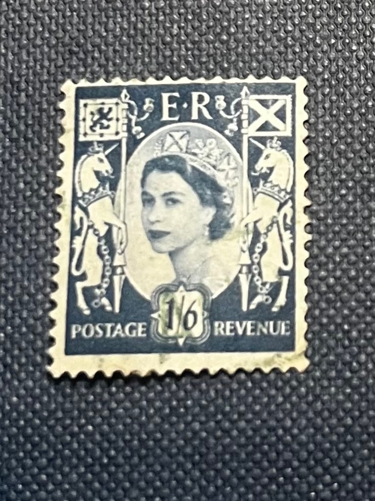 A monochromatic dark blue/black and off-white Wilding series postage stamp featuring Queen Elizabeth II, two unicorns, “E R”, “POSTAGE”, “REVENUE”, and a value of “1/6”.