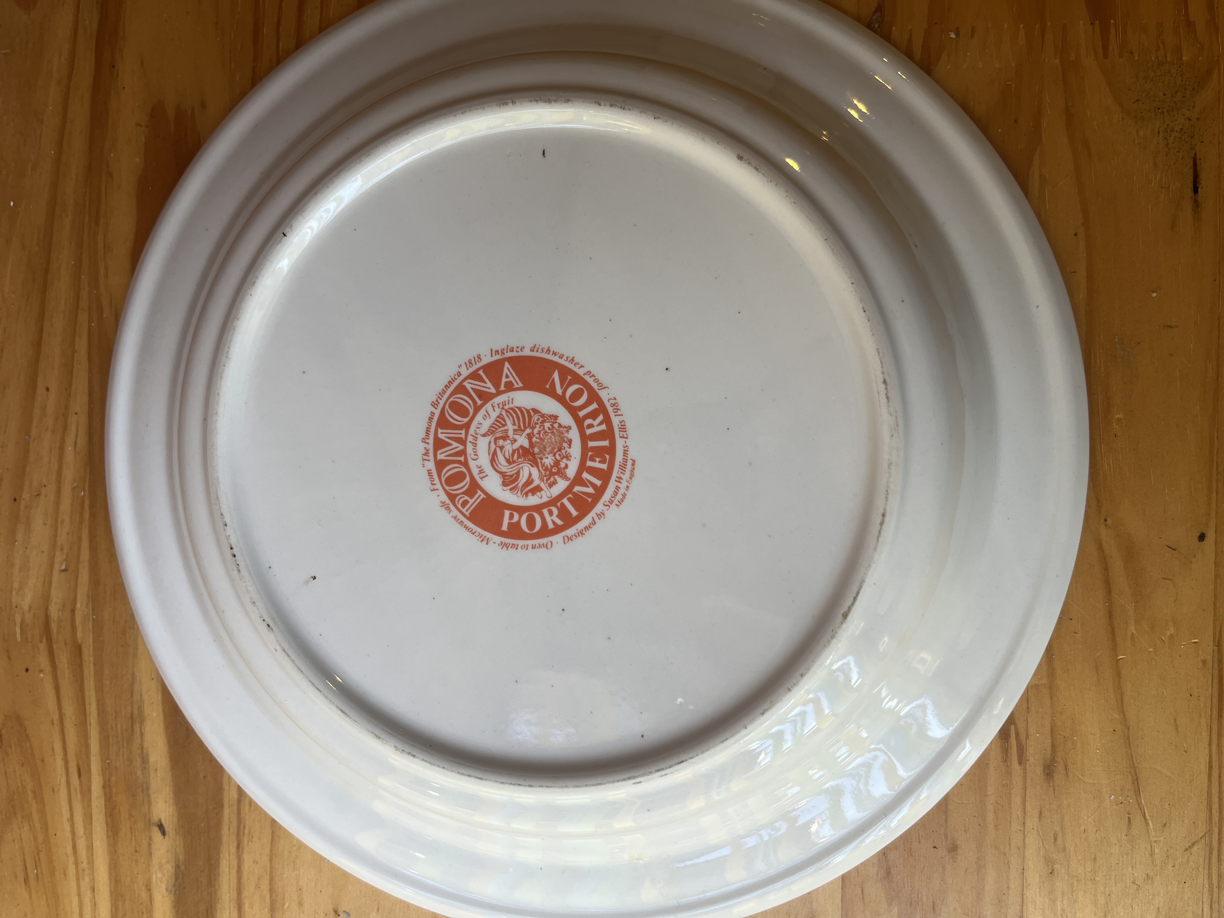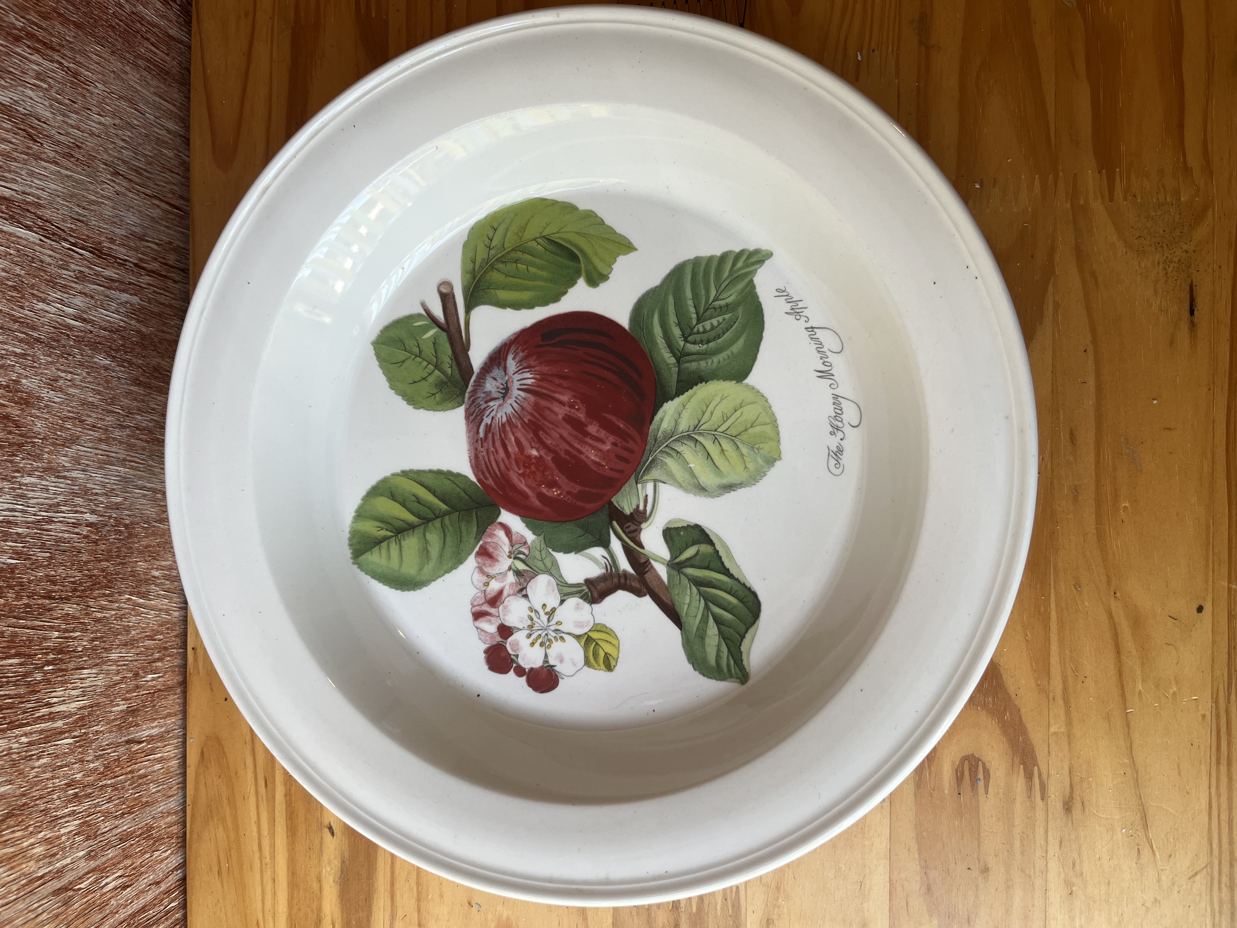 part of the popular Pomona collection designed by Susan Williams-Ellis in 1982. This particular piece features a vibrant botanical illustration of the Hoary Morning apple, complete with leaves and blossoms.
