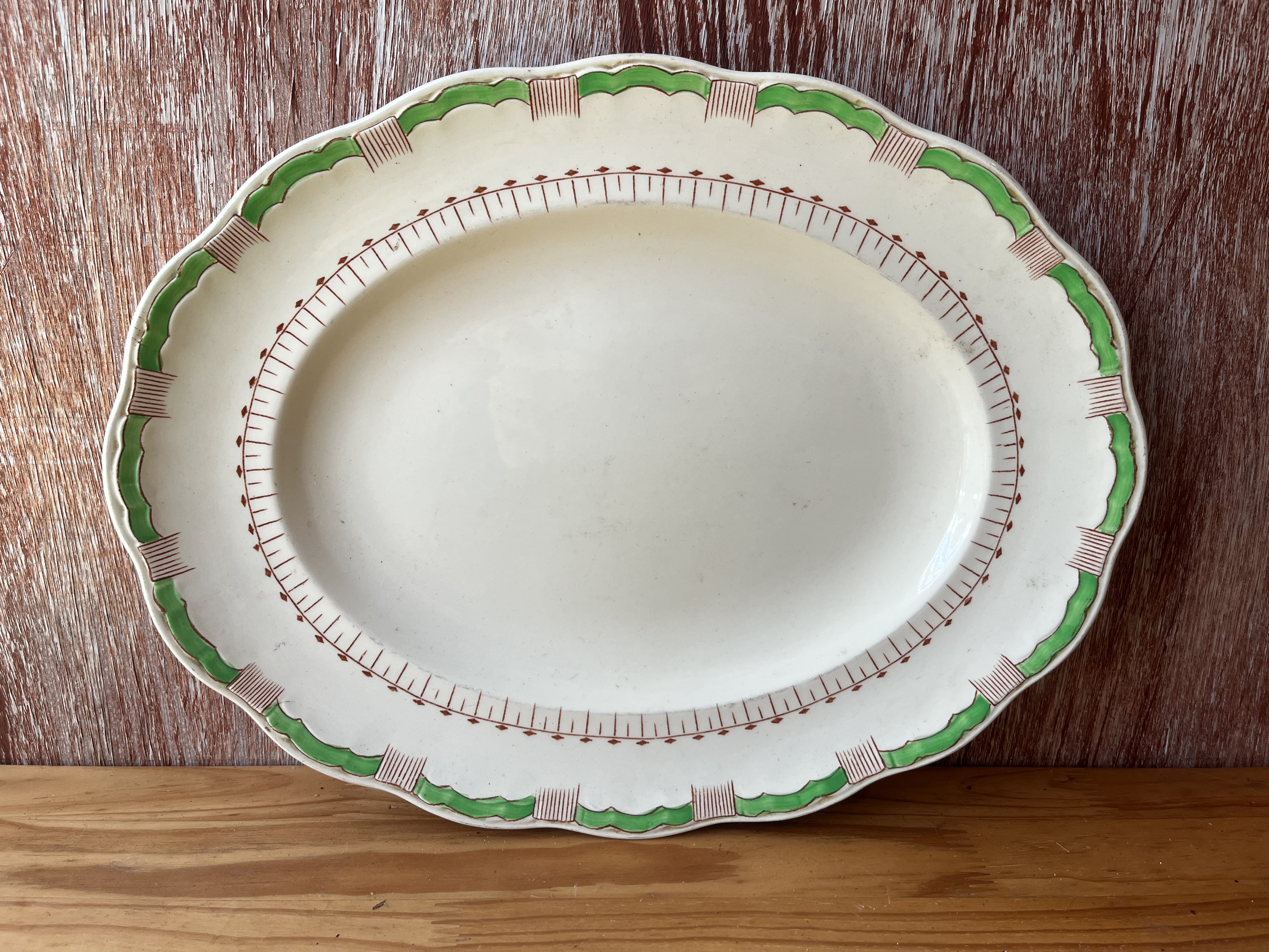 The platter features a scalloped edge with a green and brown (or reddish-pink) pattern, often including floral elements like roses or marigolds