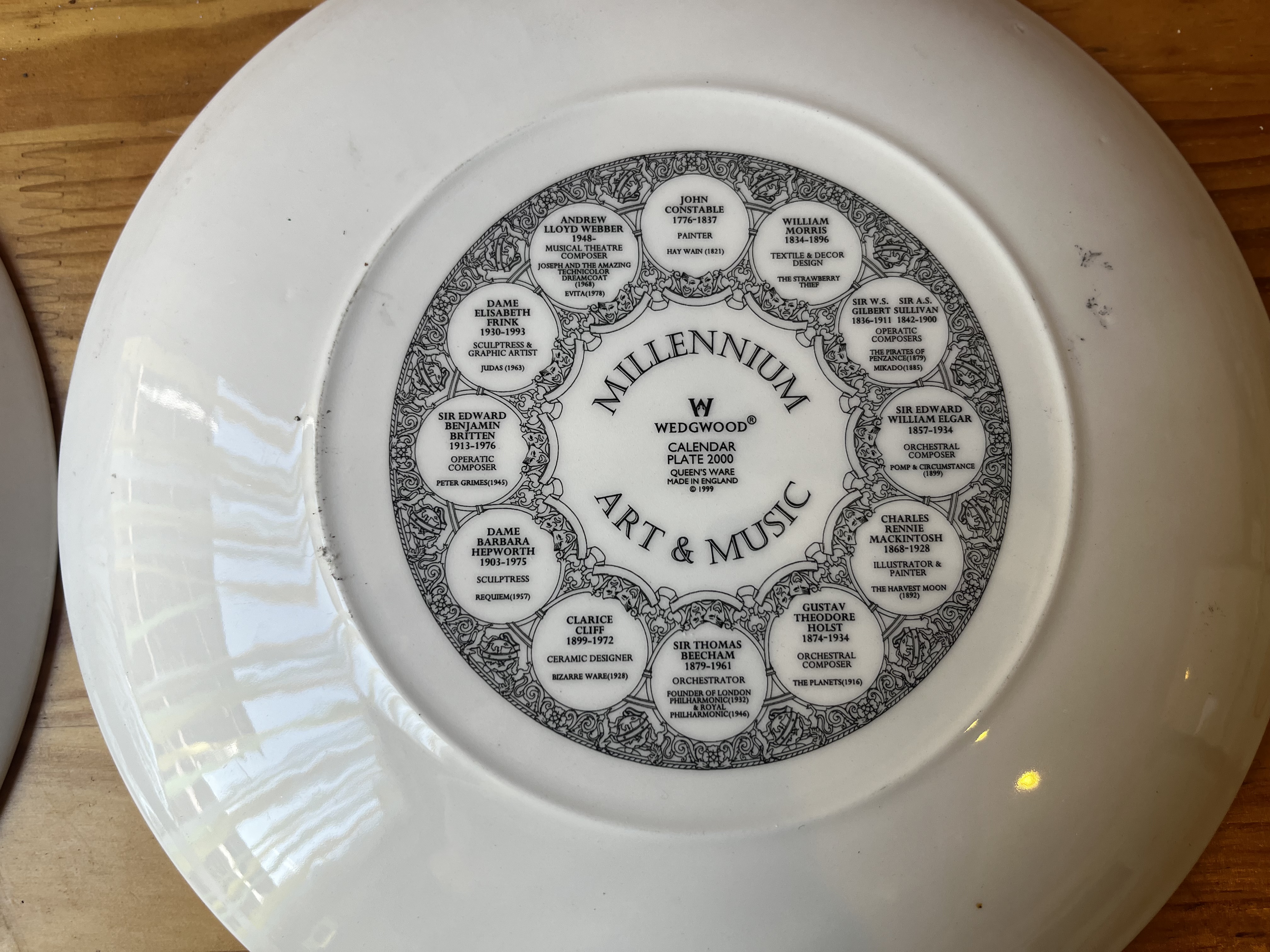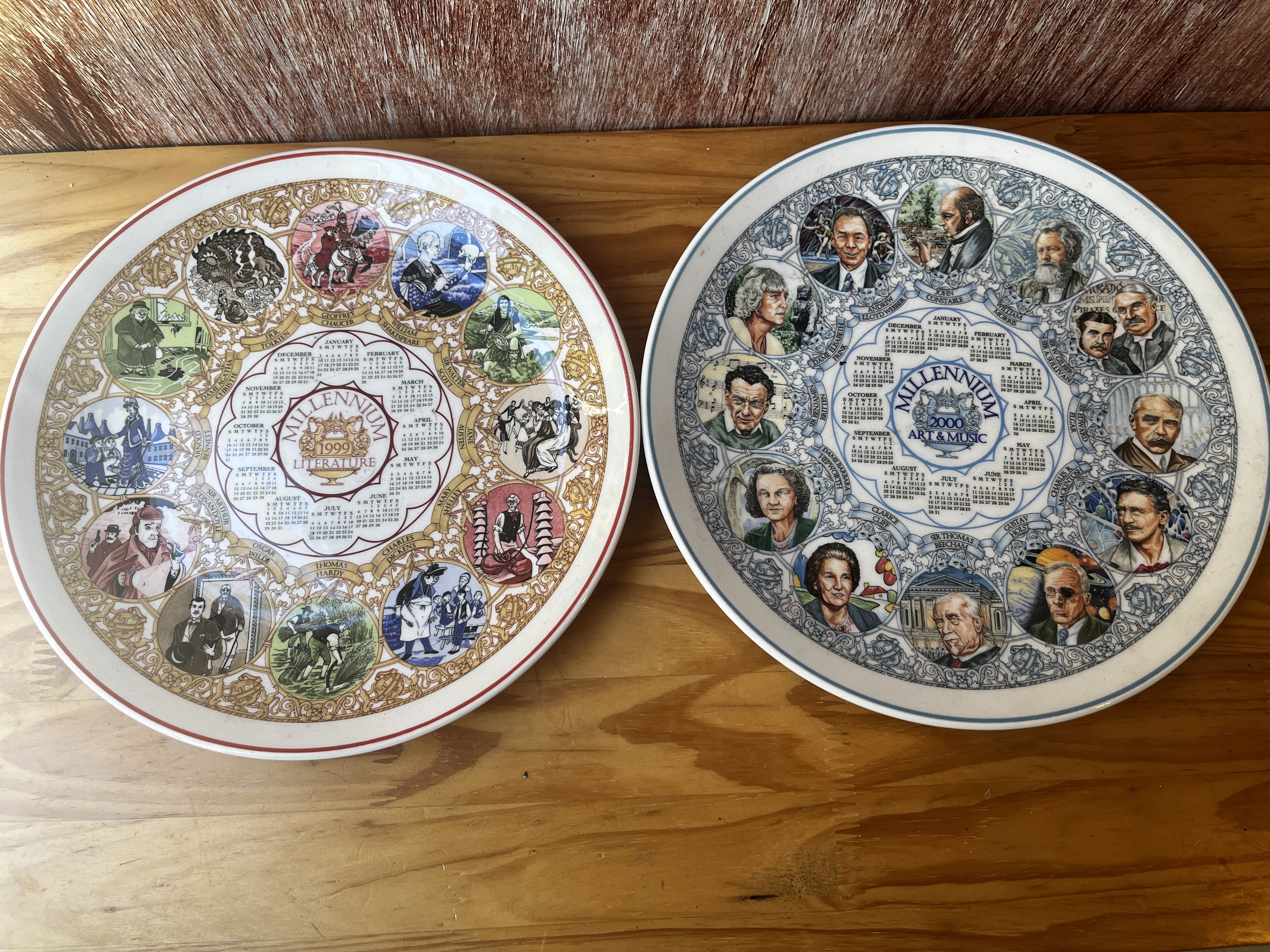 Second Plate: Displays the 2000 Millennium Art & Music theme. This plate depicts portraits of influential figures in art and music from the 20th century, surrounded by a calendar for the year 2000.