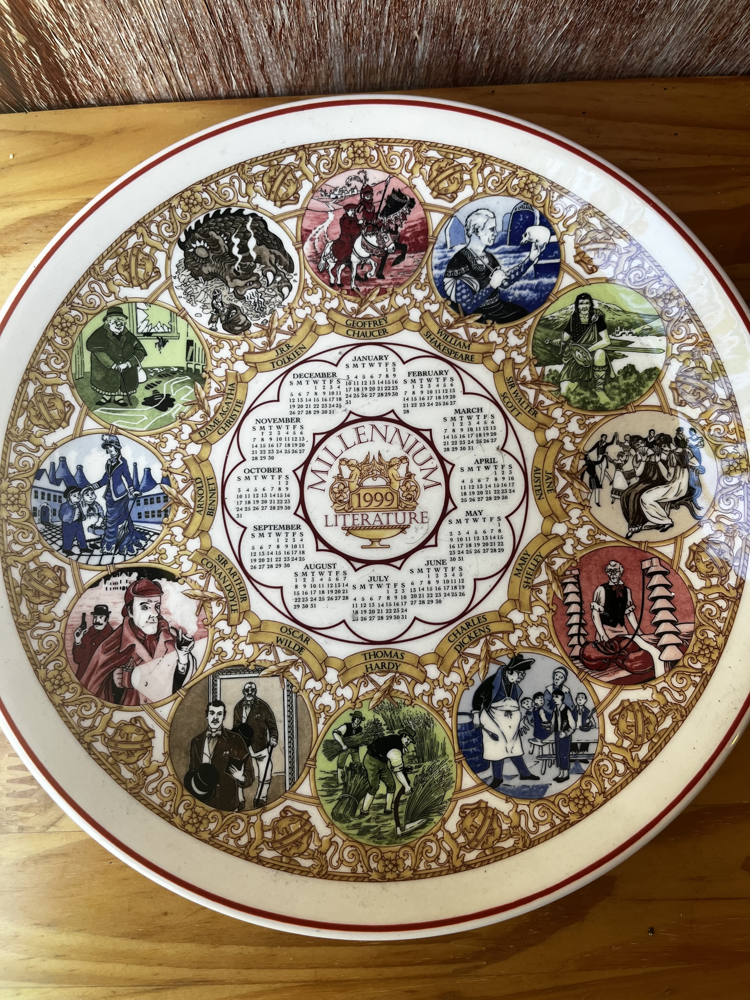 Features the 1999 Millennium Literature theme. This plate showcases famous British authors and a calendar for the year 1999.