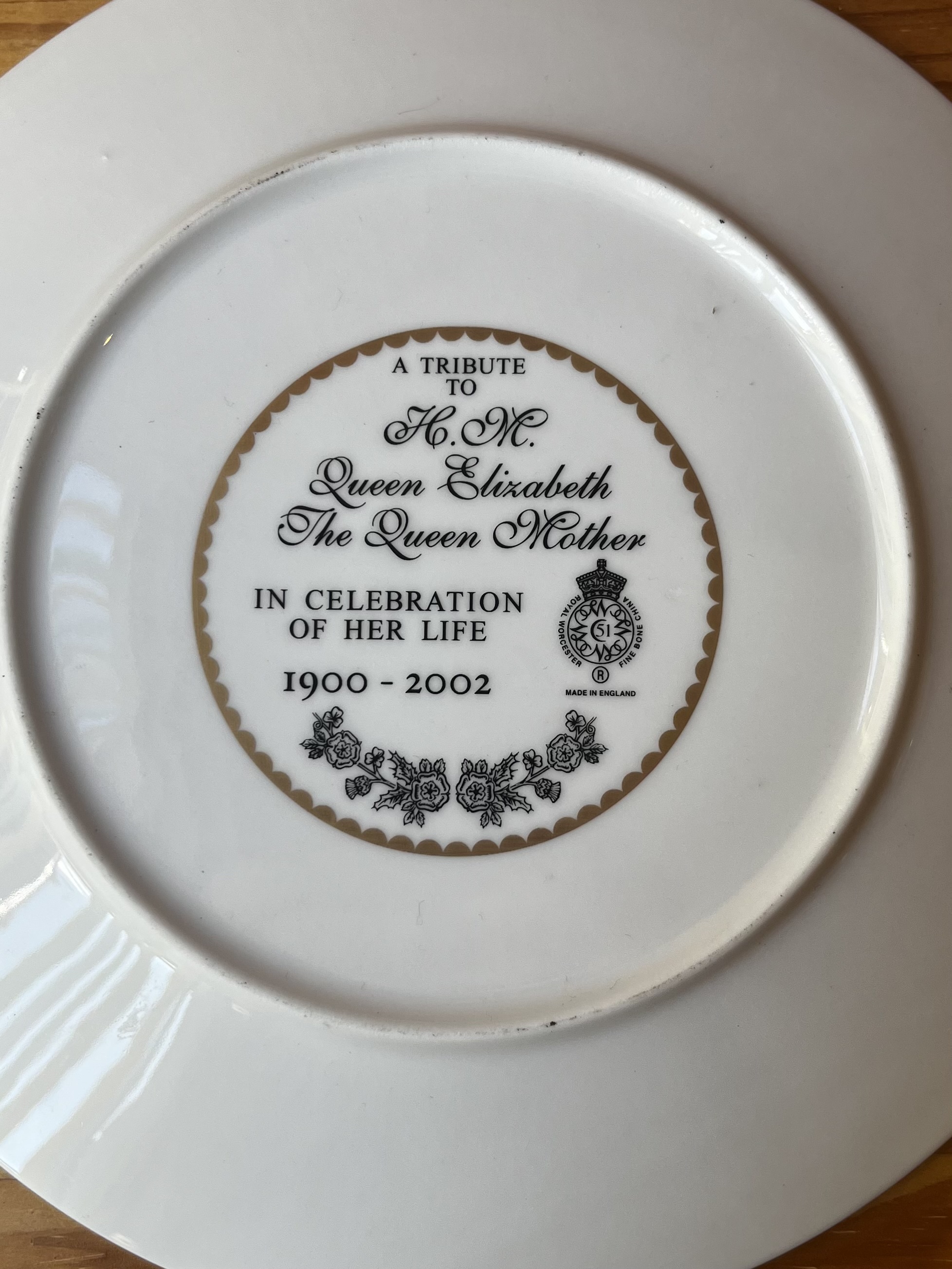 Large commemorative plate honoring H.M. Queen Elizabeth The Queen Mother