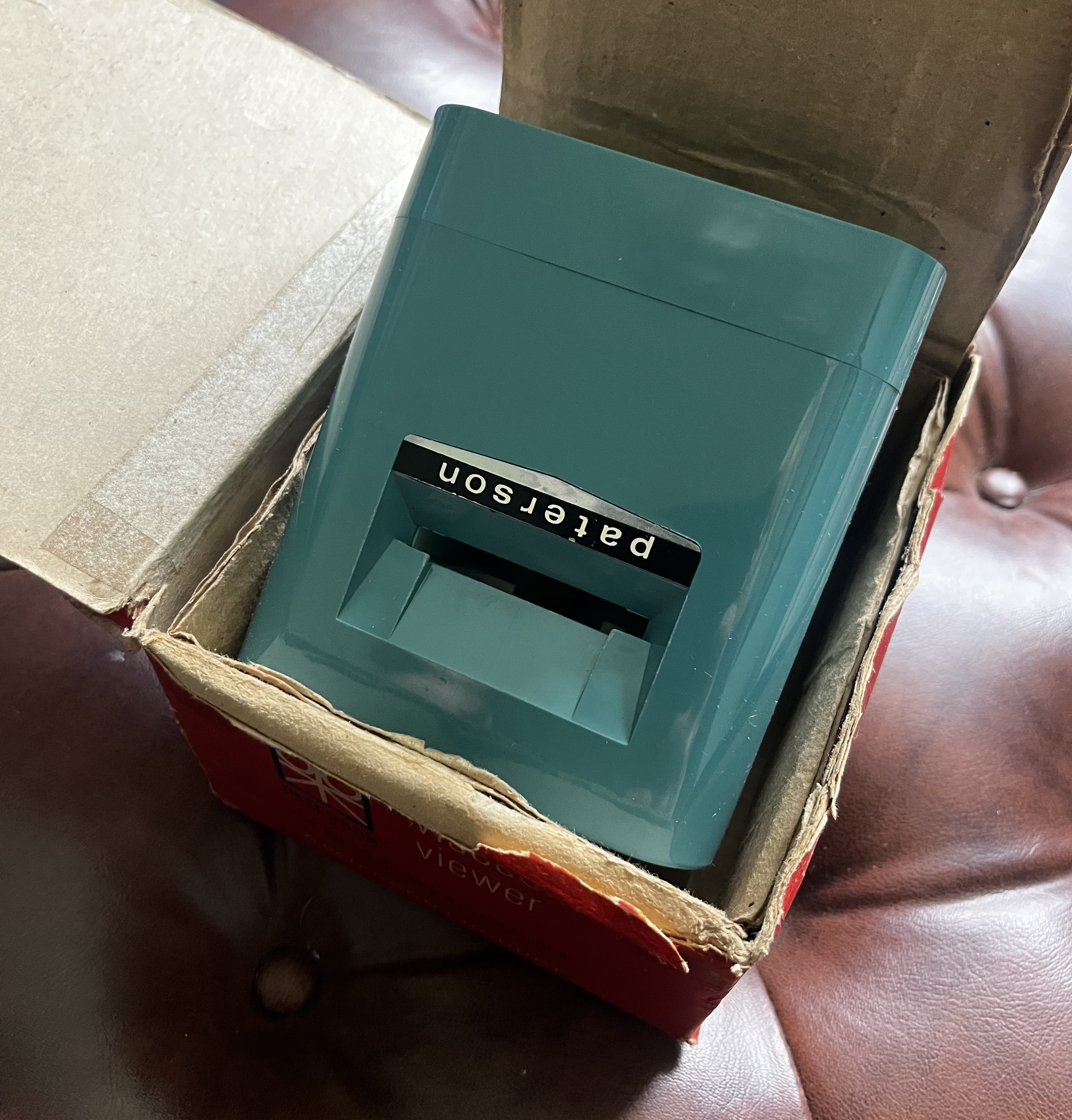 A vintage Patterson Viscount slide viewer, complete with its original packaging: