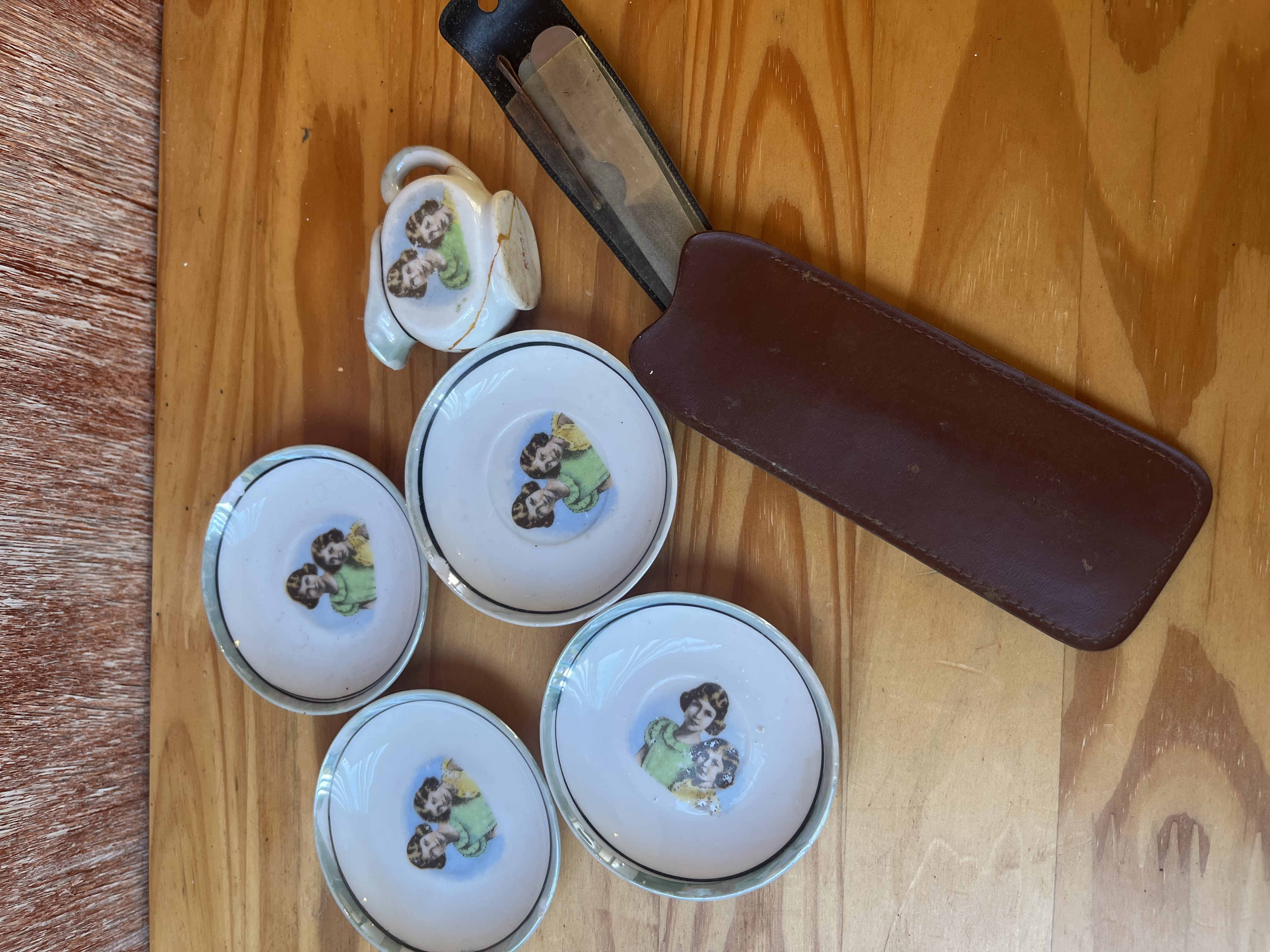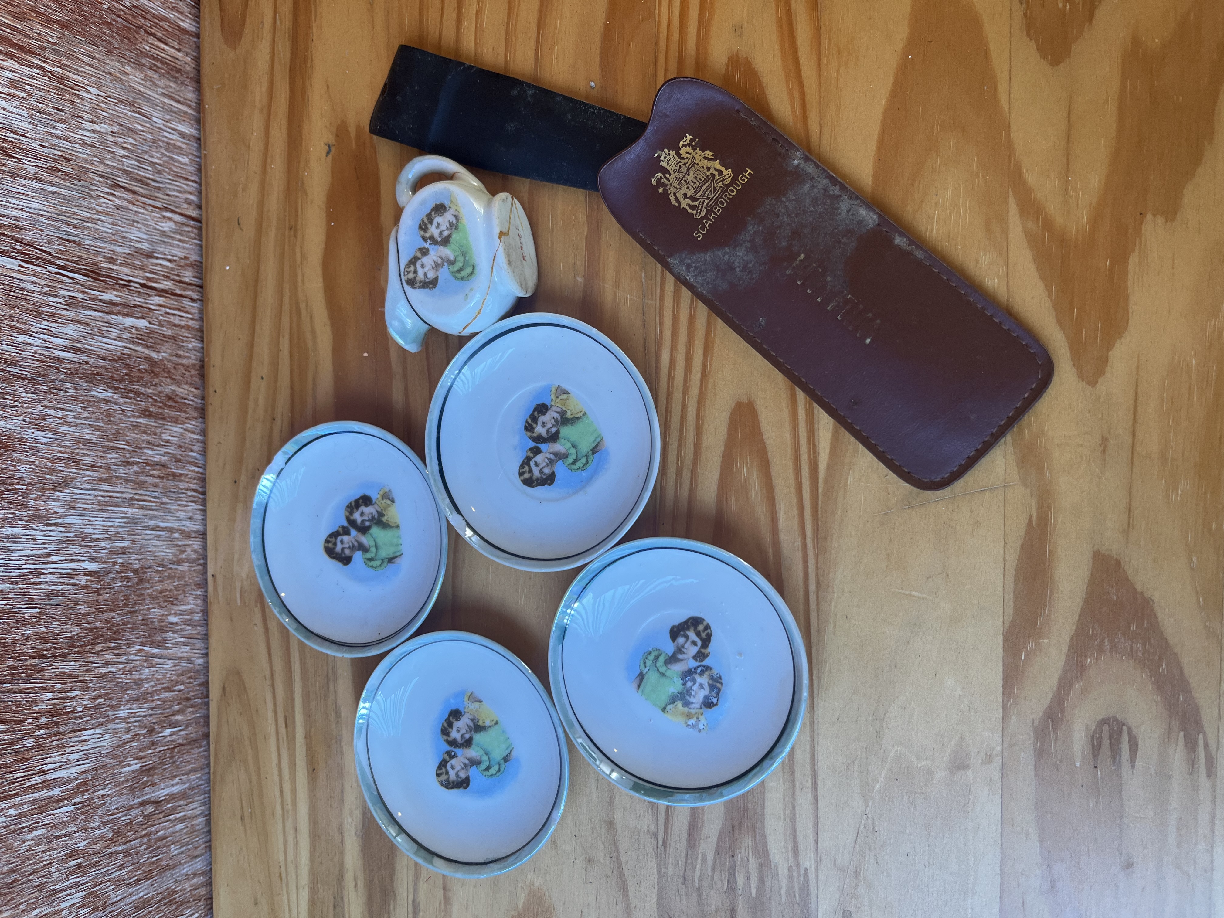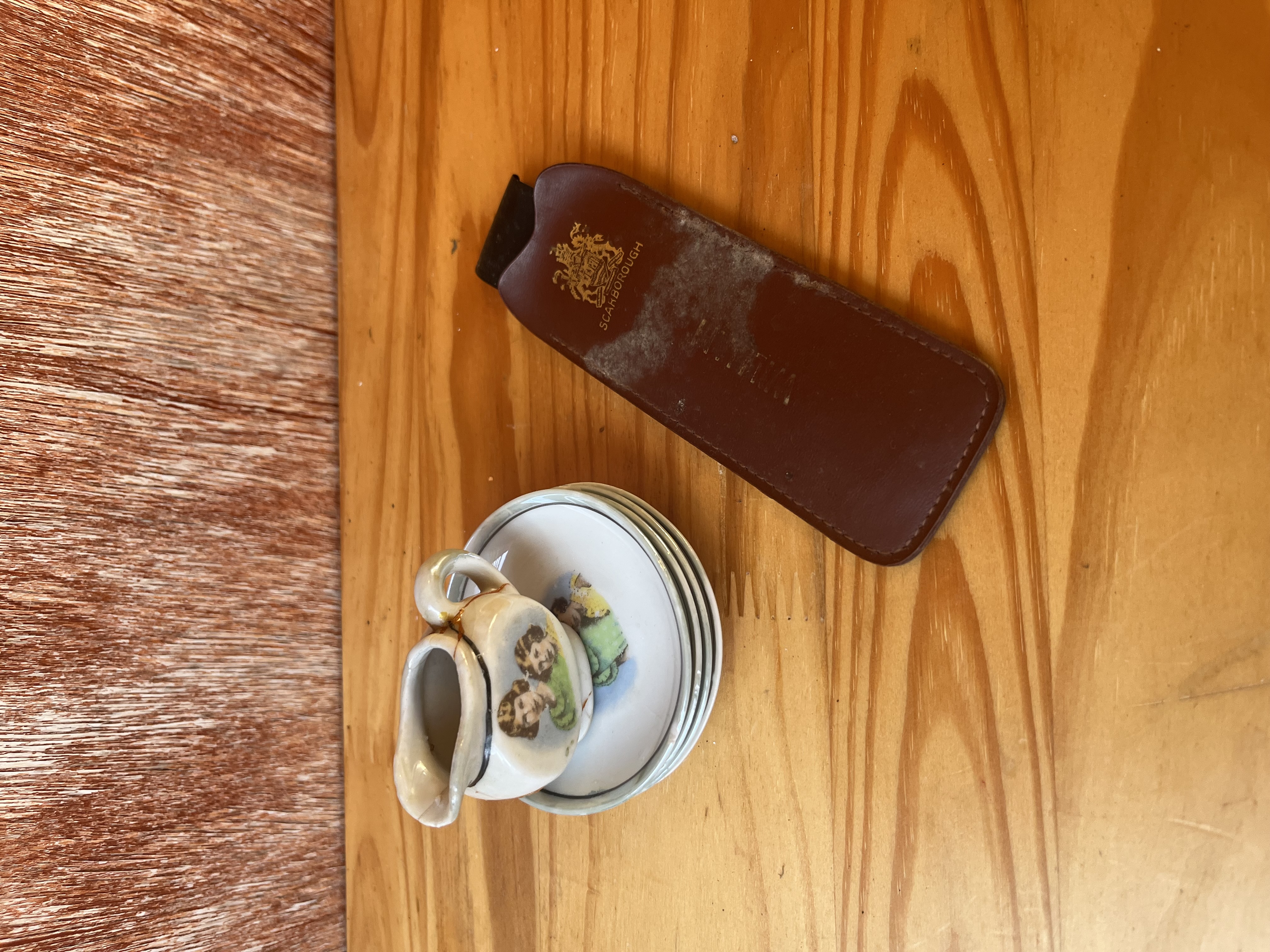 Mini part commutative child’s tea set and vintage nail file in leather pouch with royal warrant stamped in gold