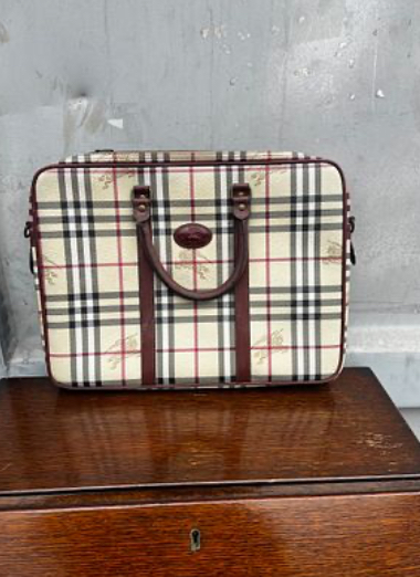 A classic piece from Burberry, this vintage laptop bag showcases the iconic Nova Check pattern in beige, black, red, and white, accented with high-quality leather trims and handles in a complementary tone, likely brown or burgundy. Crafted from Novacheck coated canvas with leather accents, this bag combines durability with timeless Burberry style.
