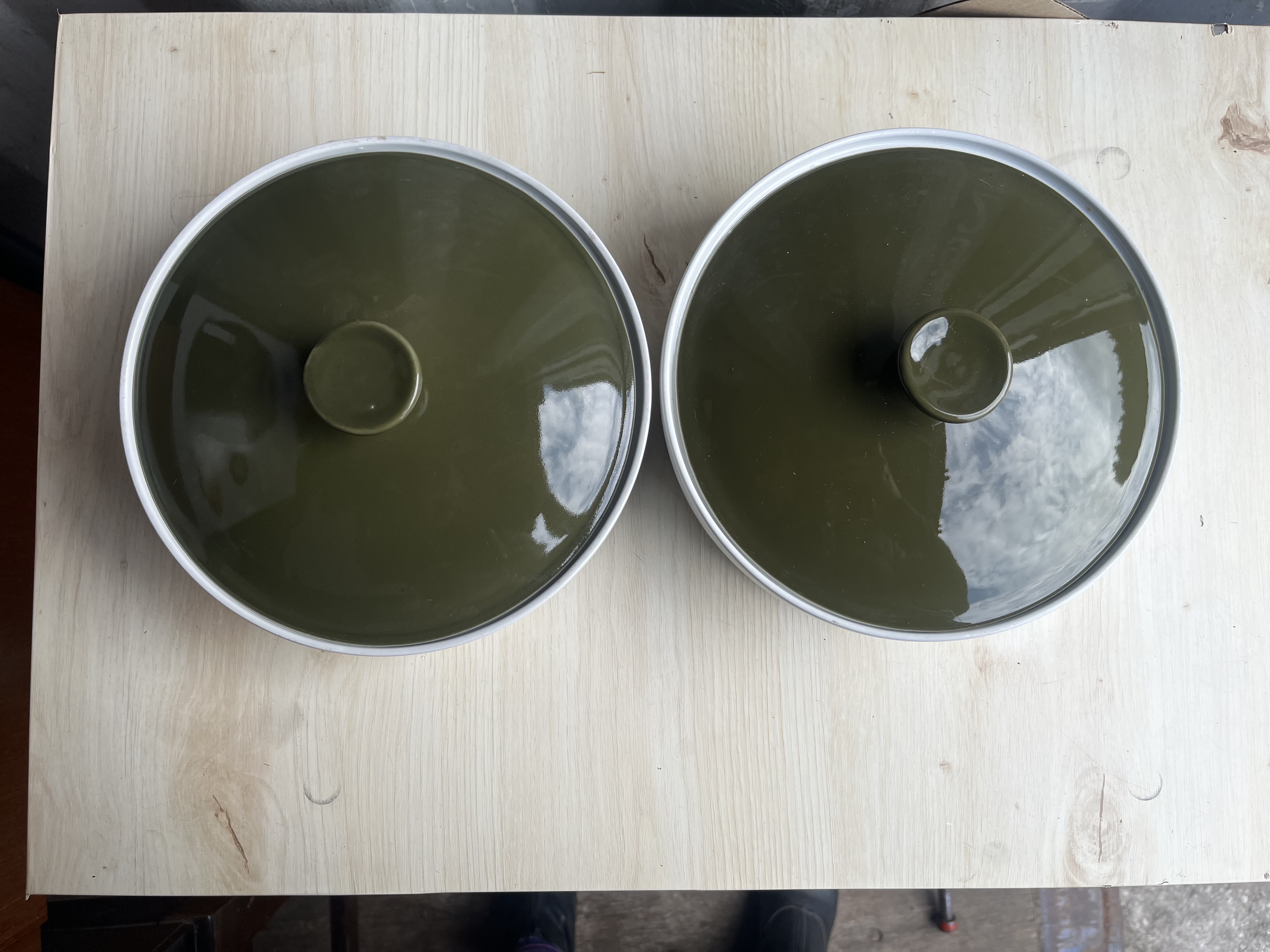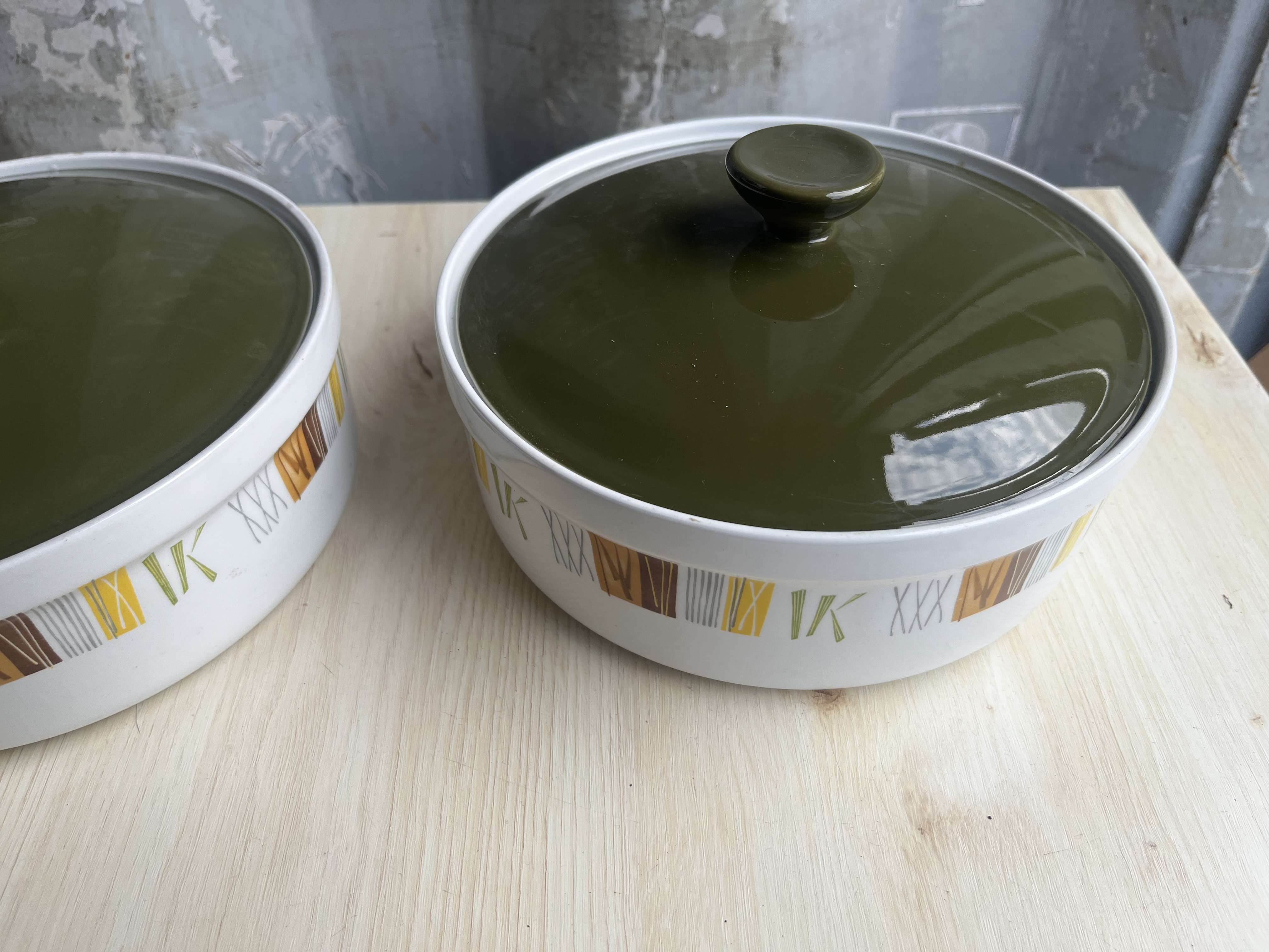 A matching pair of vintage lidded casserole dishes by Alfred Meakin, produced in the sought-after Glow-White range: