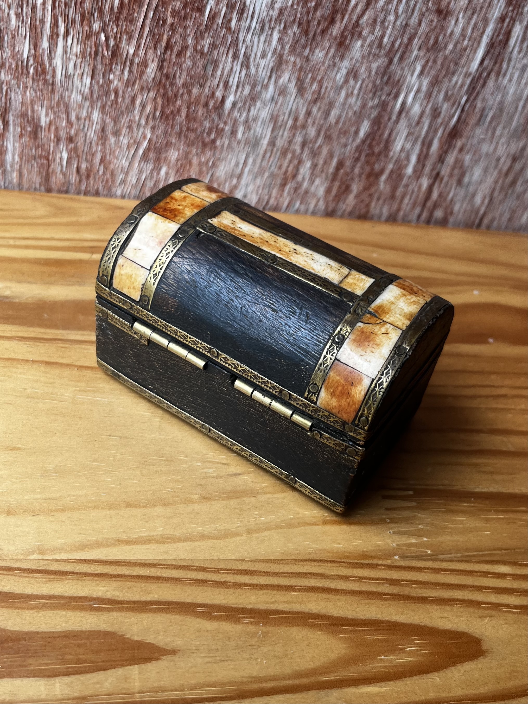 A finely hand-crafted vintage trinket or jewellery box, originating from India and made for C.G.B. The box is constructed from bone panels with ornate brass detailing, including decorative inlay work and clasp fittings. Designed to hold small keepsakes, jewellery, or other precious items, it displays the traditional craftsmanship for which Indian artisans are renowned. The underside bears a label stating “Hand Crafted in India for C.G.B.”