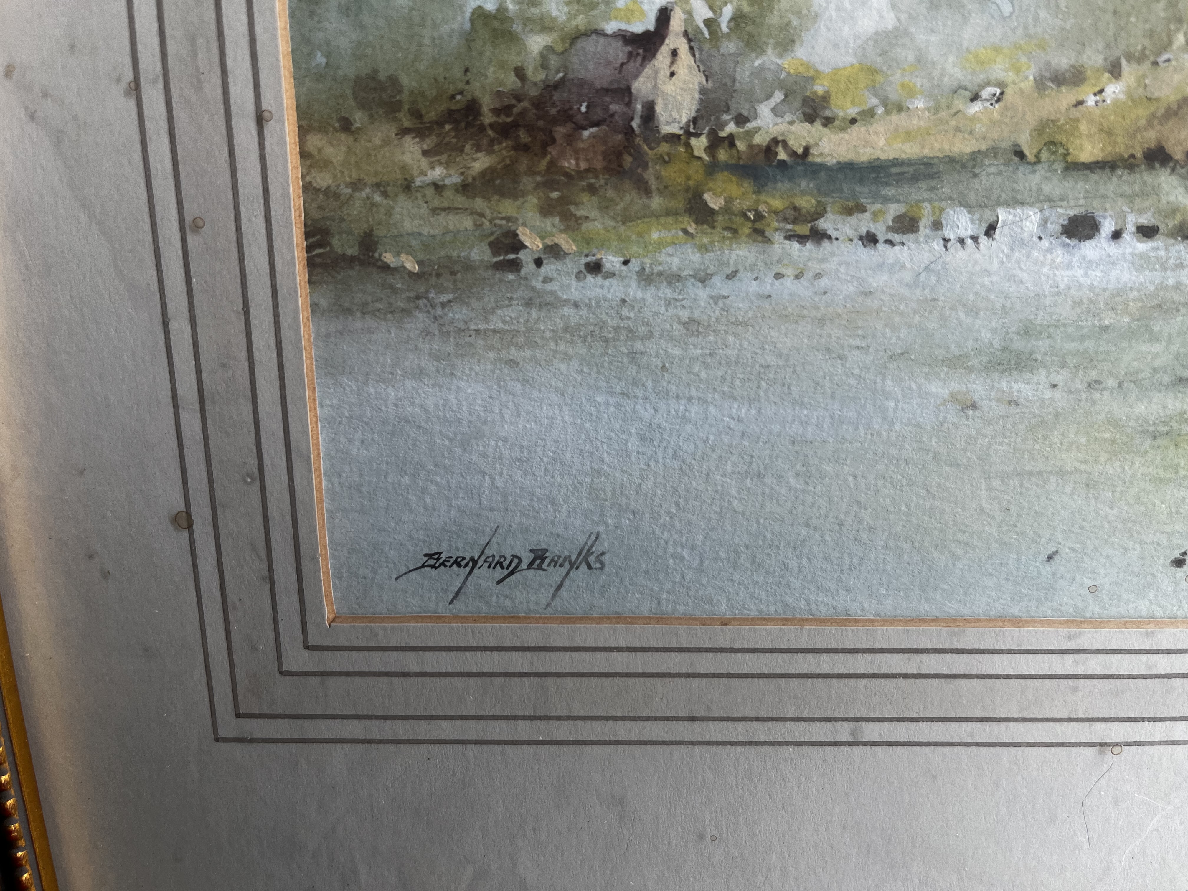 A charming original watercolour painting signed Bernard Franks, depicting a tranquil countryside scene featuring a small cottage beside a calm river or lake, framed by trees and gentle hills in the distance. The artist’s signature appears clearly in the lower left corner.