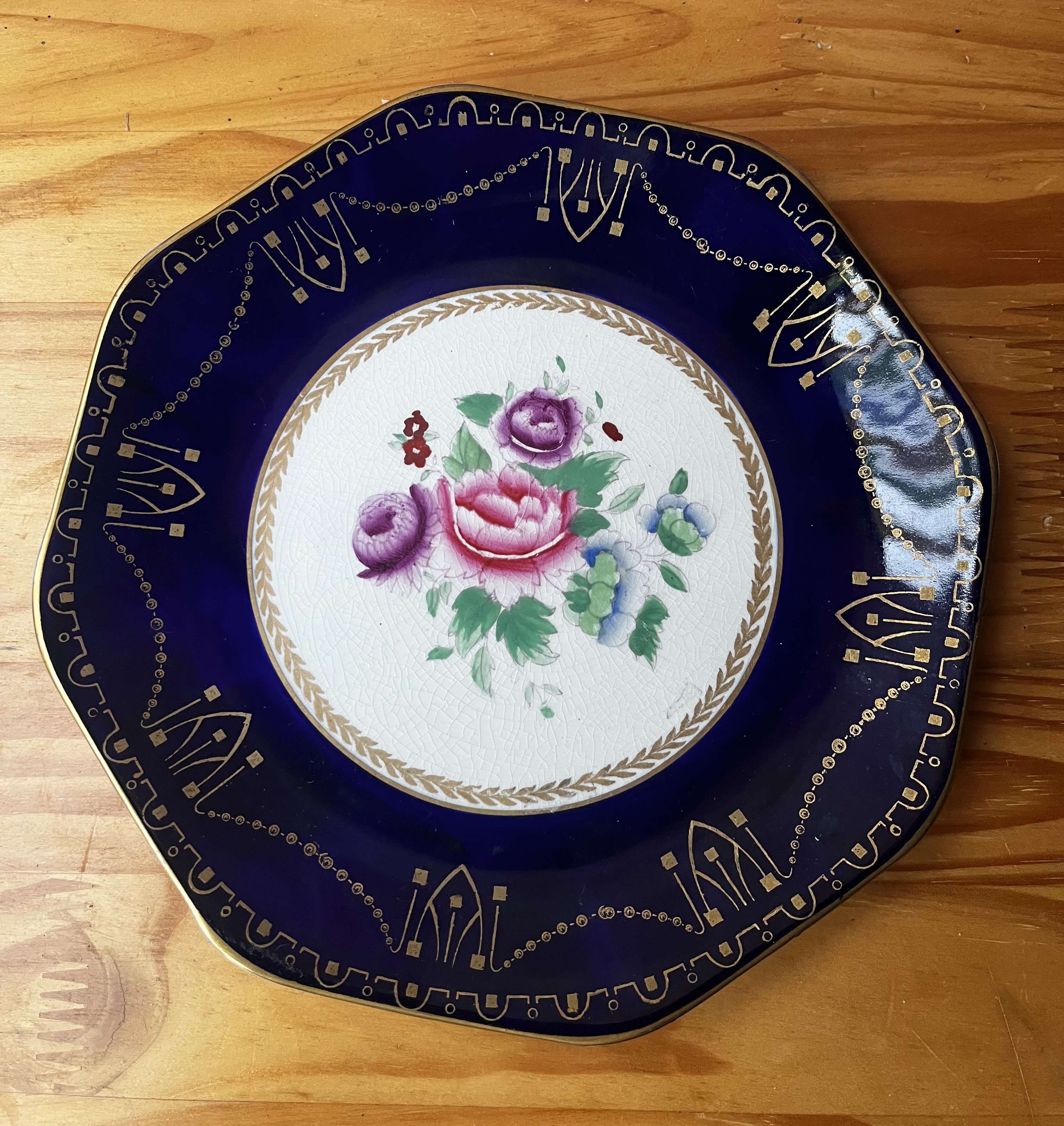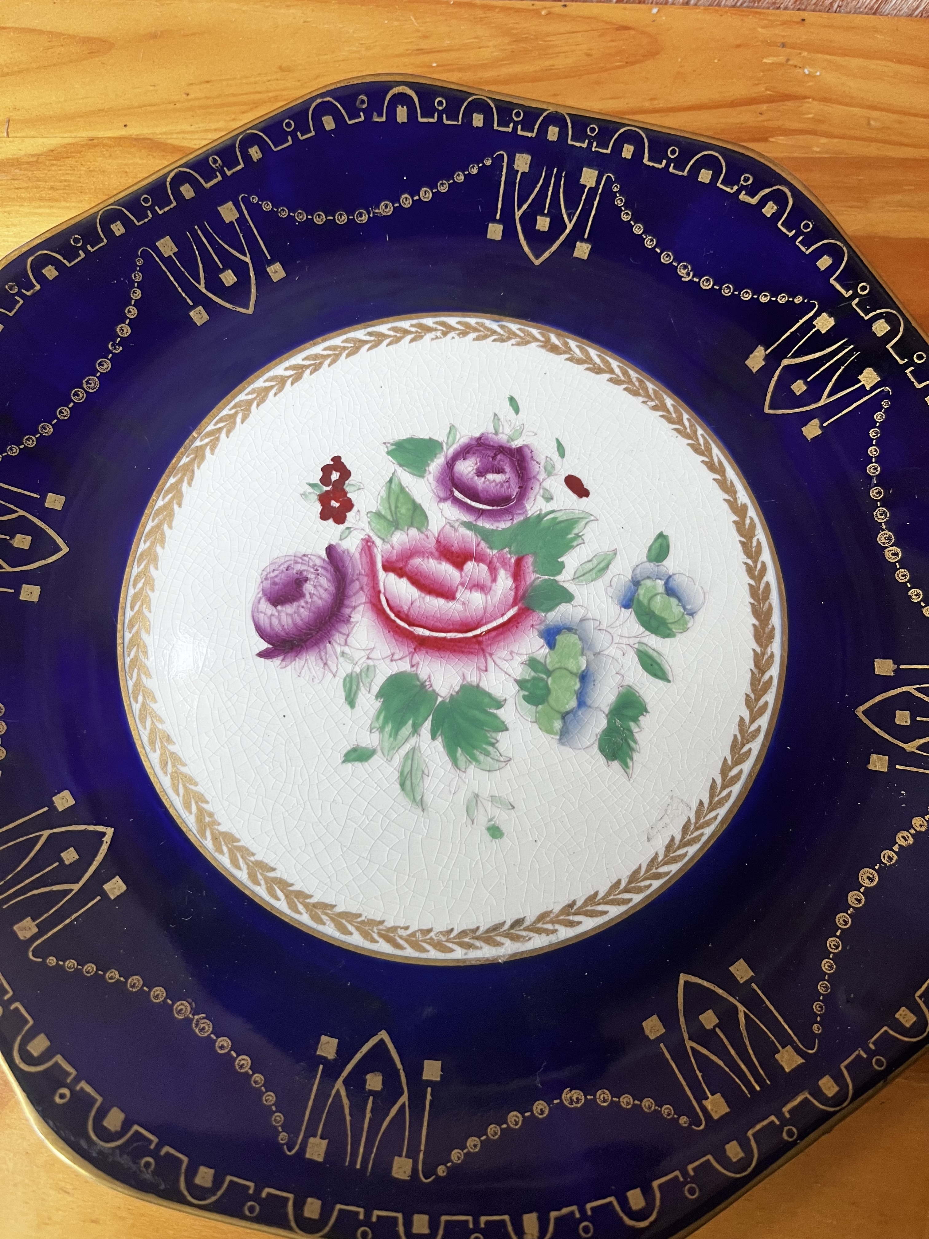 cobalt blue with intricate gold gilt scrollwork on the rim