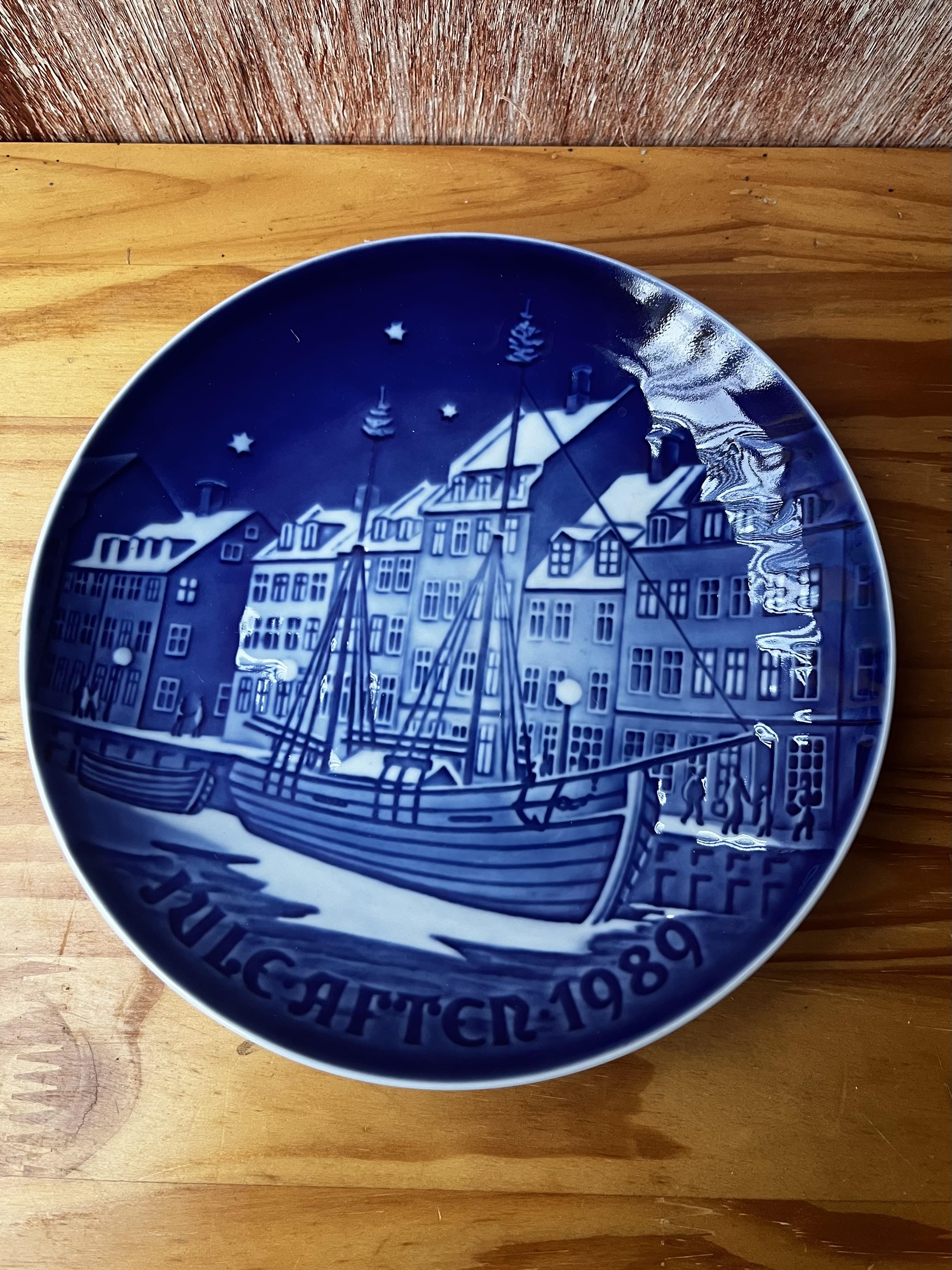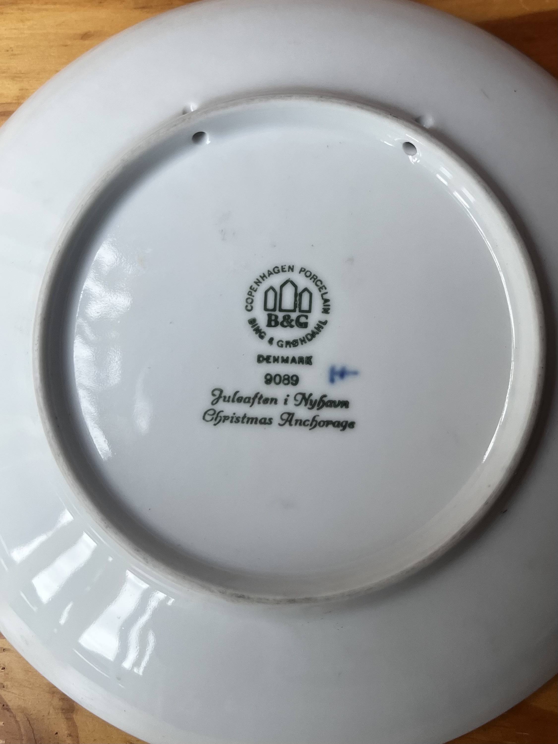 A charming vintage Danish porcelain collector’s plate by Bing & Grøndahl, dated 1977 and titled “Juleaften i Nyhavn” (translated as “Christmas Anchorage”). This piece forms part of the company’s iconic annual Christmas plate series, first introduced in 1895 and cherished by collectors worldwide.