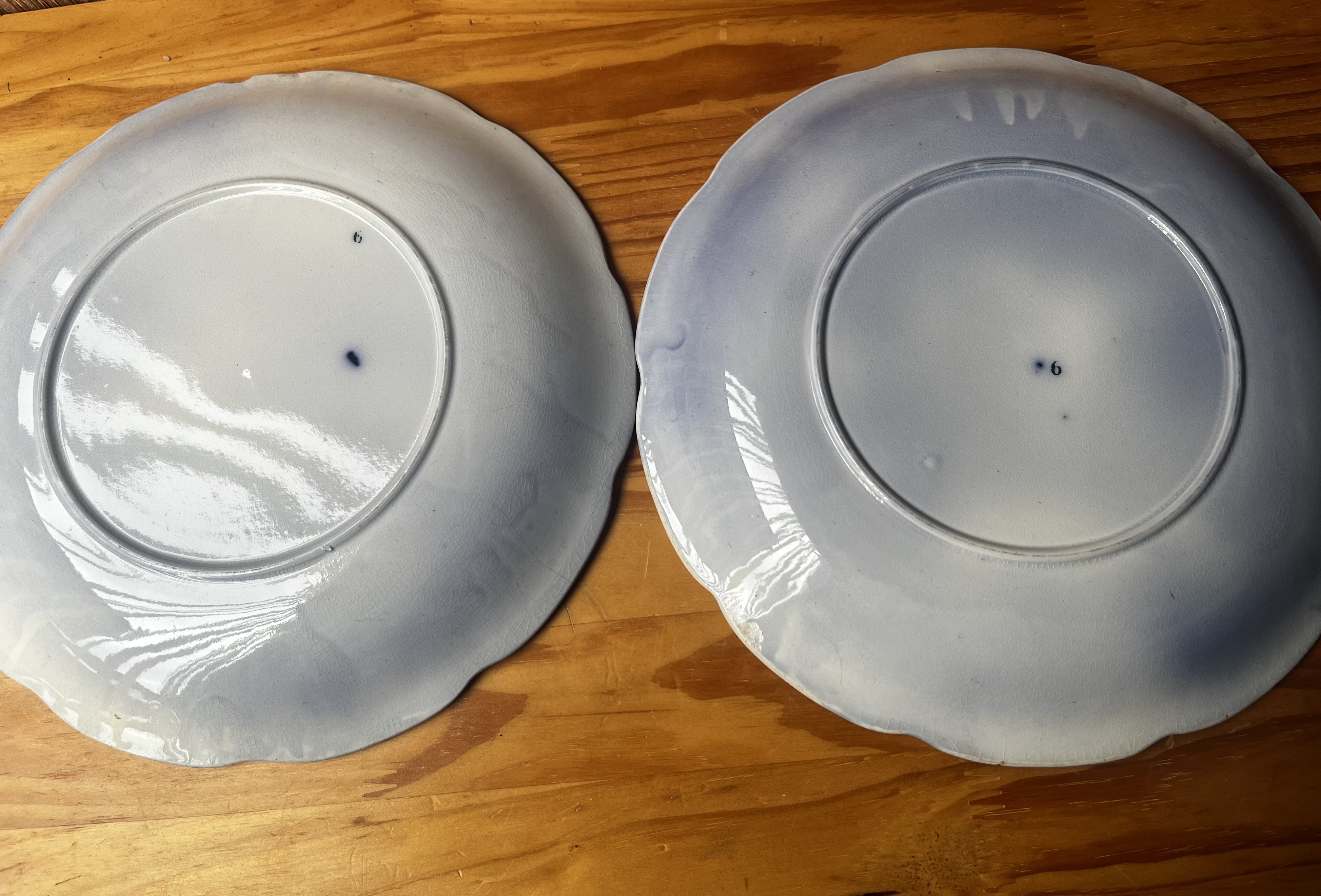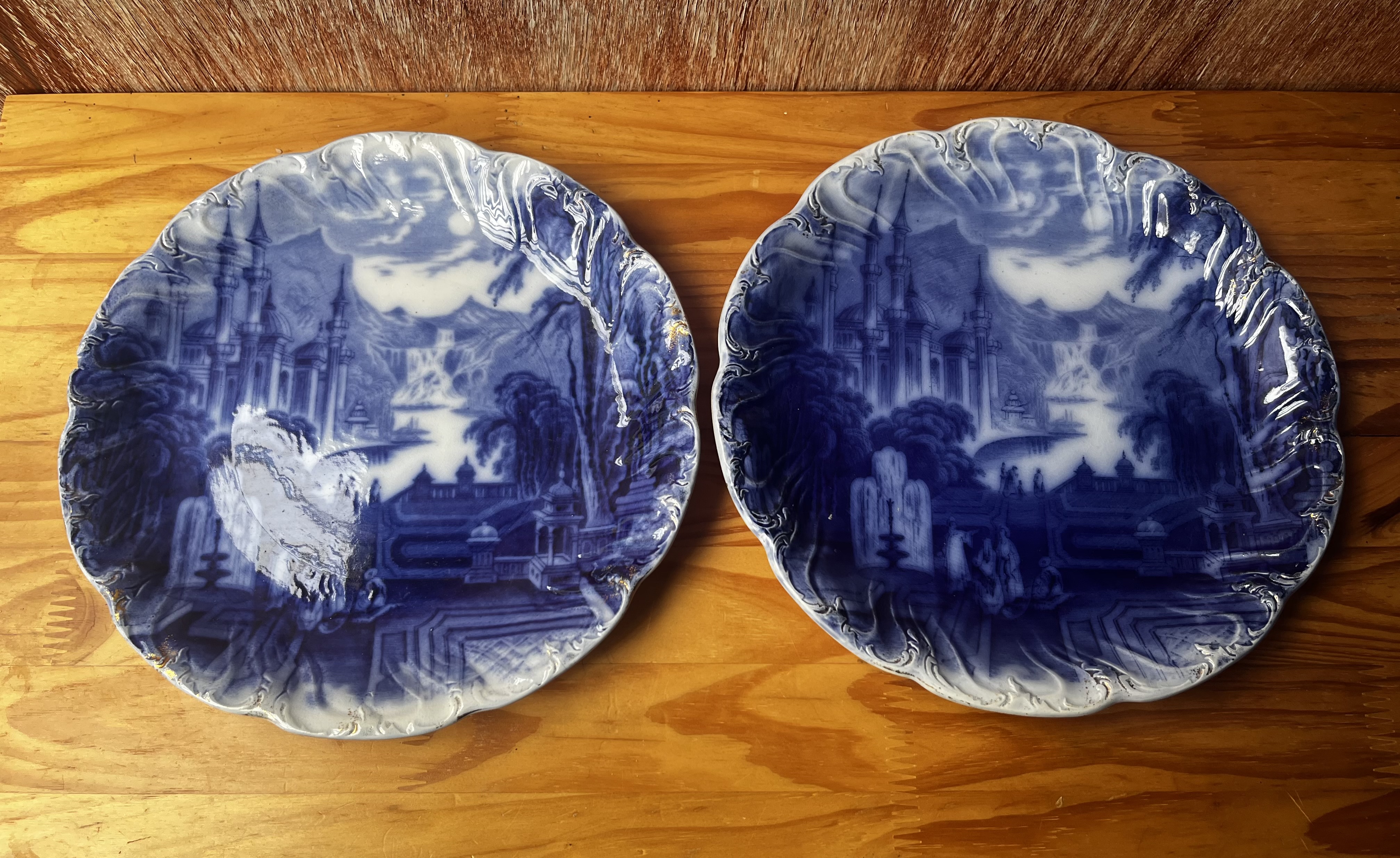 A striking pair of antique Flow Blue plates, featuring a detailed Moorish castle and lake scene, commonly referred to as “Old Istanbul” or “Romantic Blue Mosque Medina” designs. Produced in the Victorian era, Flow Blue transferware is renowned for its characteristic blurred cobalt-blue decoration, achieved through a unique glazing process.