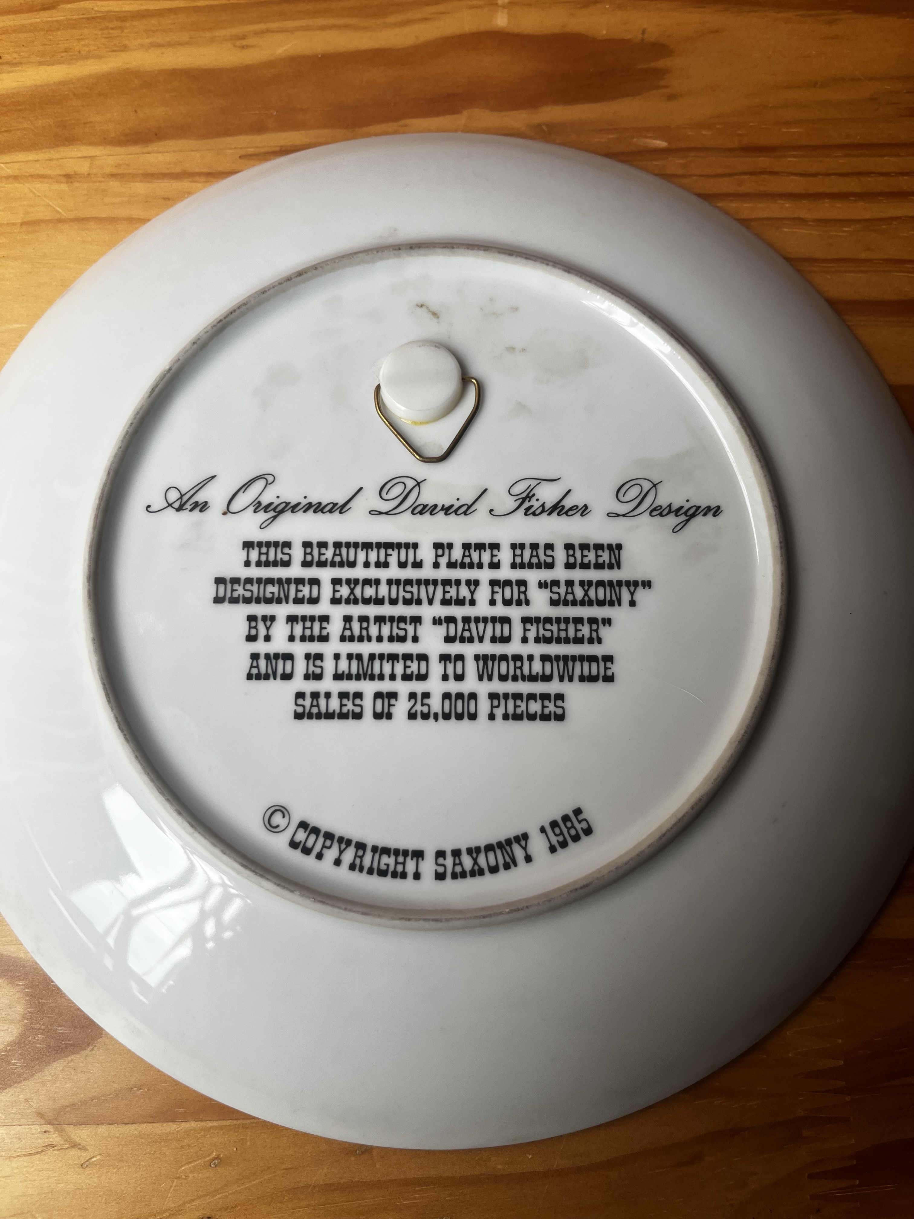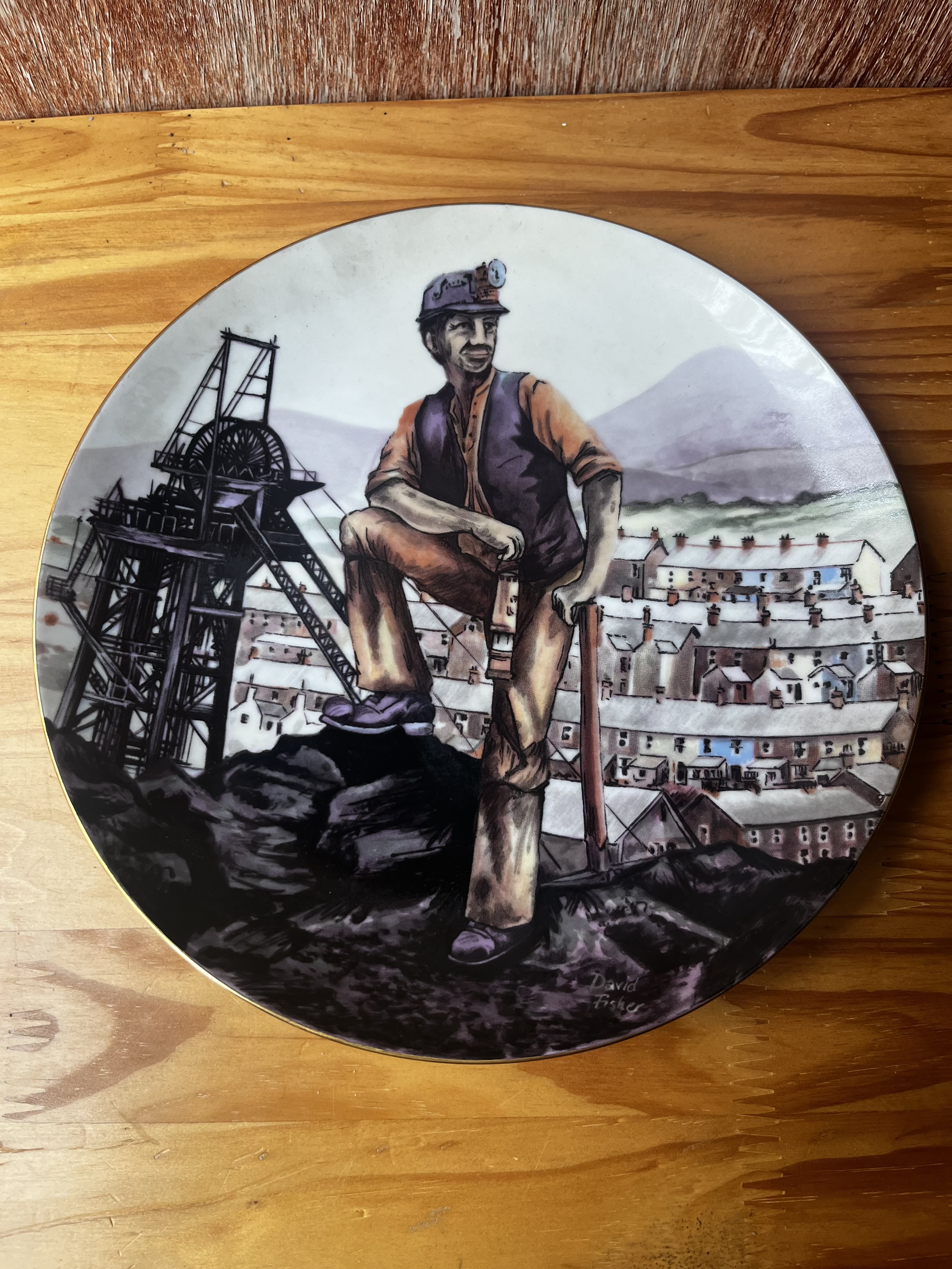 A vintage collector’s plate designed by David Fisher for Saxony in 1985, depicting a hardworking coal miner with helmet and lamp, holding a pickaxe, set against a backdrop of a colliery building and terraced houses. The artist’s signature, “David Fisher, ” is visible on the bottom right of the plate, highlighting its authenticity.