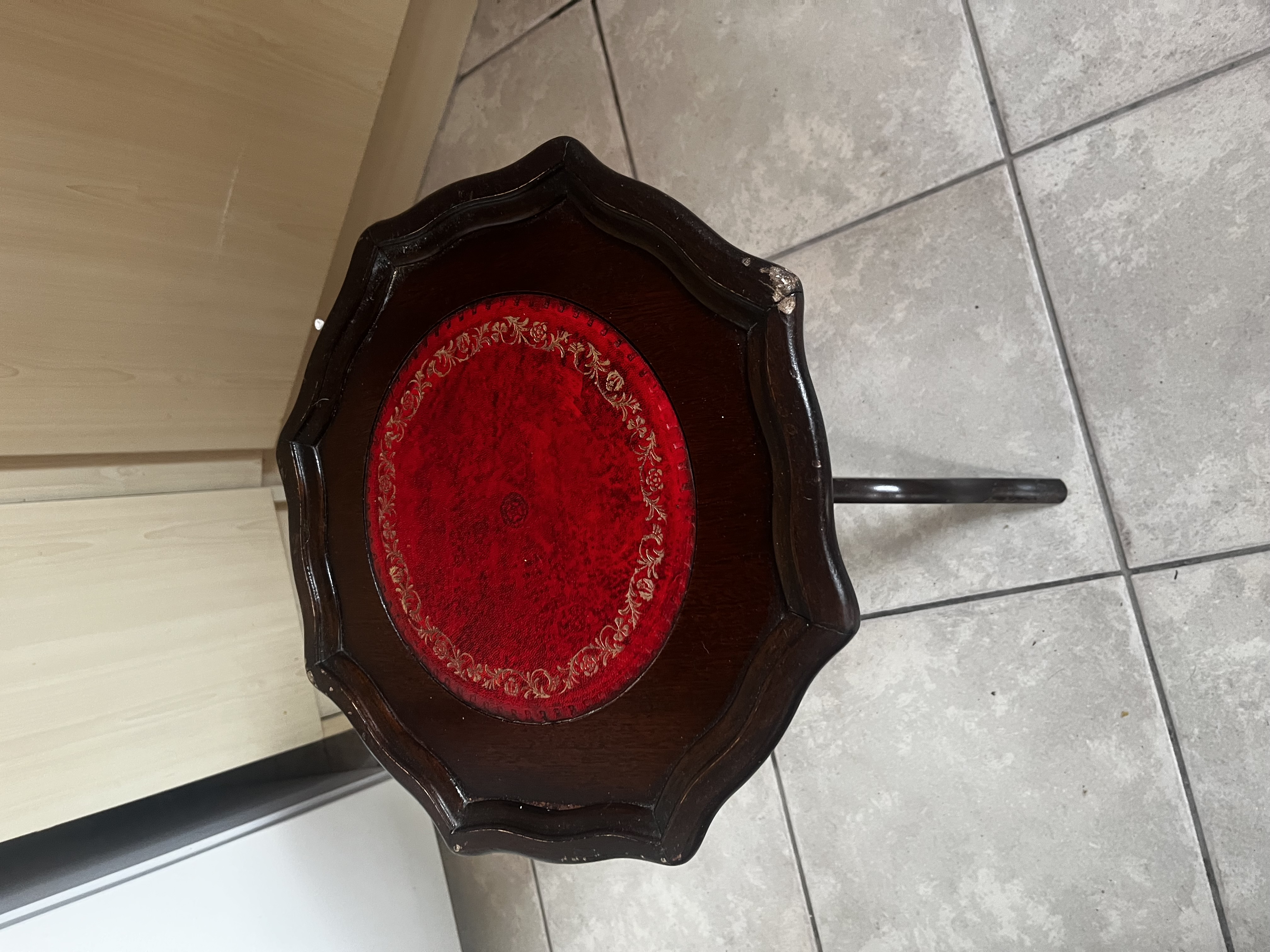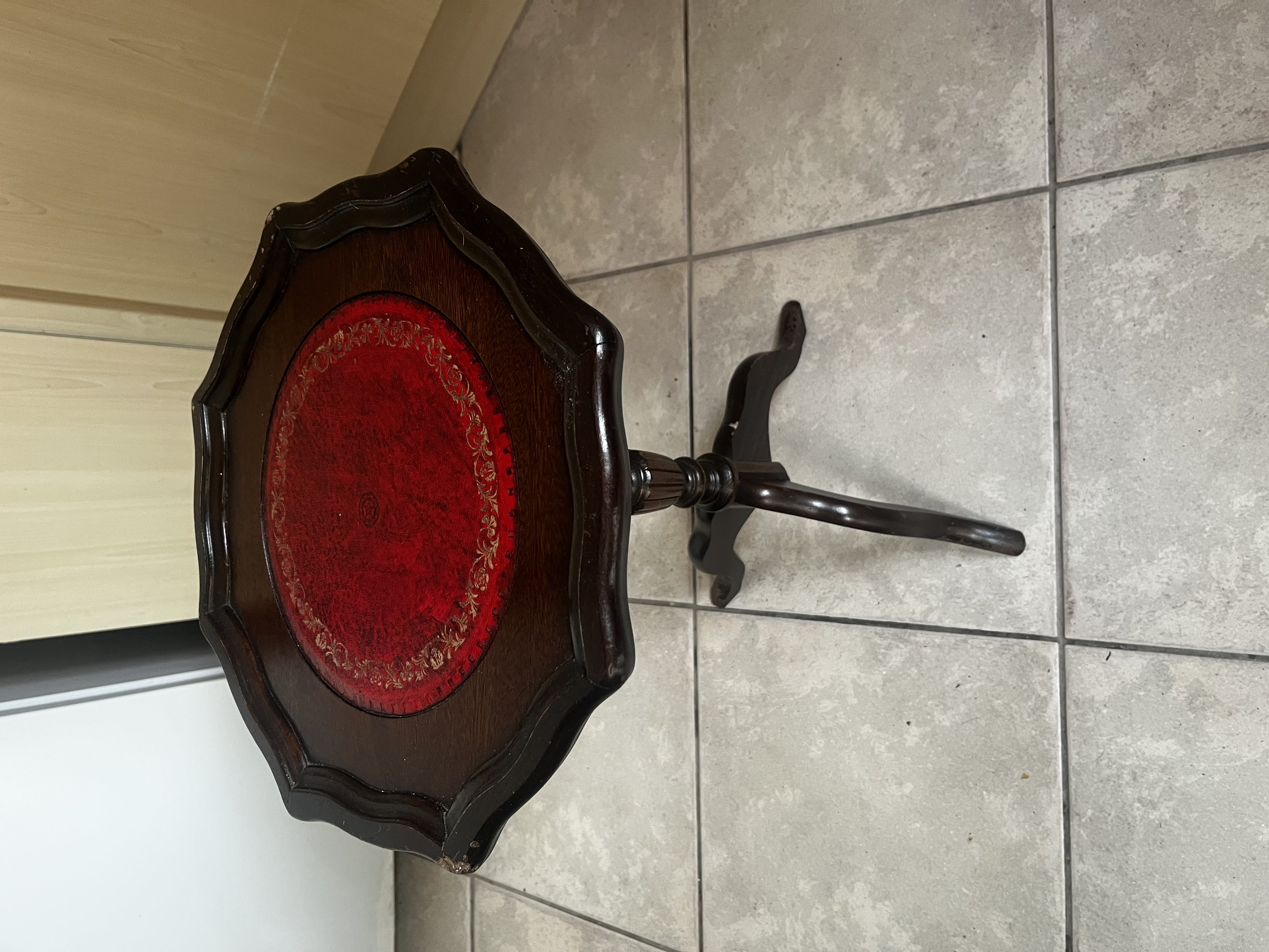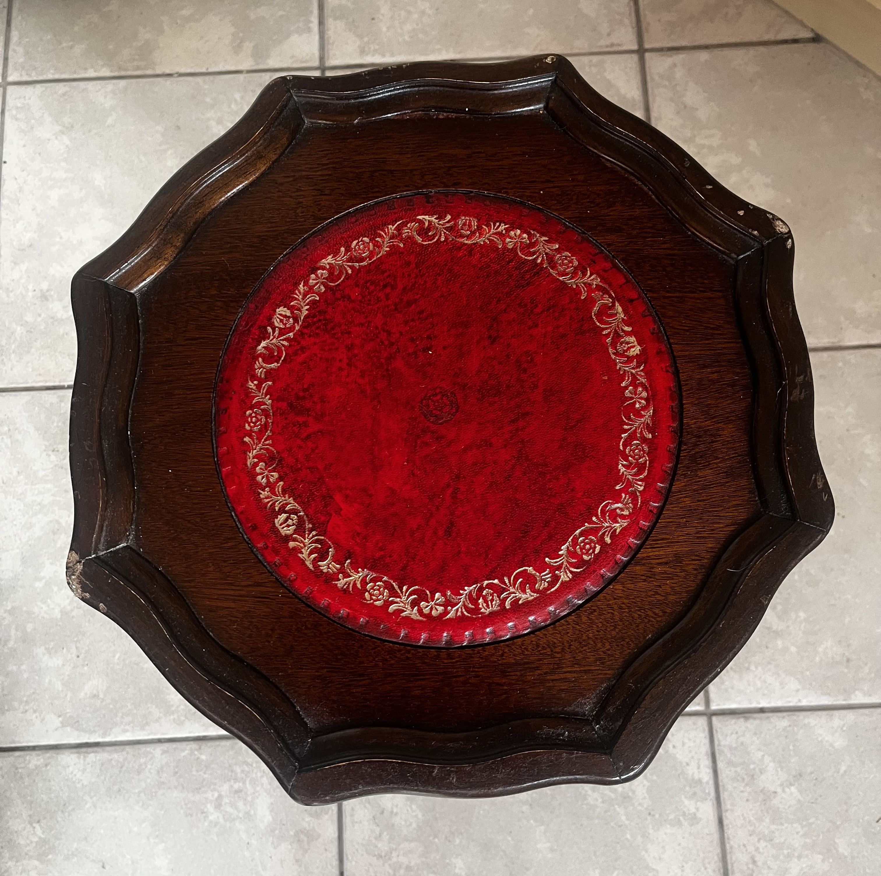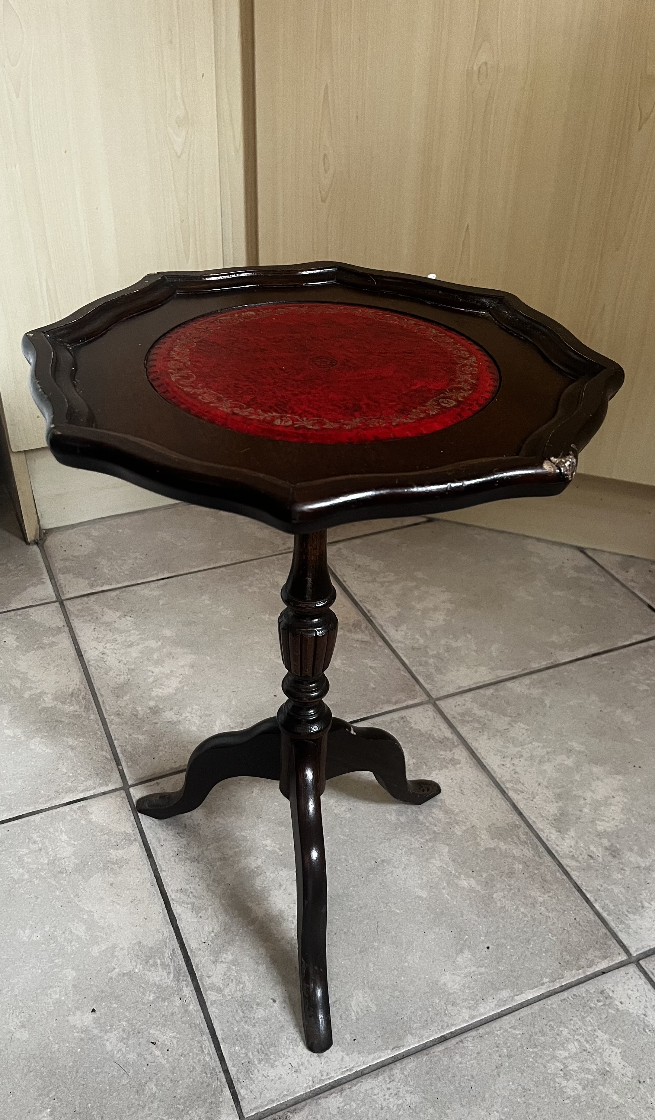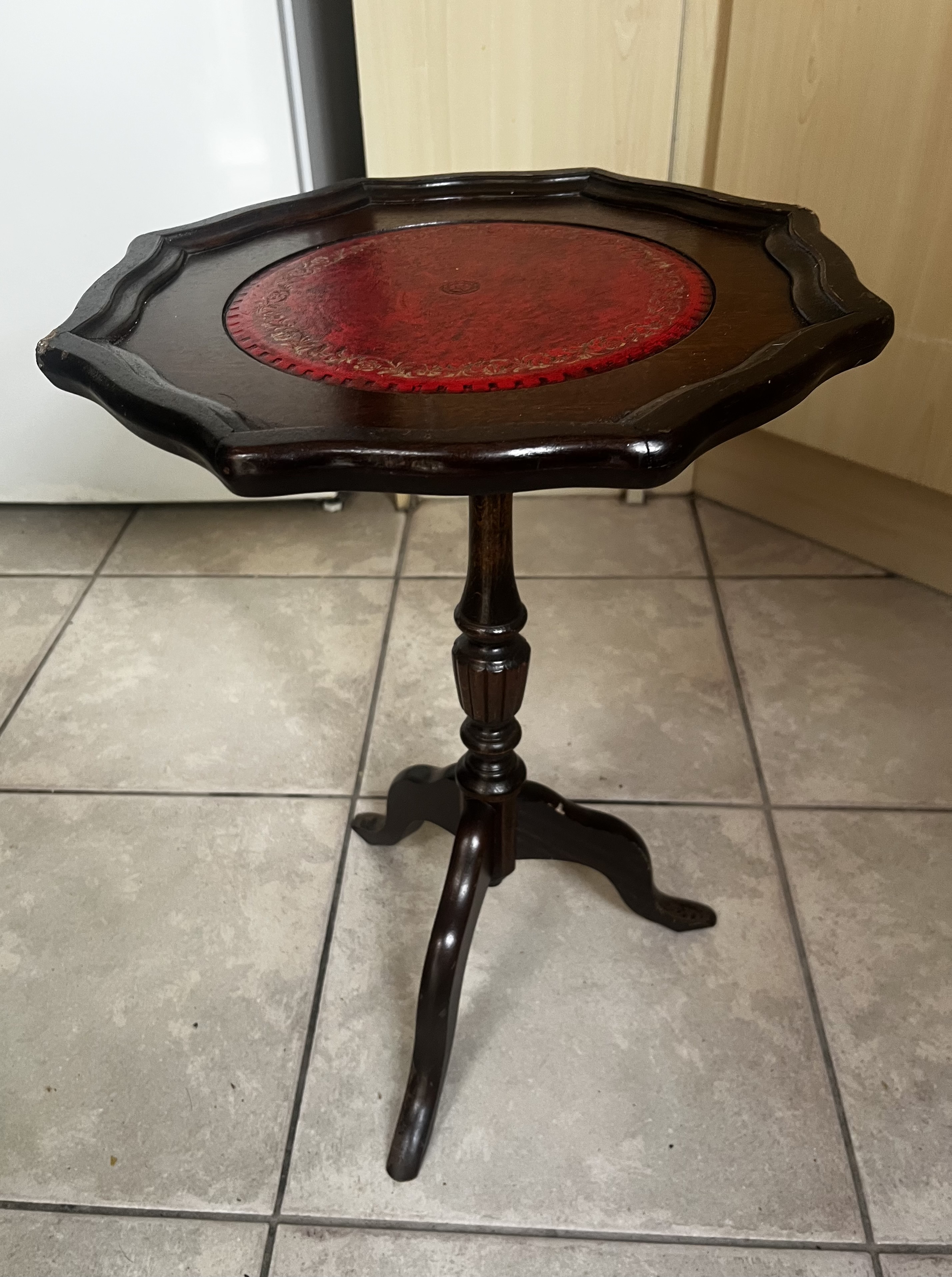 A fine Regency-style wine table, featuring a circular red leather inset top with gilt-tooled border, set upon a turned central column and tripod base with splayed legs. The leather top and dark polished finish give this elegant piece a classic and timeless appeal, ideal as a side or occasional table.