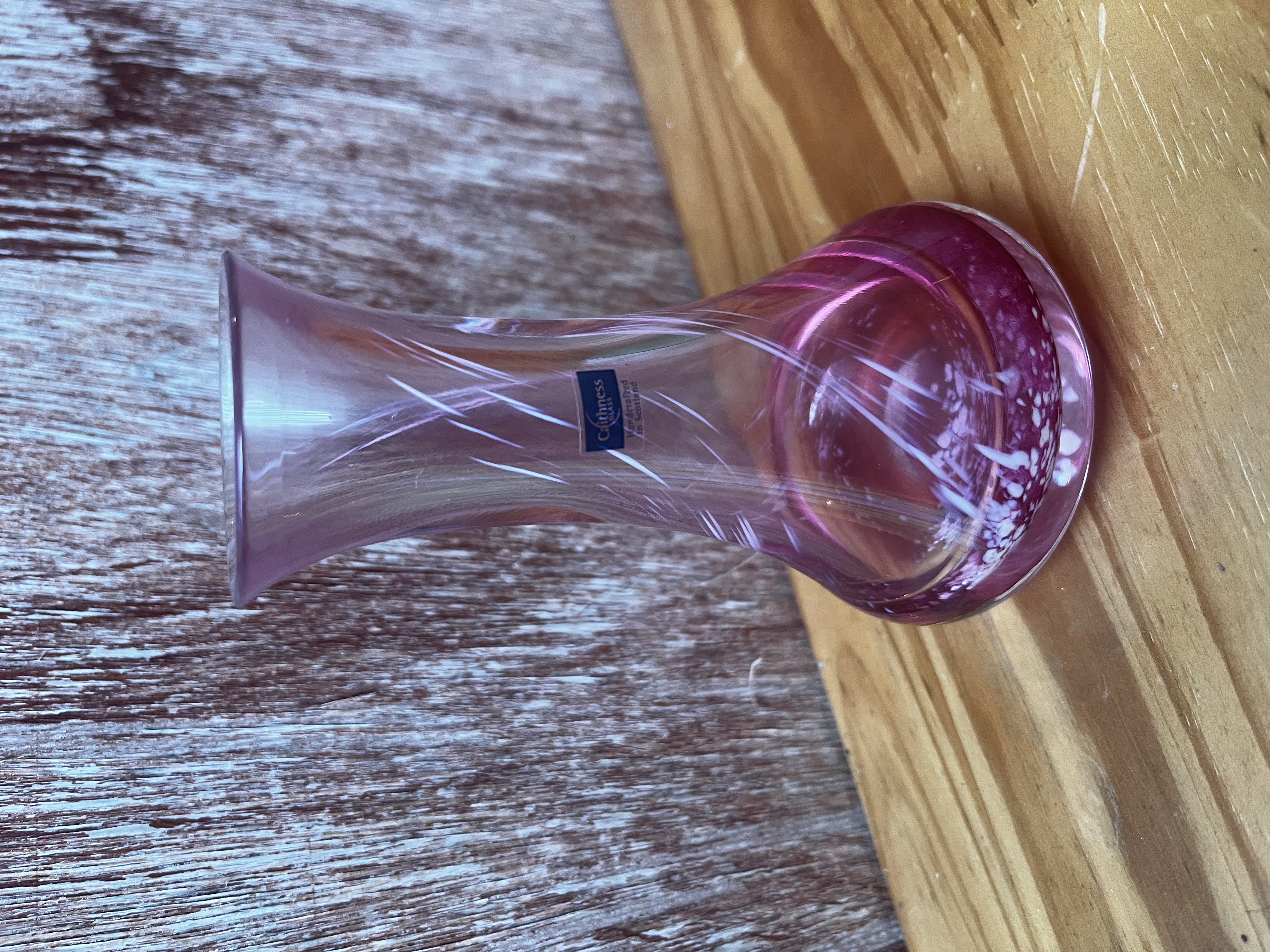 A beautiful vintage Caithness art glass bud vase, featuring a delicate pink swirl design characteristic of the renowned Scottish glassmaker. The vase showcases Caithness’s signature craftsmanship, with smooth contours and vibrant internal colour detailing.