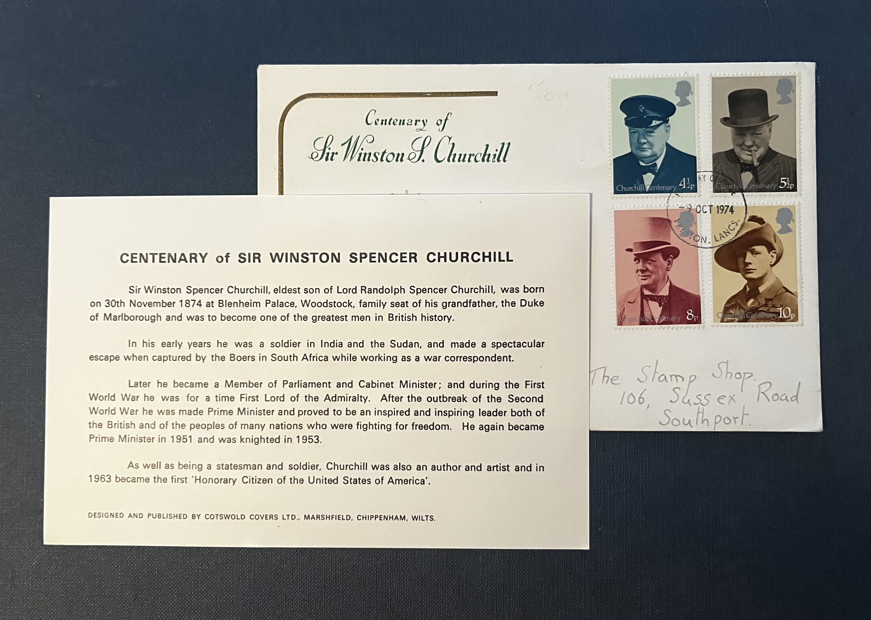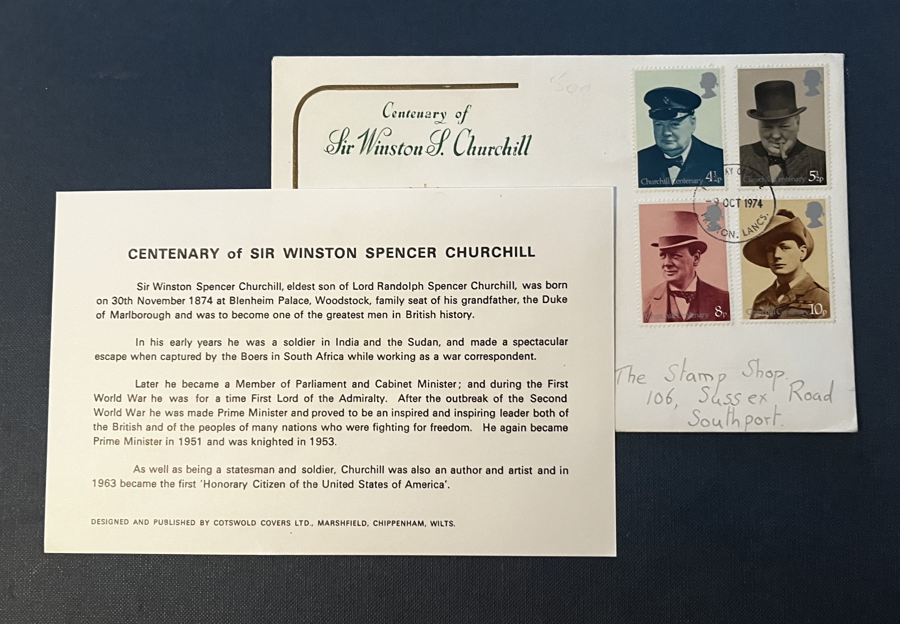 A commemorative First Day Cover issued by Cotswold Covers in 1974 to mark the centenary of Sir Winston Churchill’s birth.