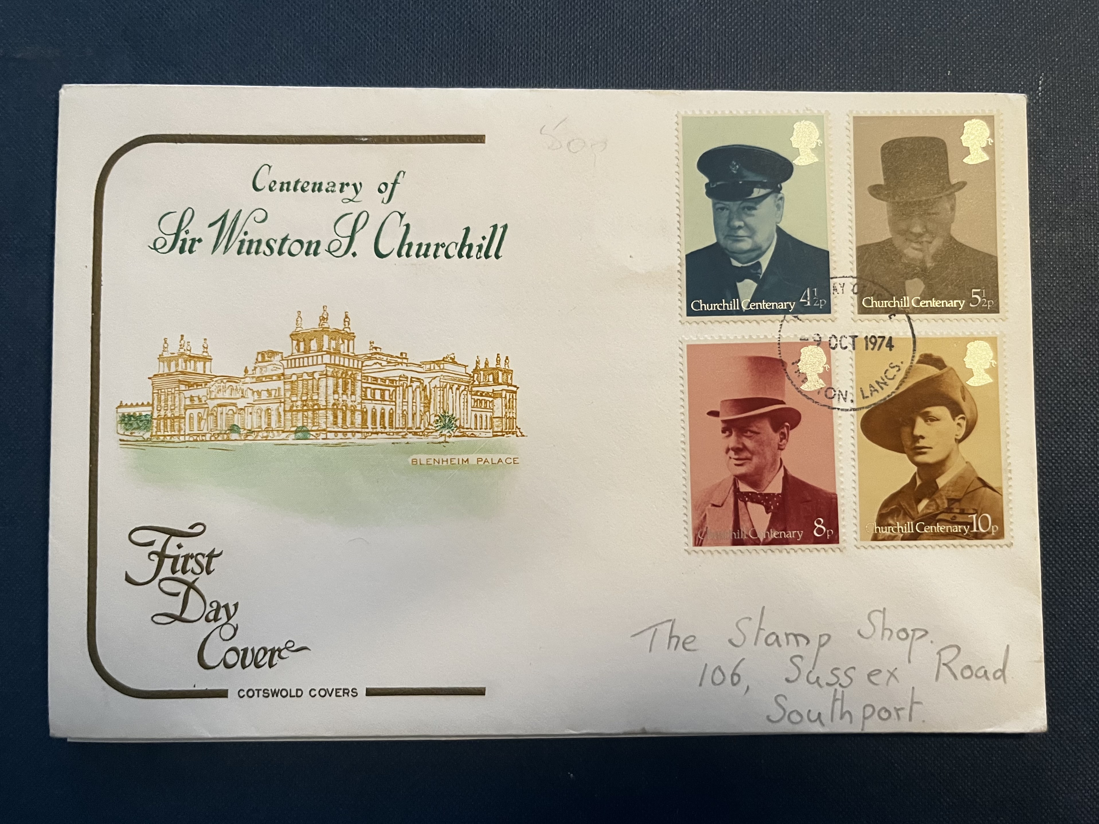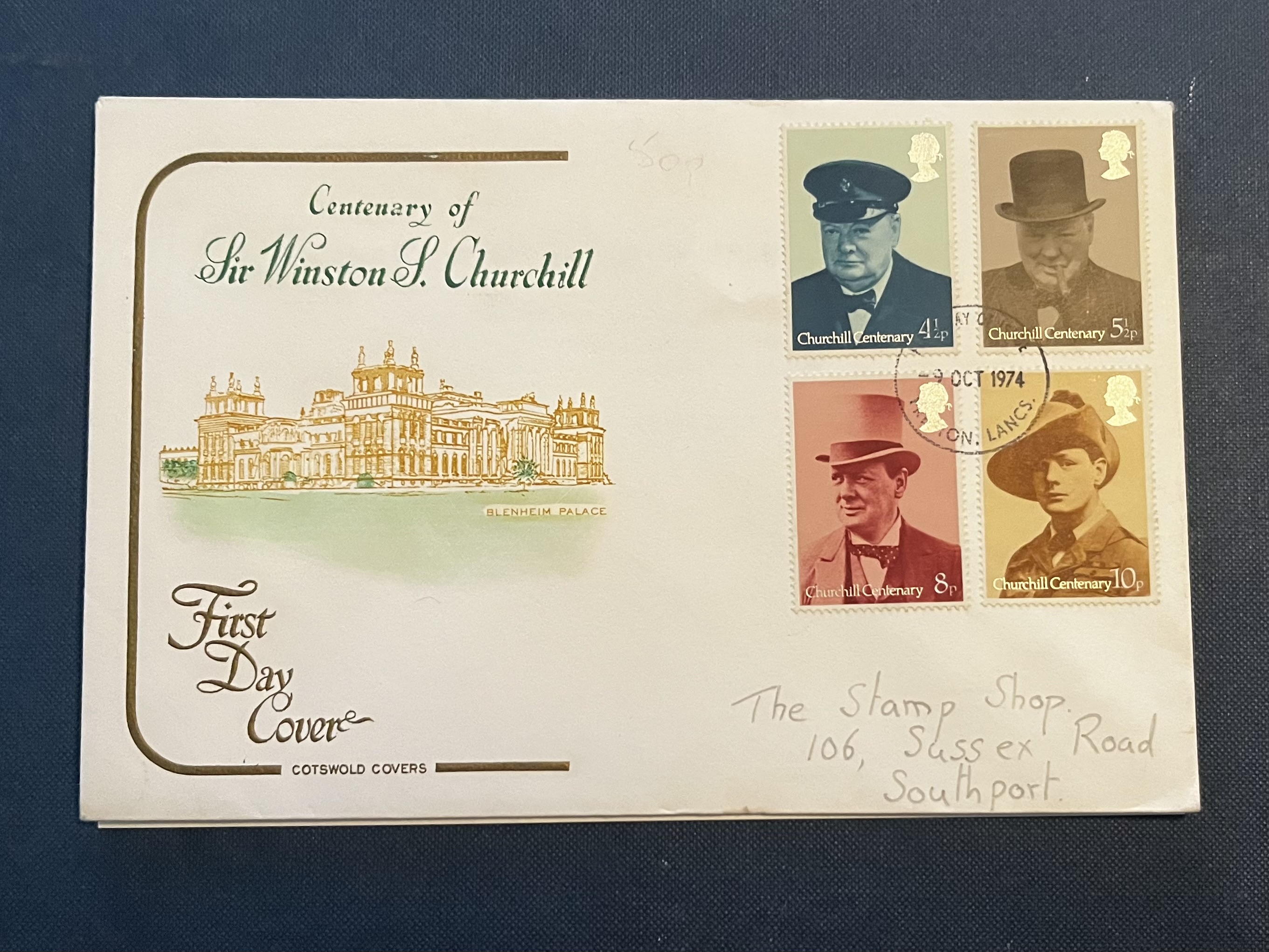 The cover is postmarked October 9, 1974 (Preston, Lancashire) and displays a colour illustration of Blenheim Palace, Churchill’s birthplace.