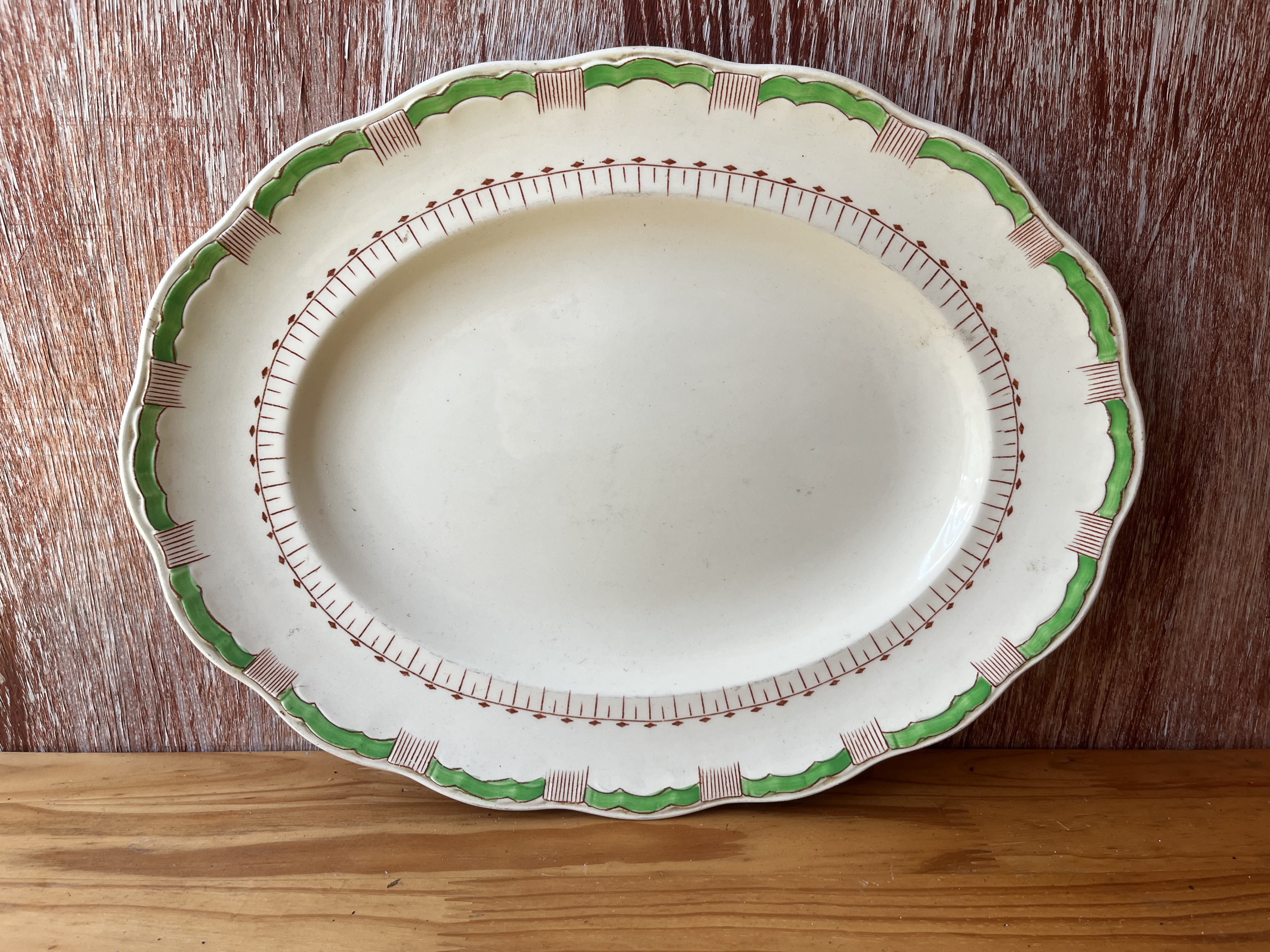The platter features a scalloped edge with a green and brown (or reddish-pink) pattern, often including floral elements like roses or marigolds