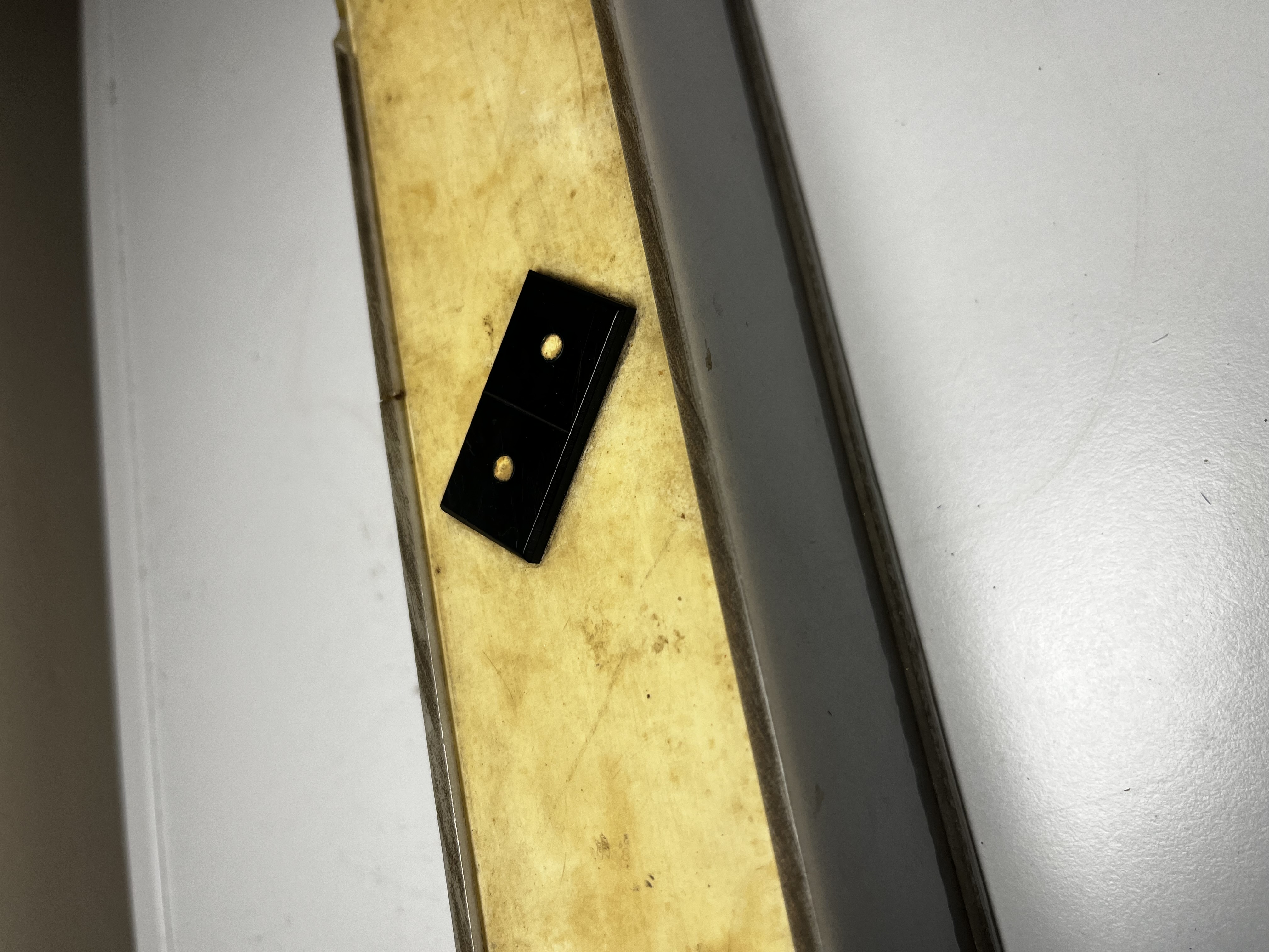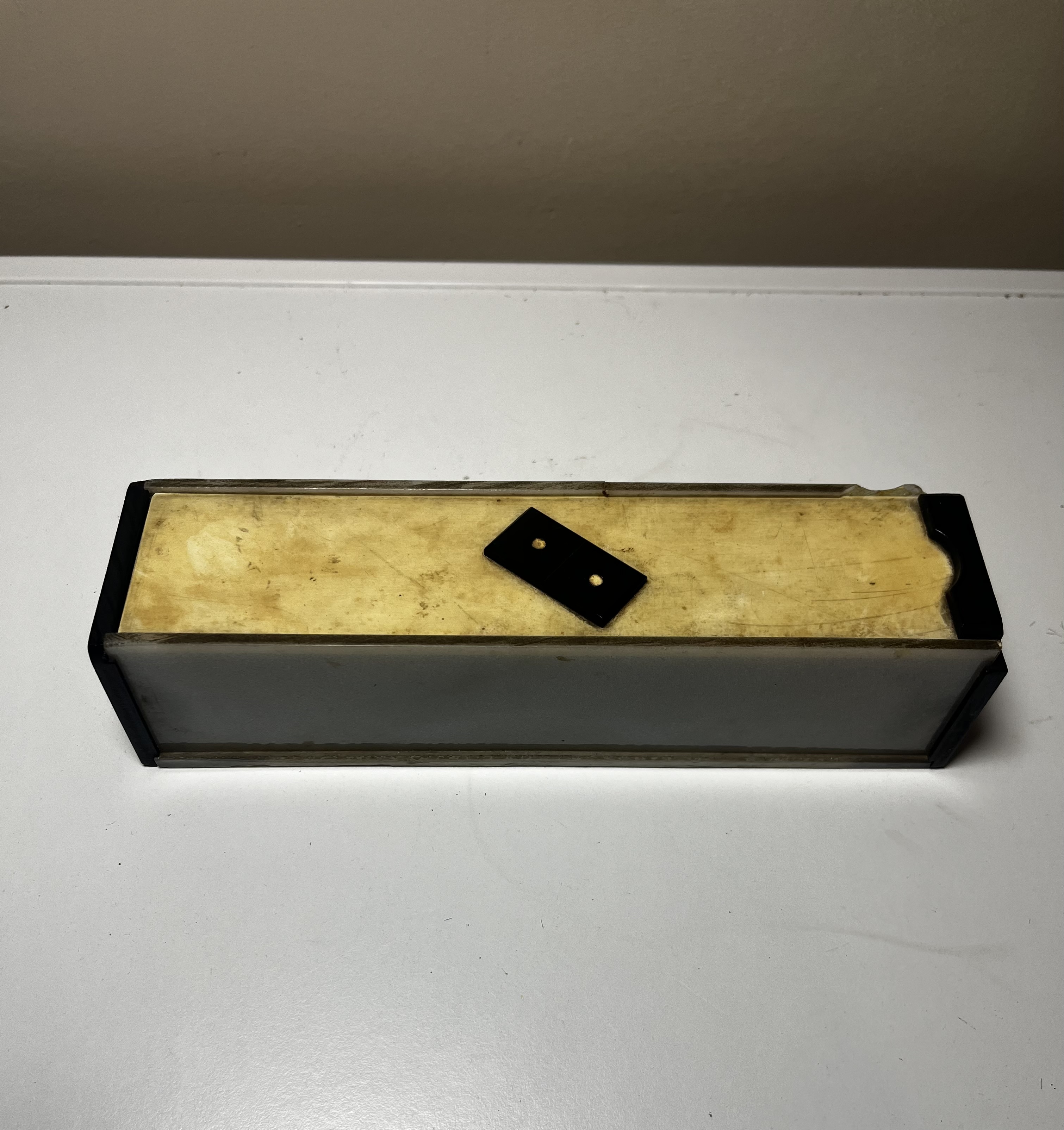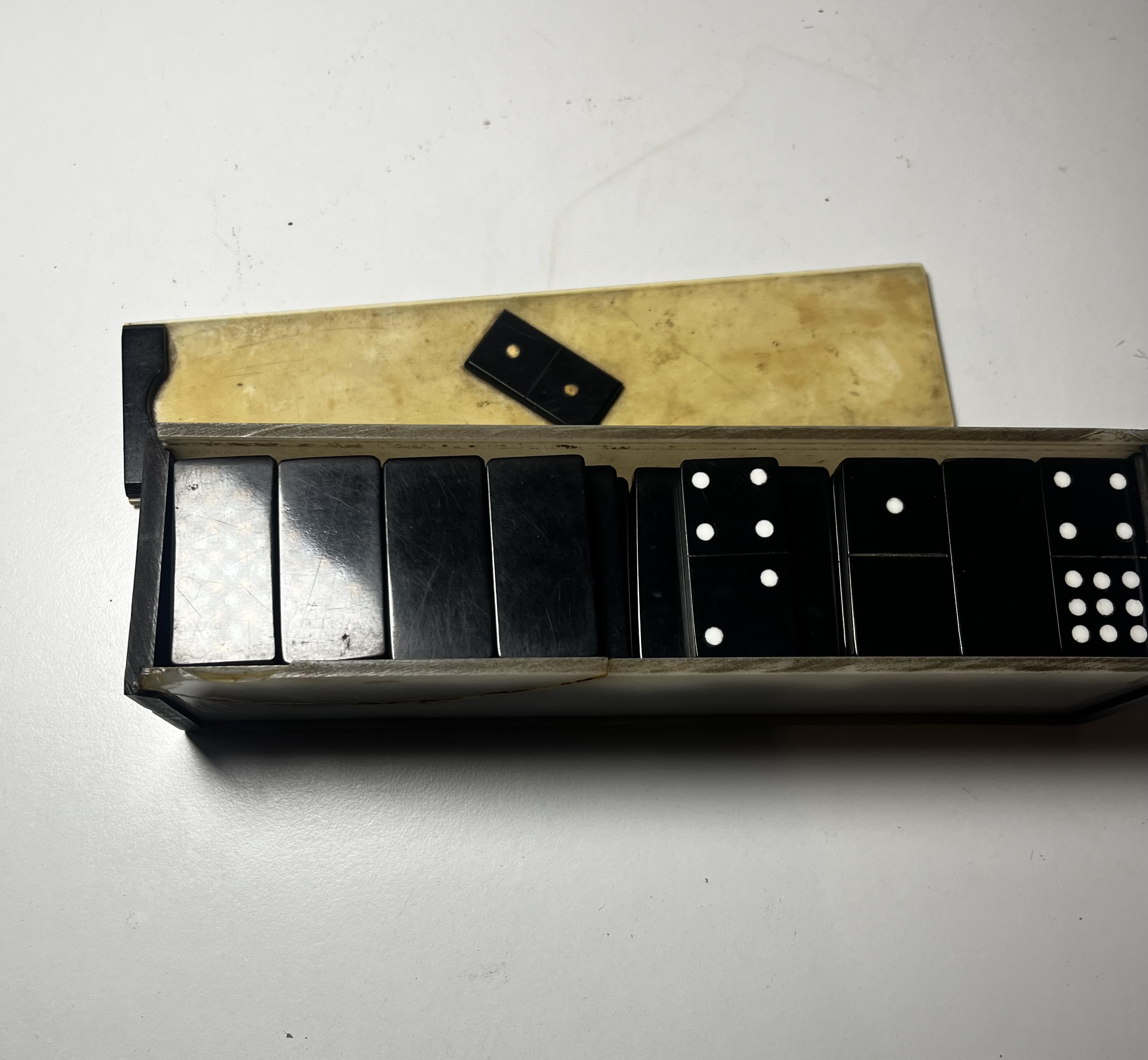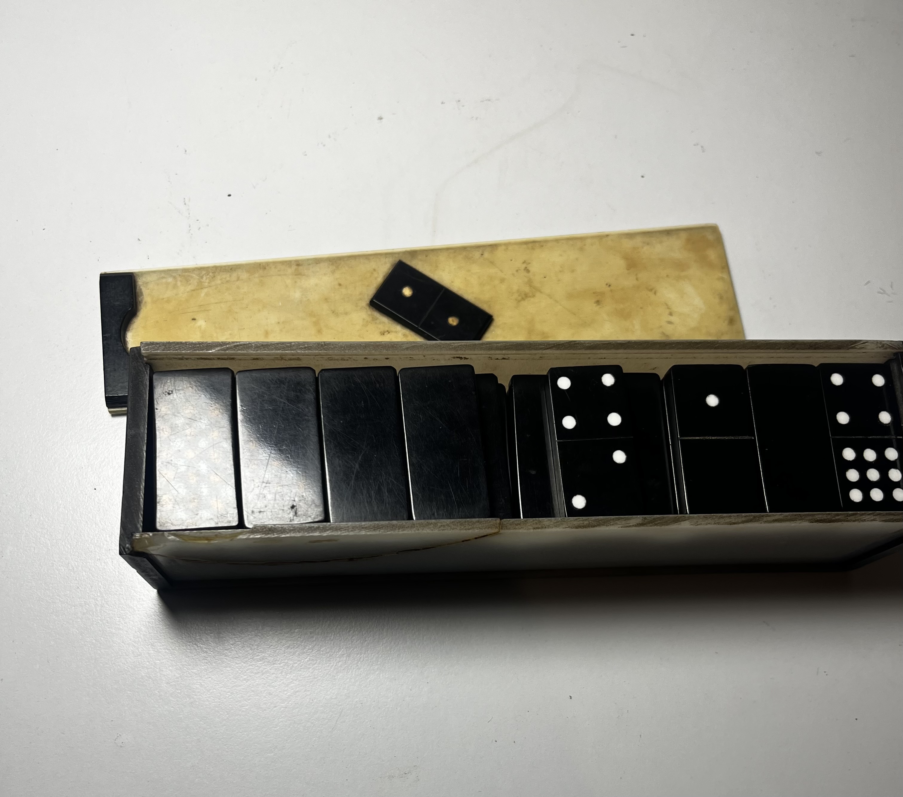A charming and complete vintage double-six domino set, housed in its original Box – see photos for condition.