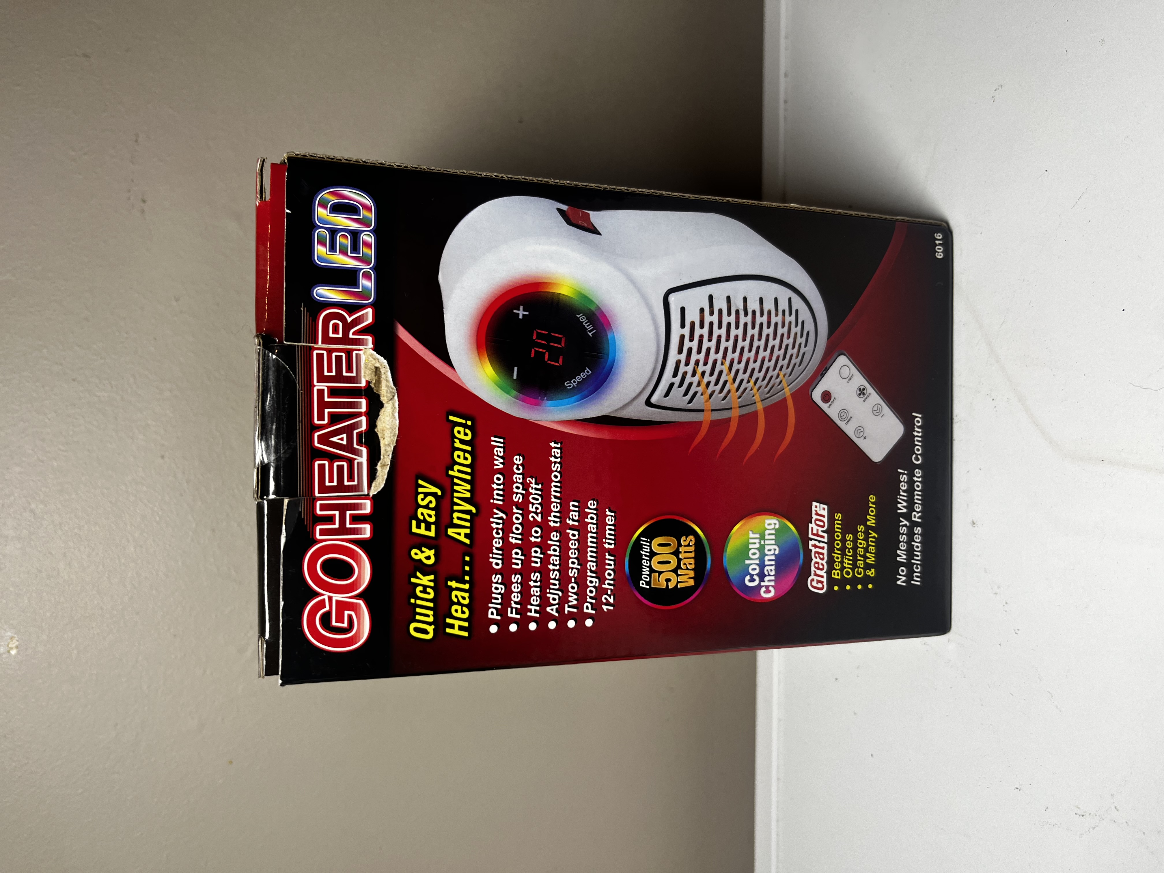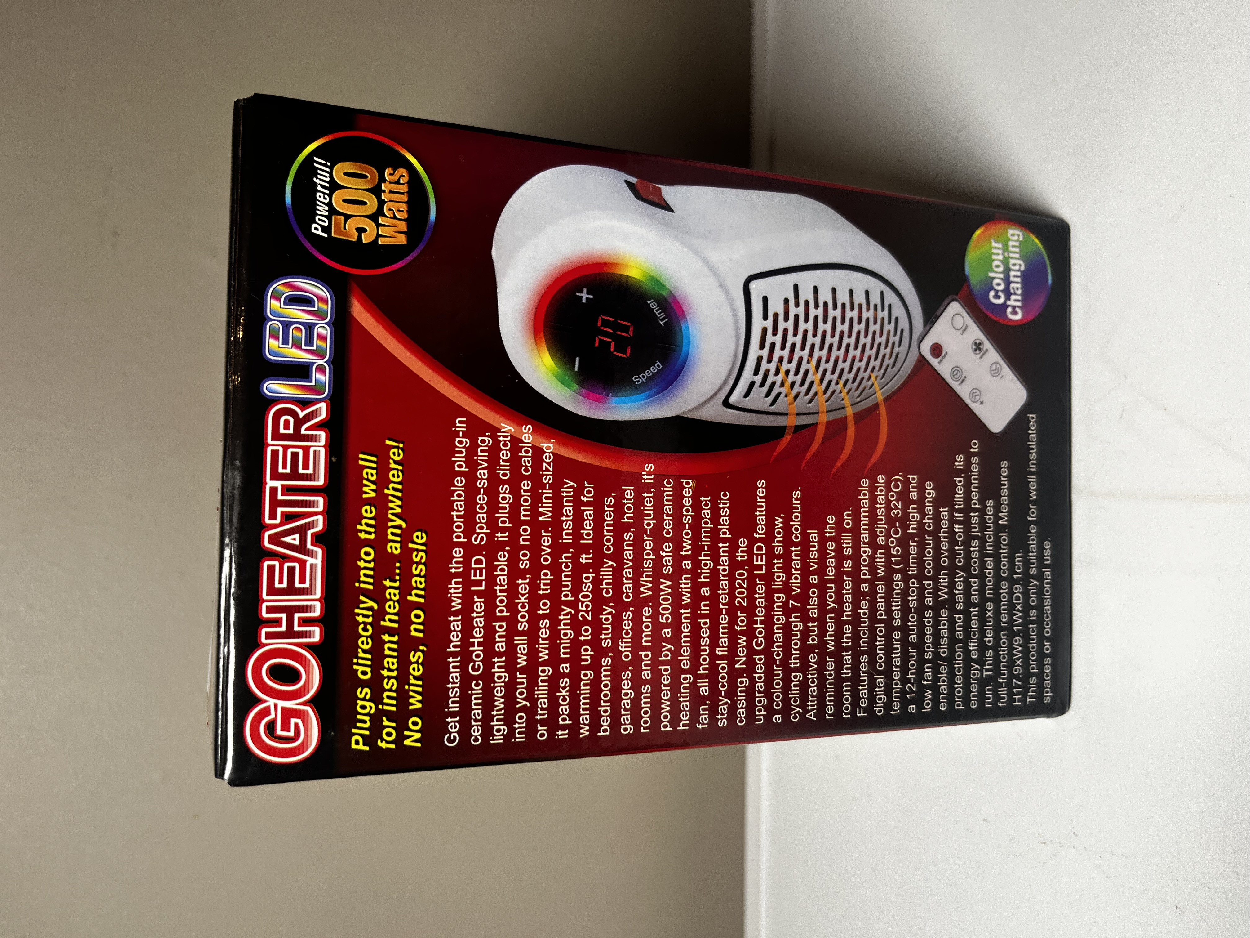 This lot features a brand new, still in its original packaging, Easylife GoHeater LED – the versatile and powerful plug-in portable ceramic heater. Designed for quick and convenient personal heating, this 500W ceramic heater offers a host of features to keep any small space comfortably warm. Perfect for supplemental heating in bedrooms, offices, garages, or even caravans, it plugs directly into the wall, freeing up valuable floor space and eliminating unsightly cables.