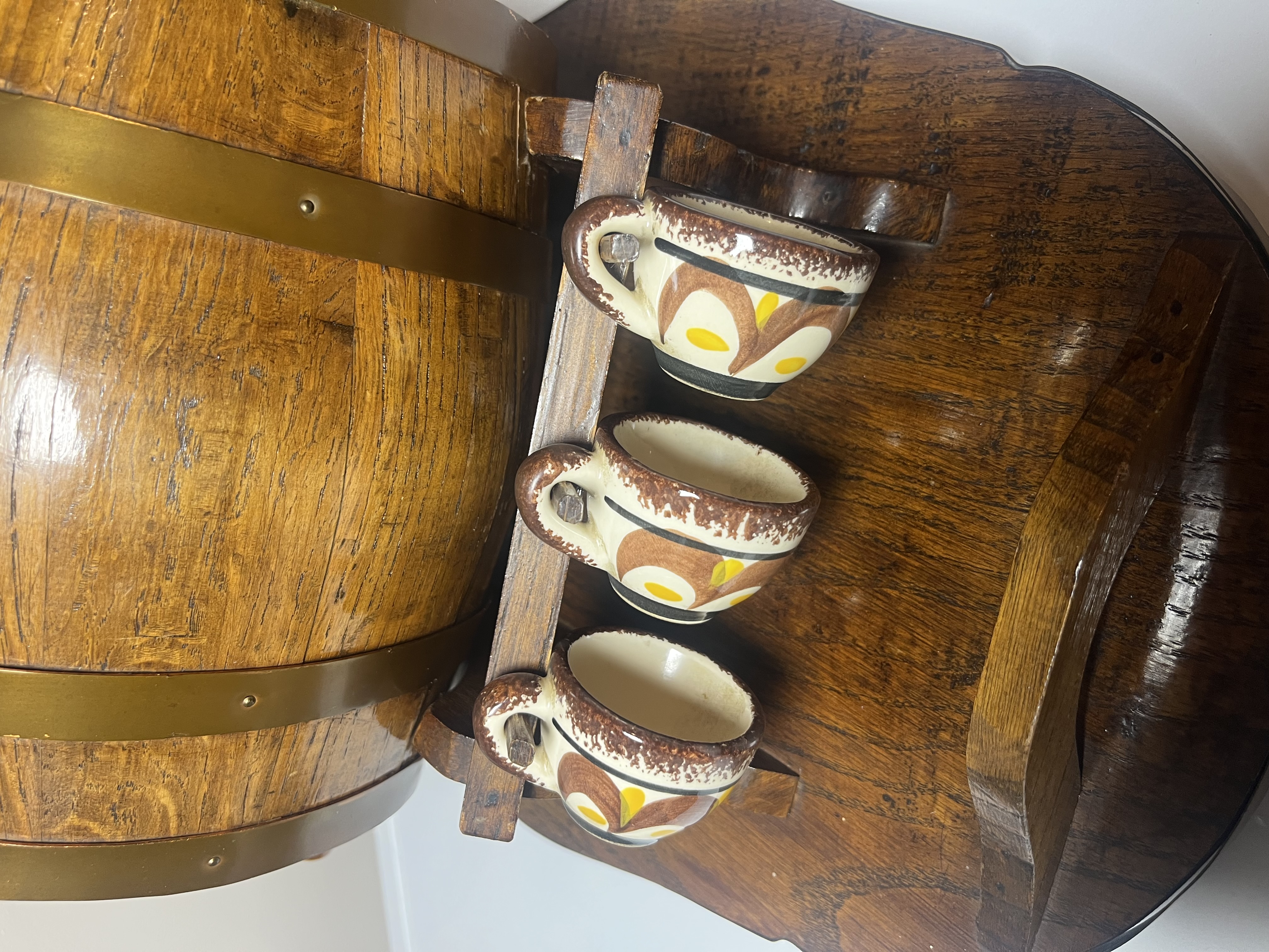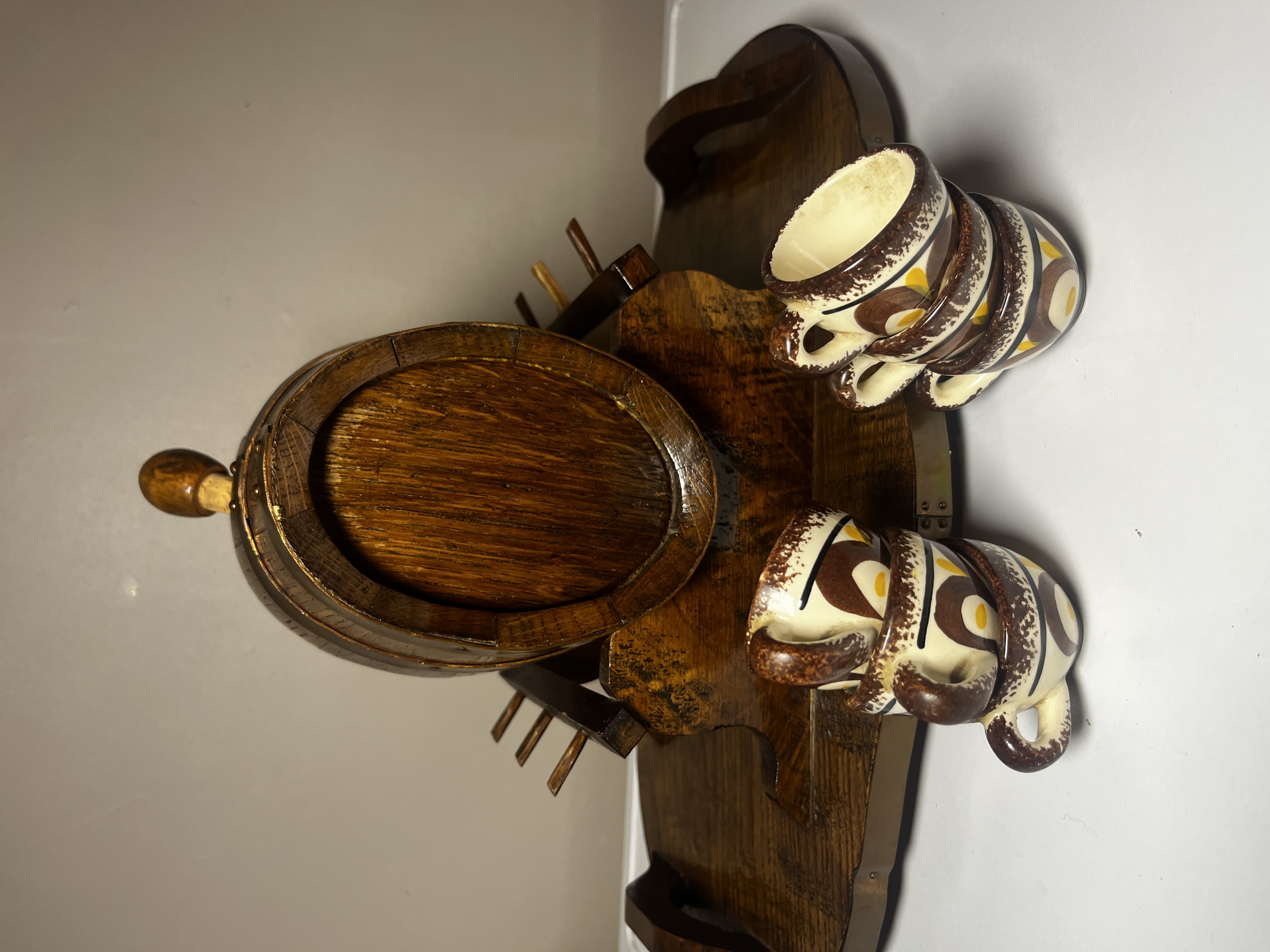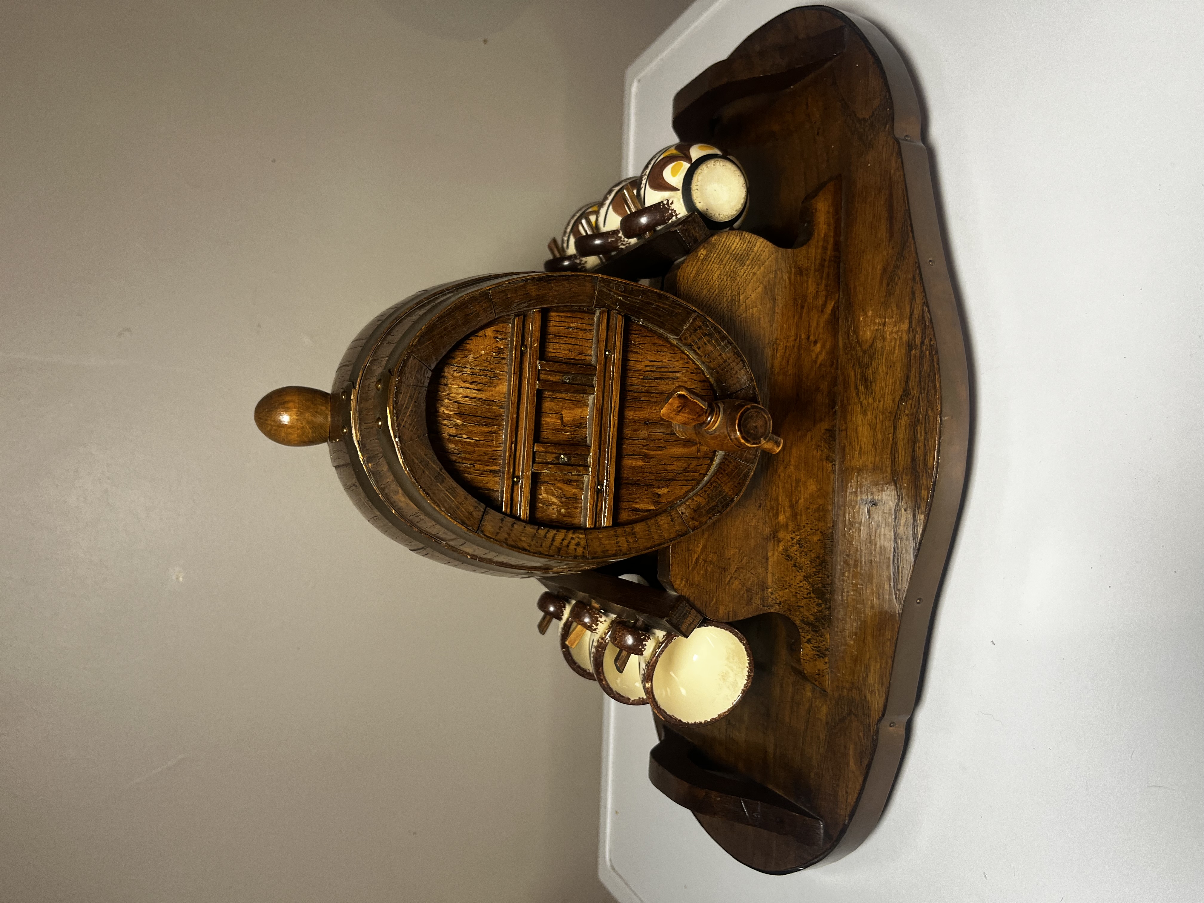 Presenting a charming and distinctive vintage liquor decanter set, likely dating from the mid-20th century. This unique barware ensemble features a handsome oak-stained wooden barrel decanter, complete with a functional spigot, elegantly mounted on a matching sculpted wooden stand that doubles as a serving tray. Accompanying the decanter are six charming hand-painted ceramic mugs or shot glasses, each complementing the rustic appeal of the barrel. This set is ideal for serving and displaying your favorite spirits, offering a nostalgic touch to any home bar or collection. The set is in good vintage condition, exhibiting minor wear consistent with age and use, which only adds to its character.