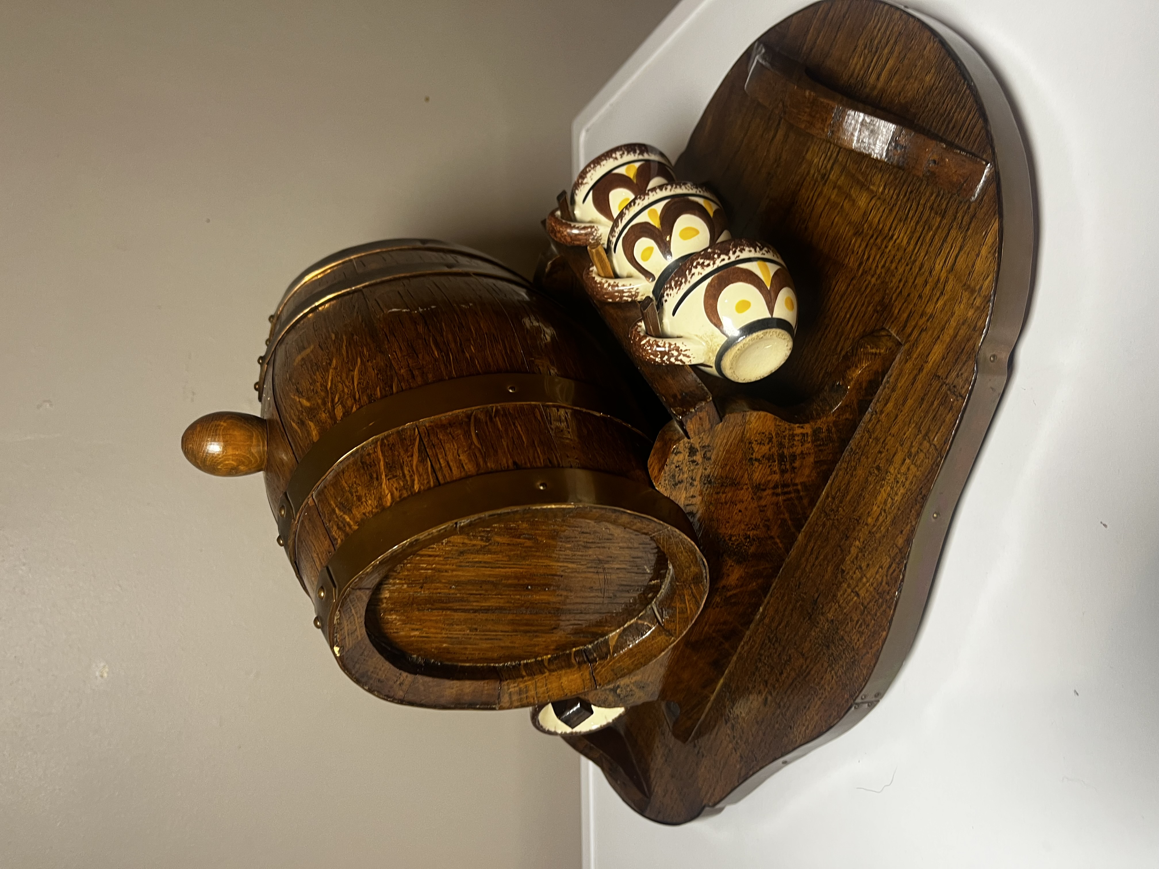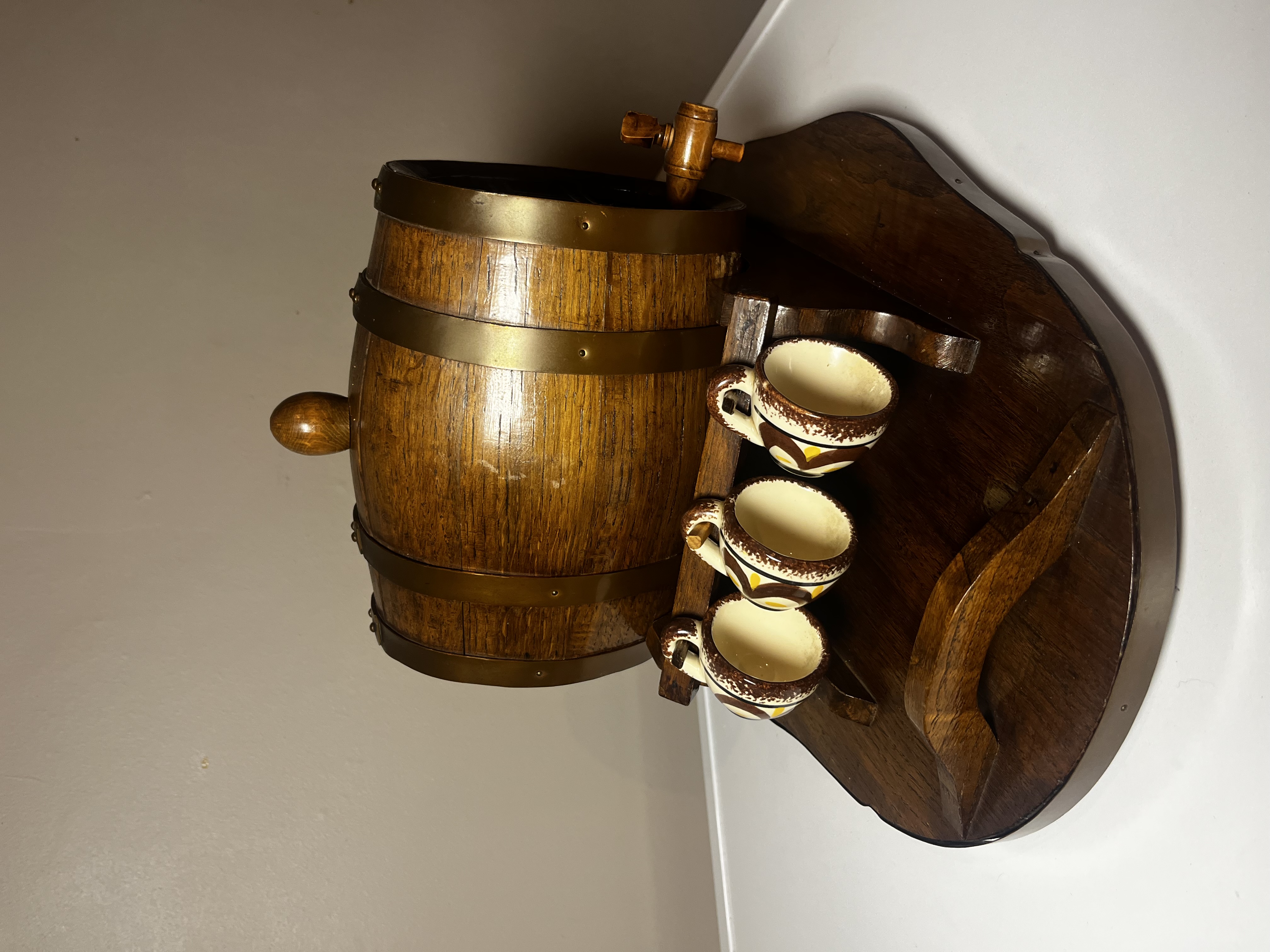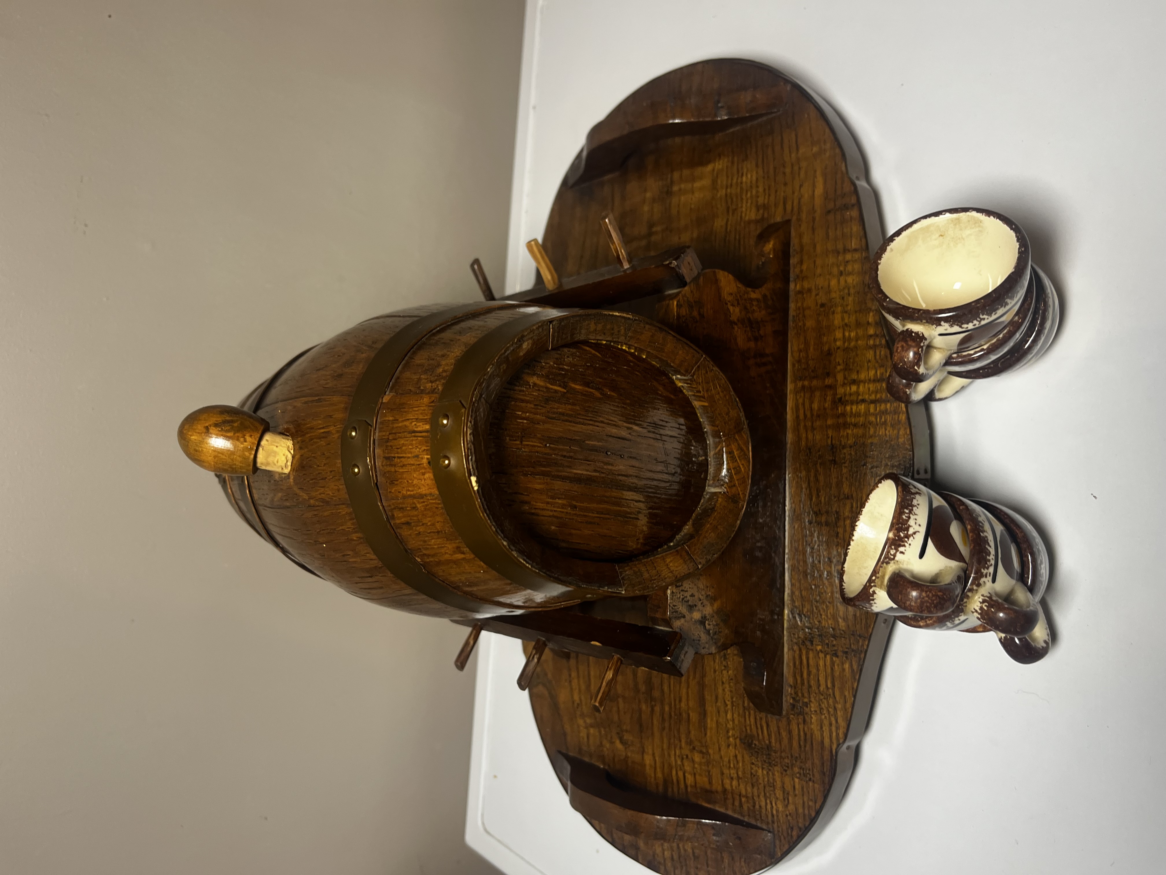 Presenting a charming and distinctive vintage liquor decanter set, likely dating from the mid-20th century. This unique barware ensemble features a handsome oak-stained wooden barrel decanter, complete with a functional spigot, elegantly mounted on a matching sculpted wooden stand that doubles as a serving tray. Accompanying the decanter are six charming hand-painted ceramic mugs or shot glasses, each complementing the rustic appeal of the barrel. This set is ideal for serving and displaying your favorite spirits, offering a nostalgic touch to any home bar or collection. The set is in good vintage condition, exhibiting minor wear consistent with age and use, which only adds to its character.