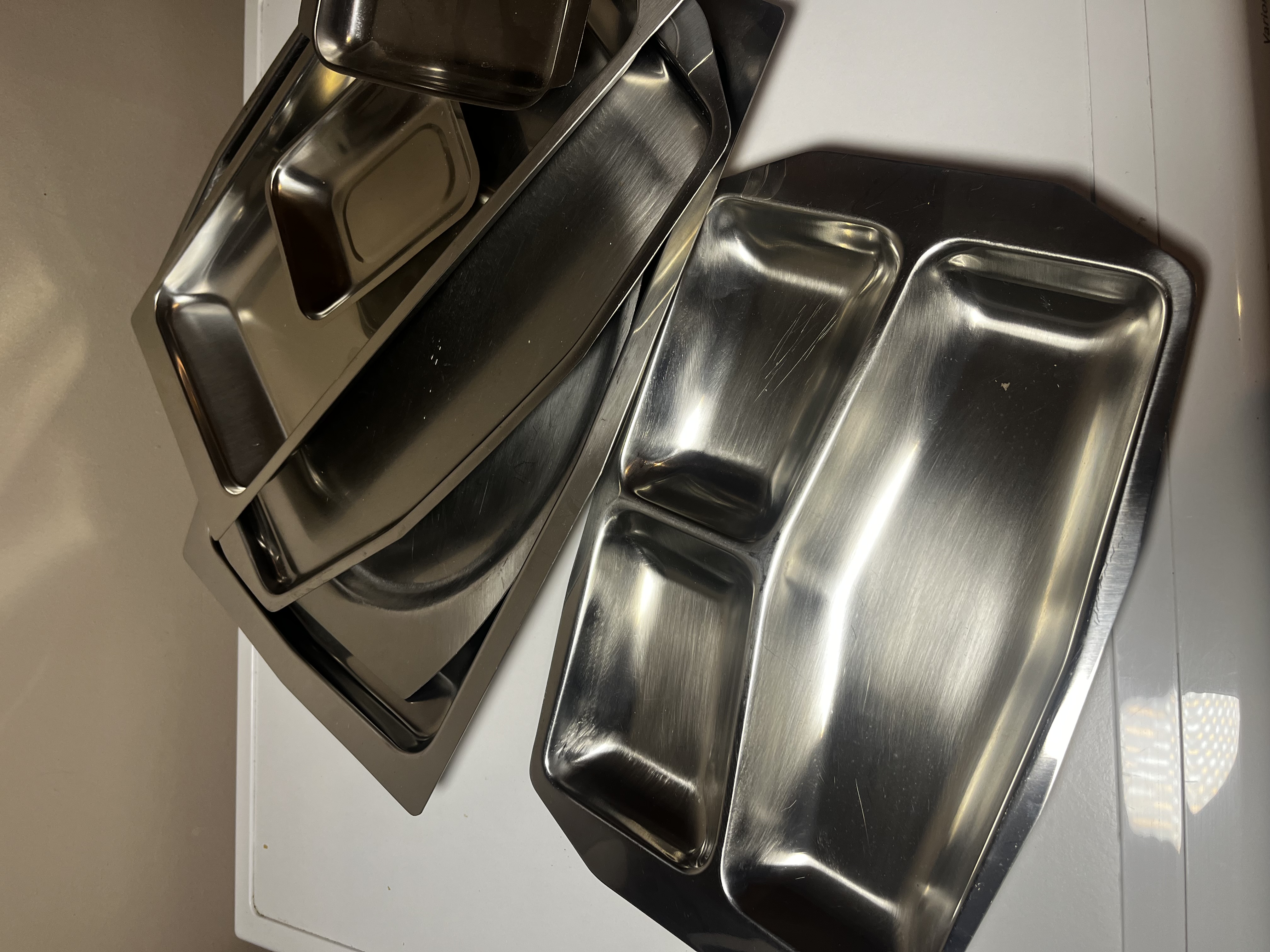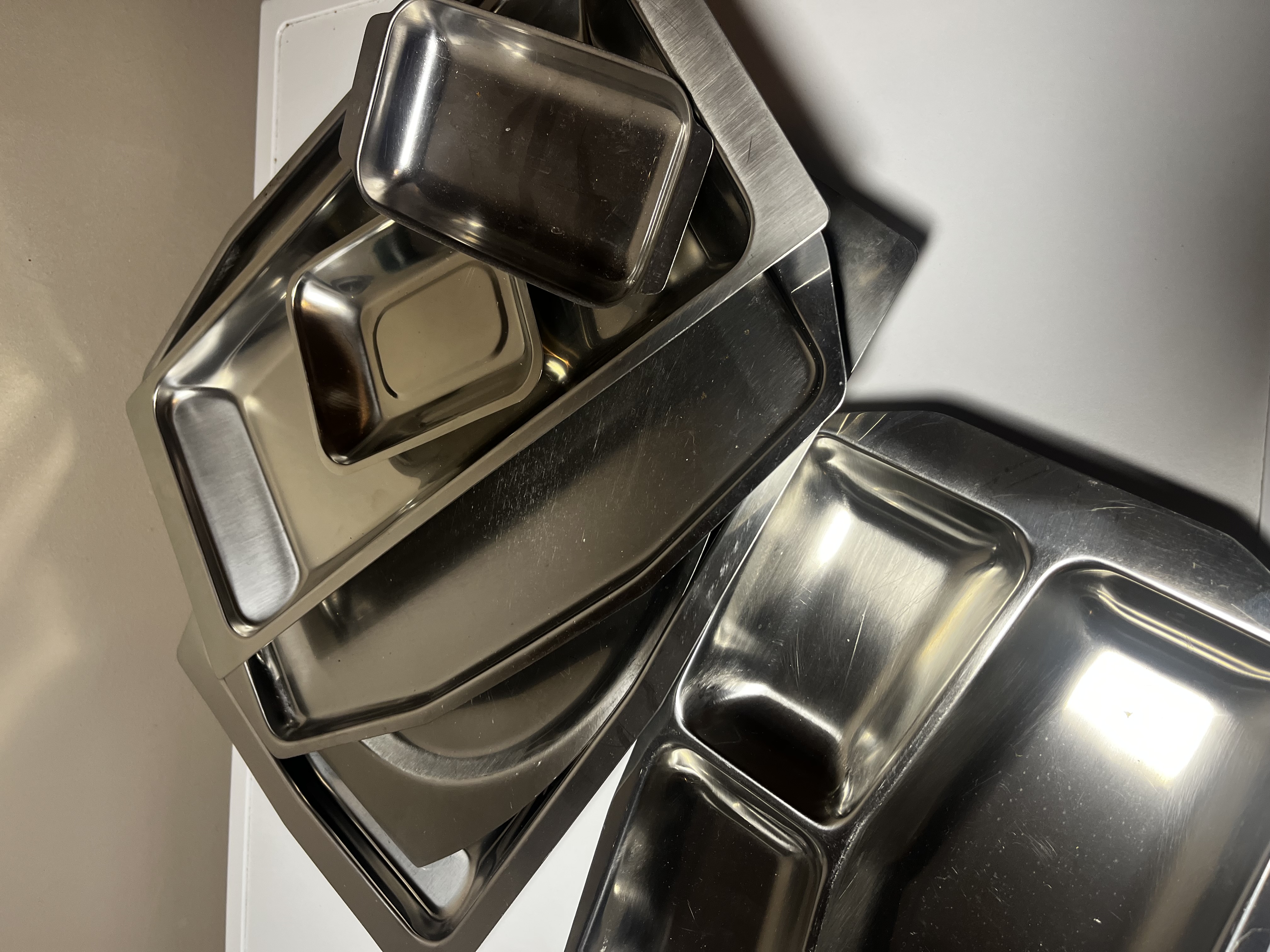 classic vintage-style stainless steel divided serving trays, perfect for a touch of retro charm in your kitchen or for practical use. Ideal for serving meals with separated courses, these durable and hygienic trays are a timeless piece of institutional and home dining history. Great for picnics, camping, kids’ meals, or everyday use. Easy to clean and built to last.