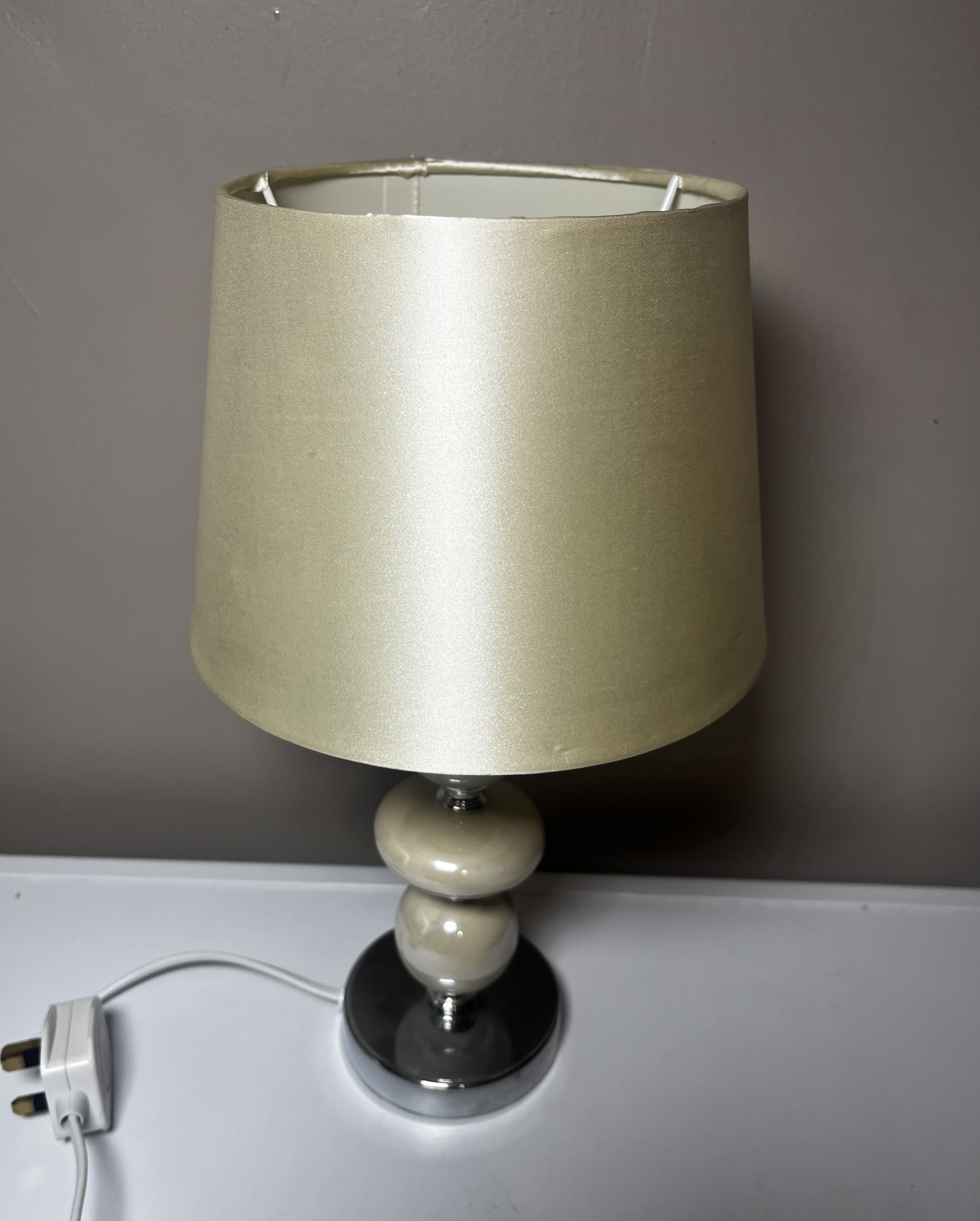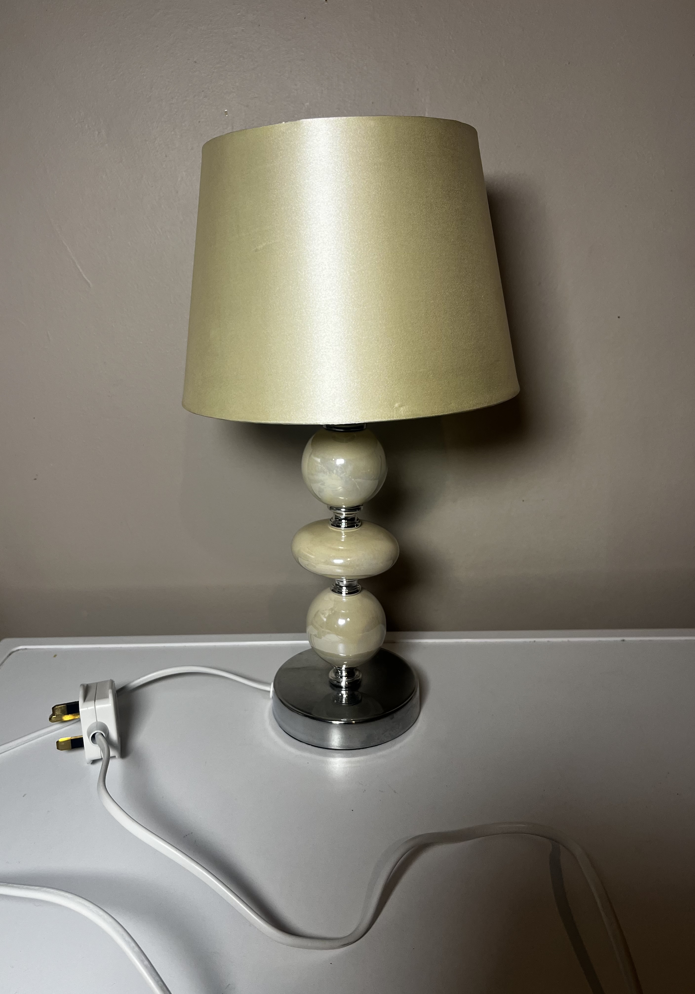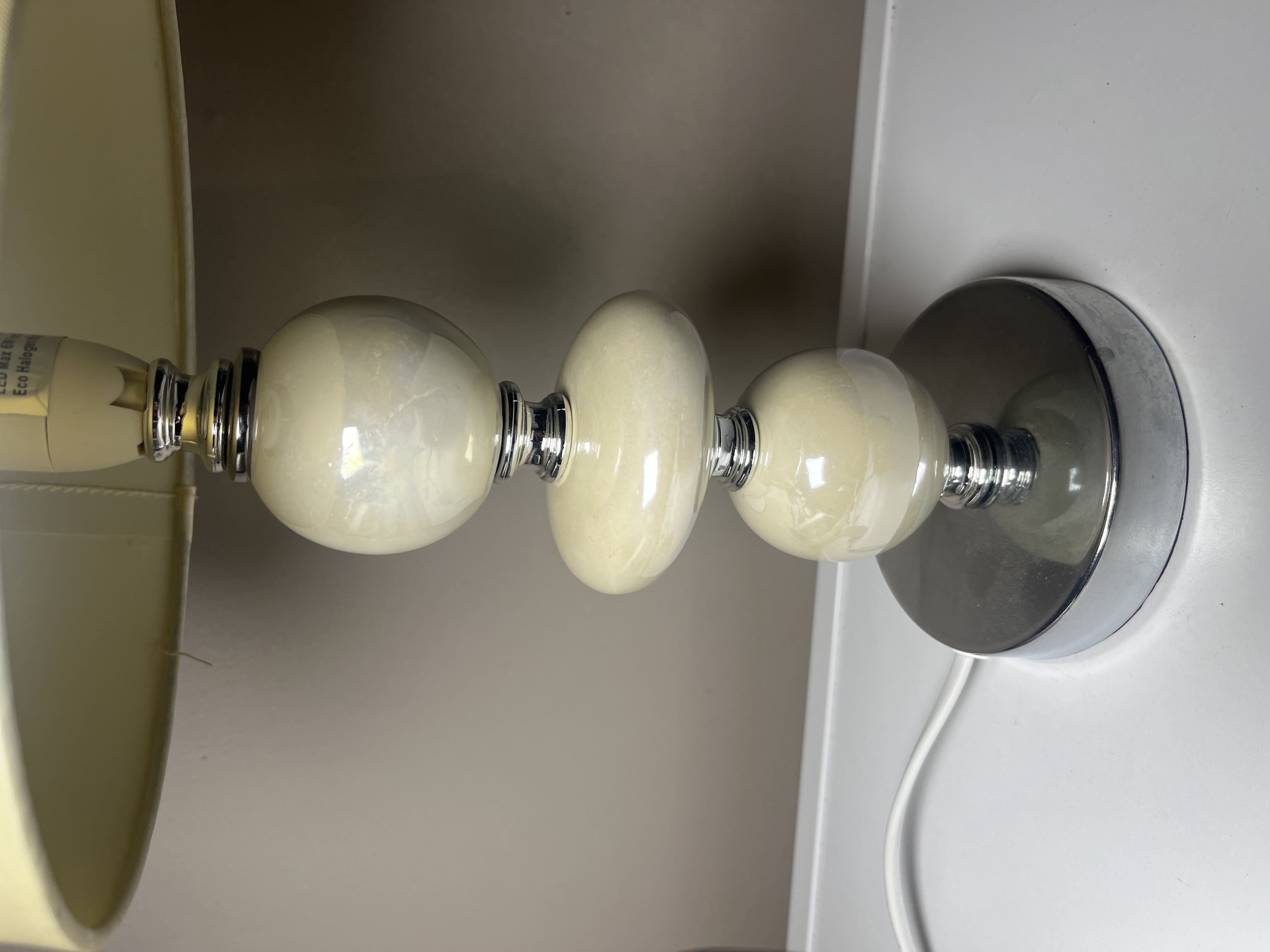 This elegant and fully working side lamp (table lamp) is ready to add a touch of sophistication to your home. It features a stylish stacked orb base, likely crafted from marble or a high-quality marble-effect material, and finished with polished chrome accents. Topped with a classic cream fabric drum shade, this lamp will provide warm ambient light, perfect for a bedside table, desk, or sideboard. In good, working condition