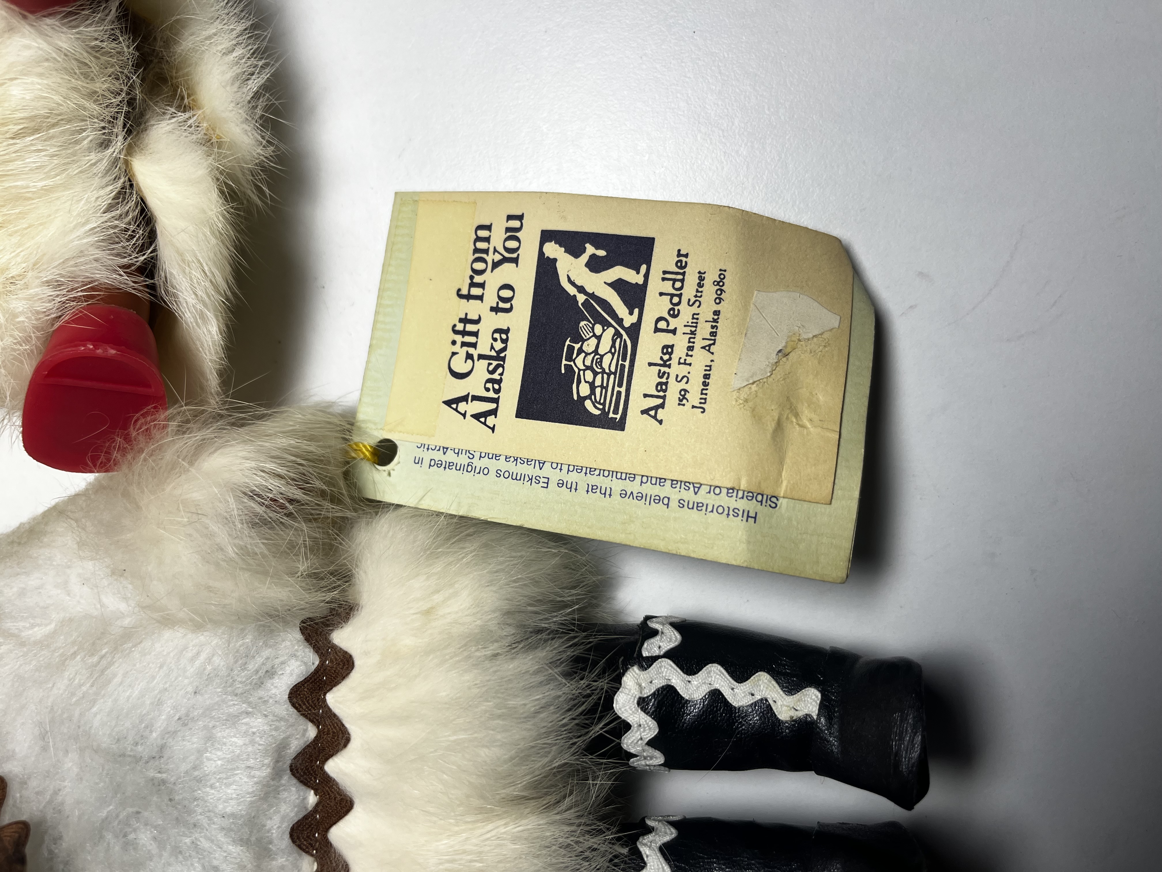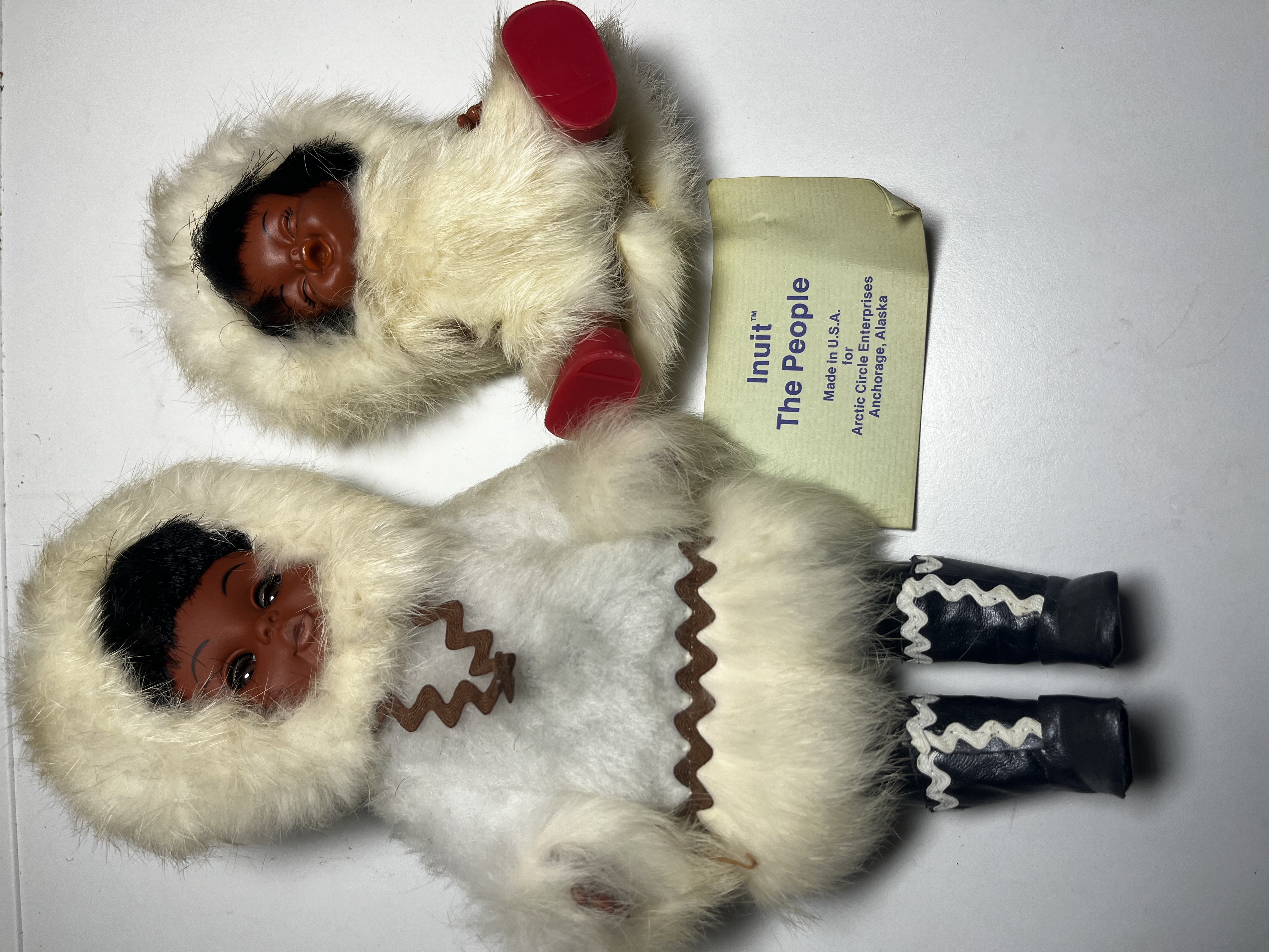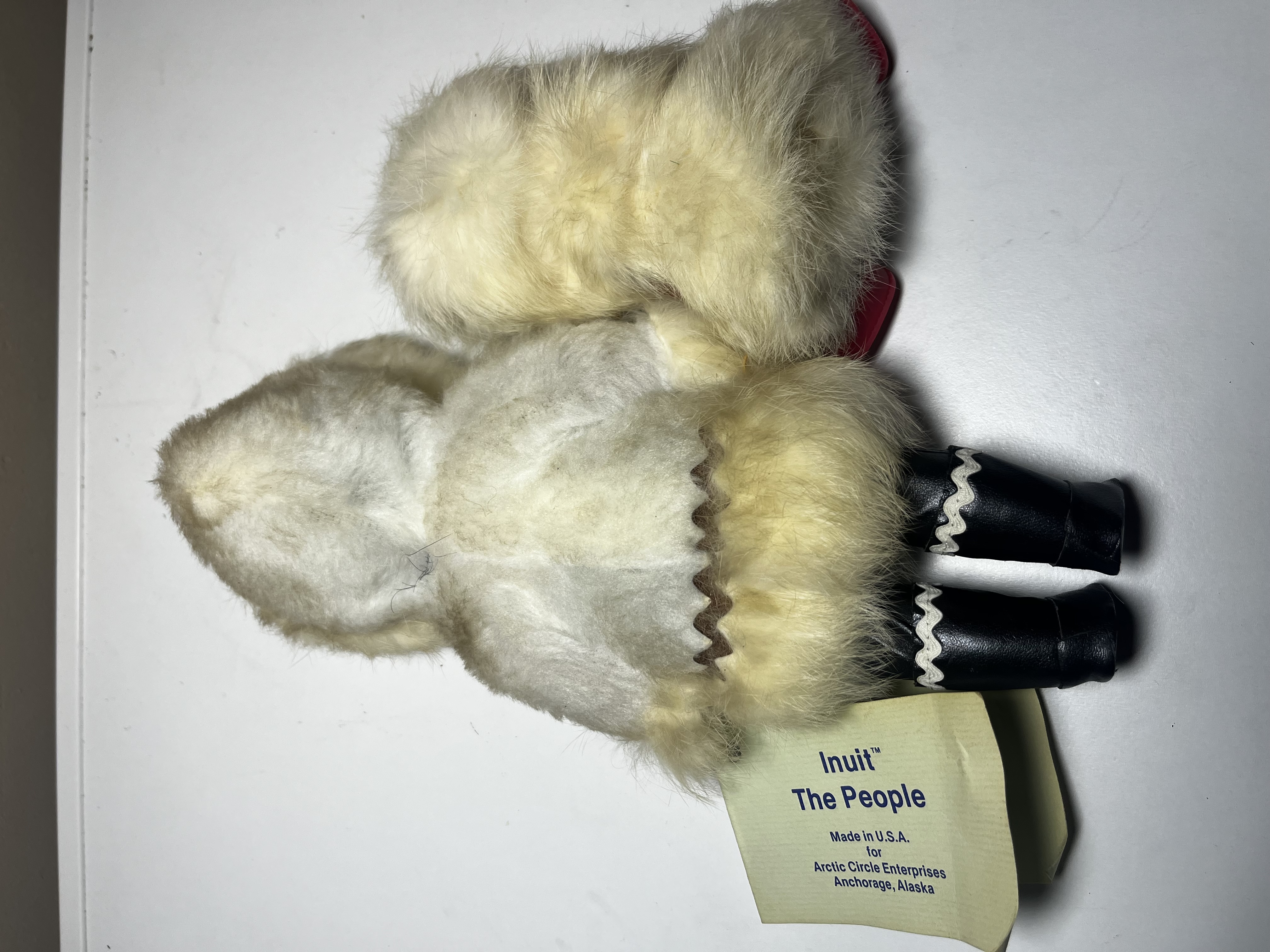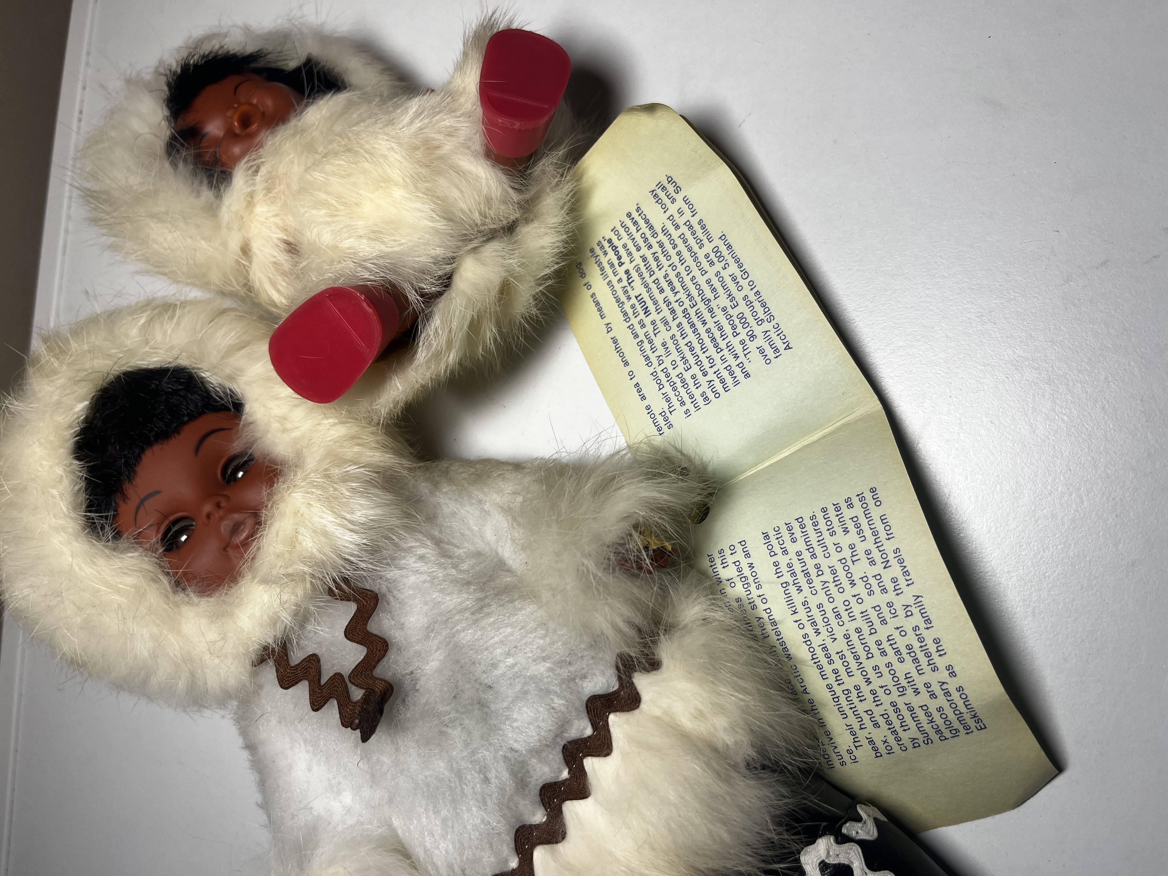 known as “The People” dolls, likely manufactured by Carlson Dolls for Arctic Circle Enterprises of Anchorage, Alaska, as indicated by the accompanying original tag. These unique collectibles offer a glimpse into the cultural heritage of the Inuit people.