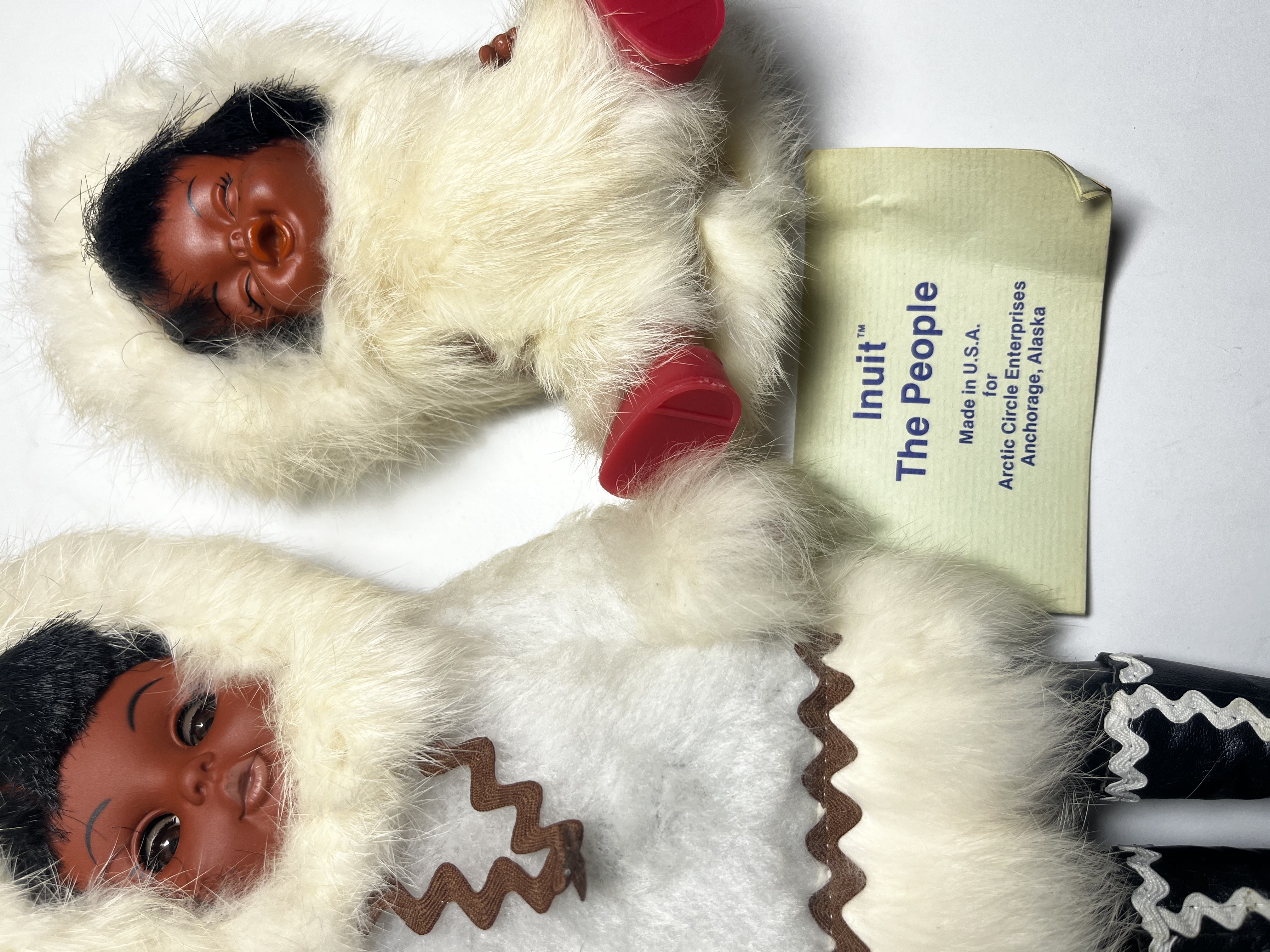 Materials: Both dolls are meticulously crafted, featuring plastic or composition faces, with bodies and clothing made from a combination of soft fur, possibly faux fur, and synthetic or felt materials, replicating traditional Inuit attire. The boots on the larger doll appear to be made of dark-colored leather or faux leather.