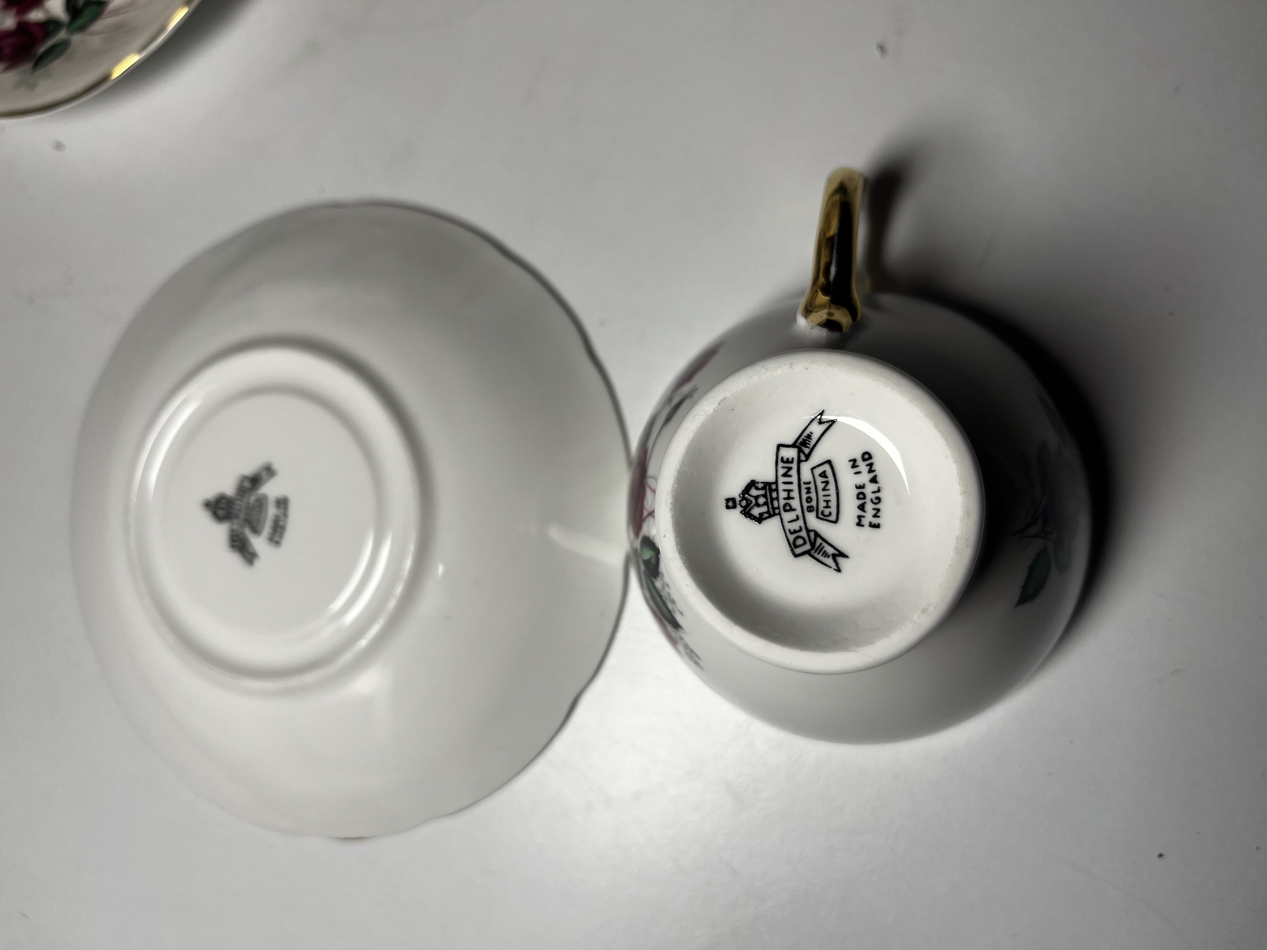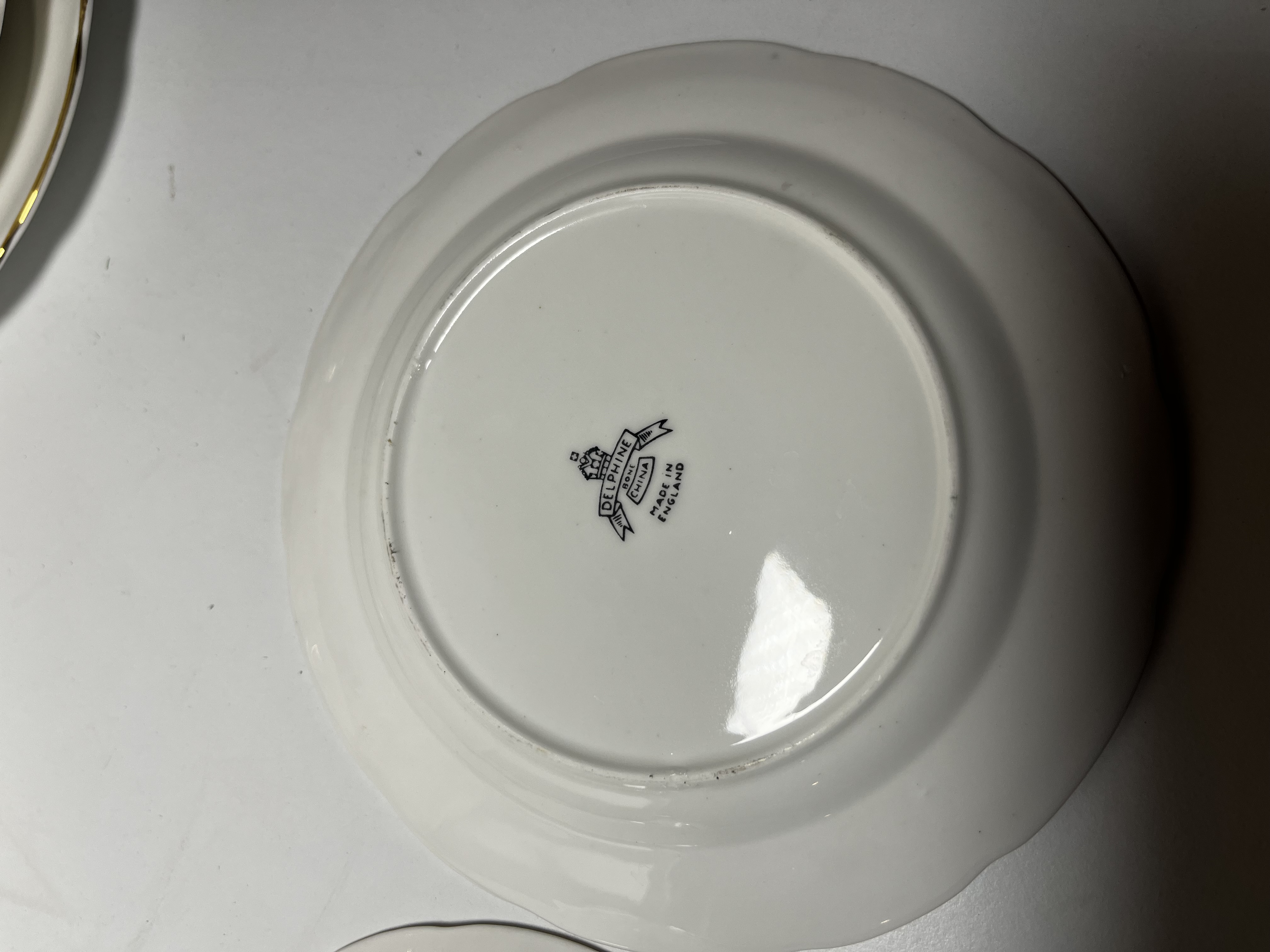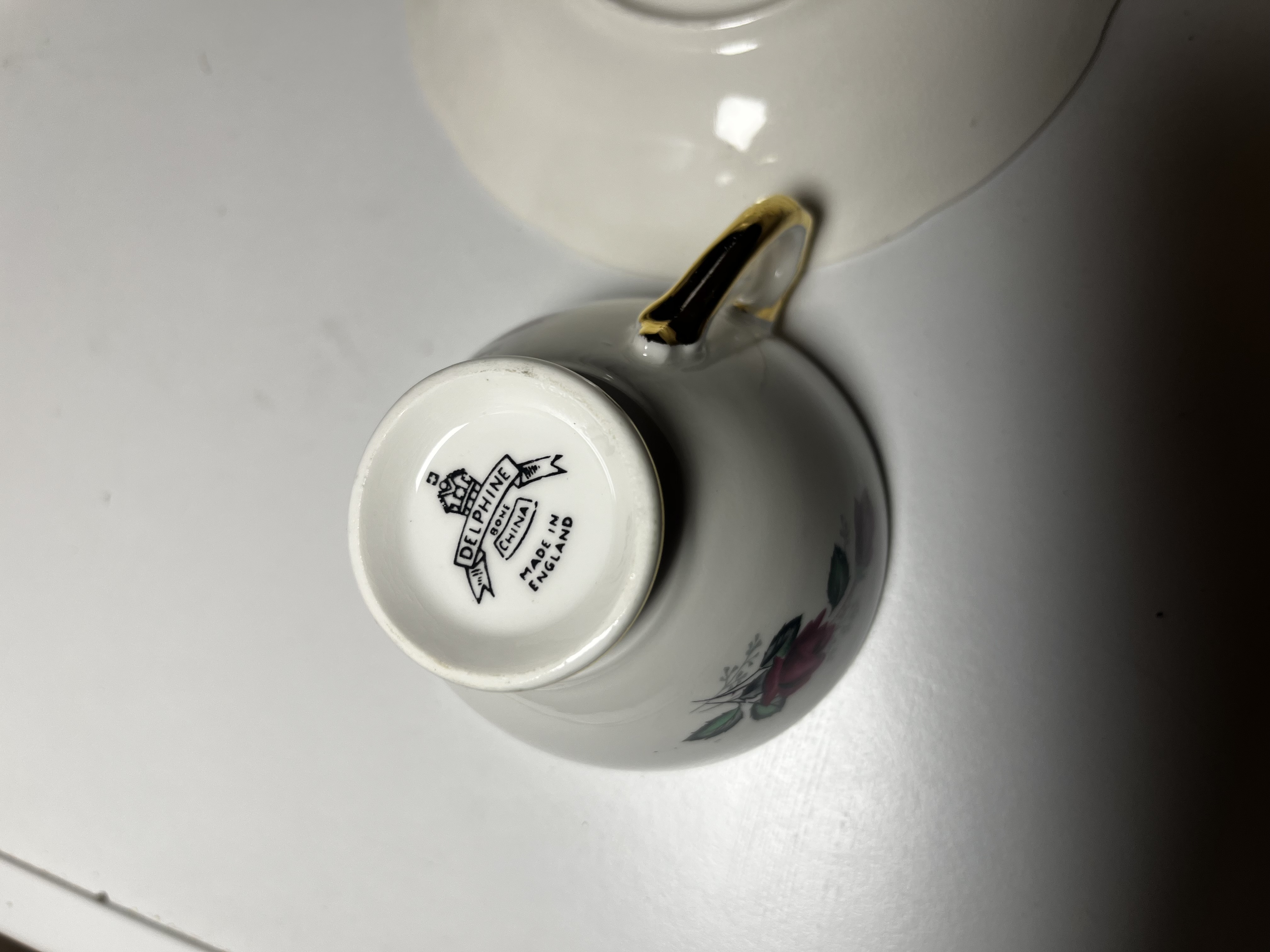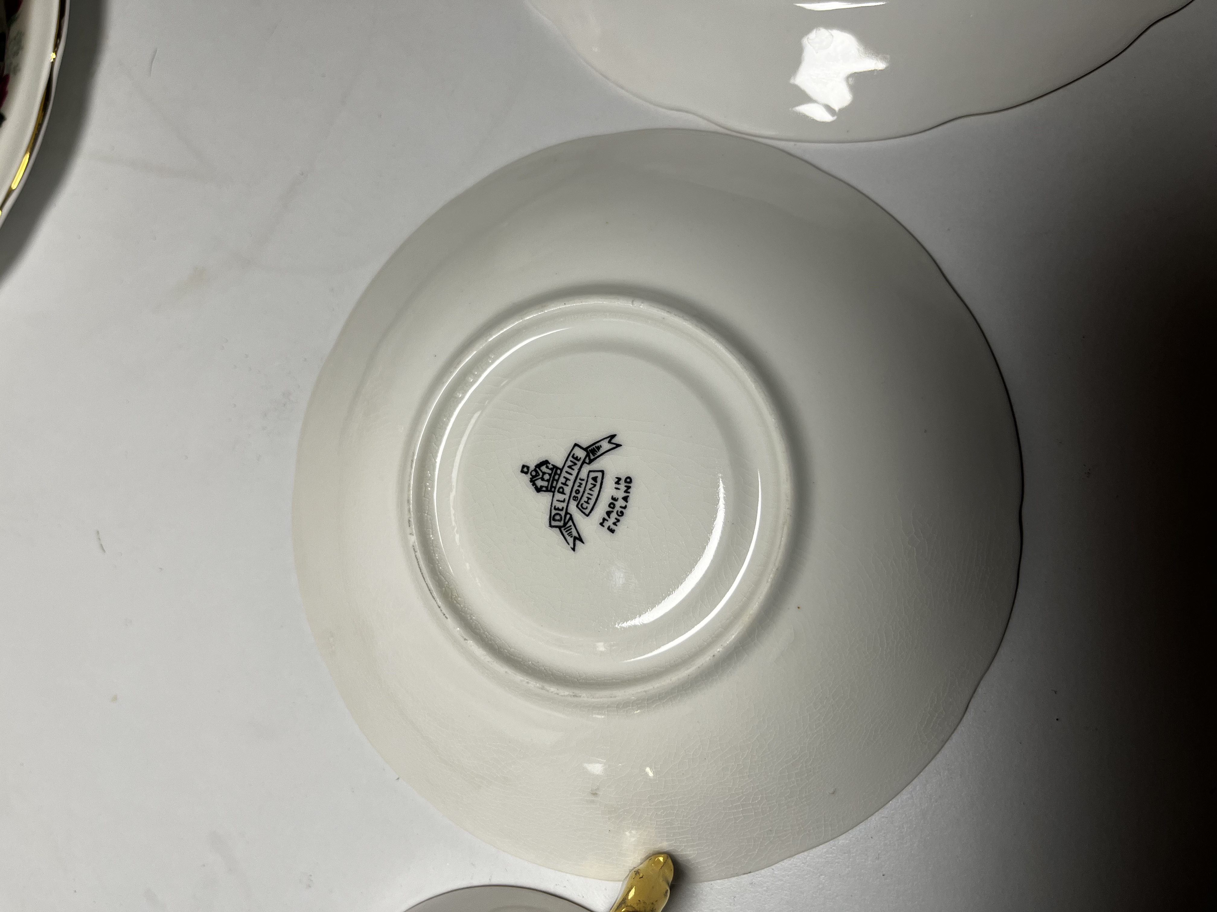 Manufacturer & Mark: Crafted by Delphine Bone China, J.H. Middleton & Co., Longton, Staffordshire, England. Each piece is authentically back-stamped “Delphine Bone China Made in England”. This specific mark dates these pieces to between 1930 and 1941, representing a beautiful era of English pottery.