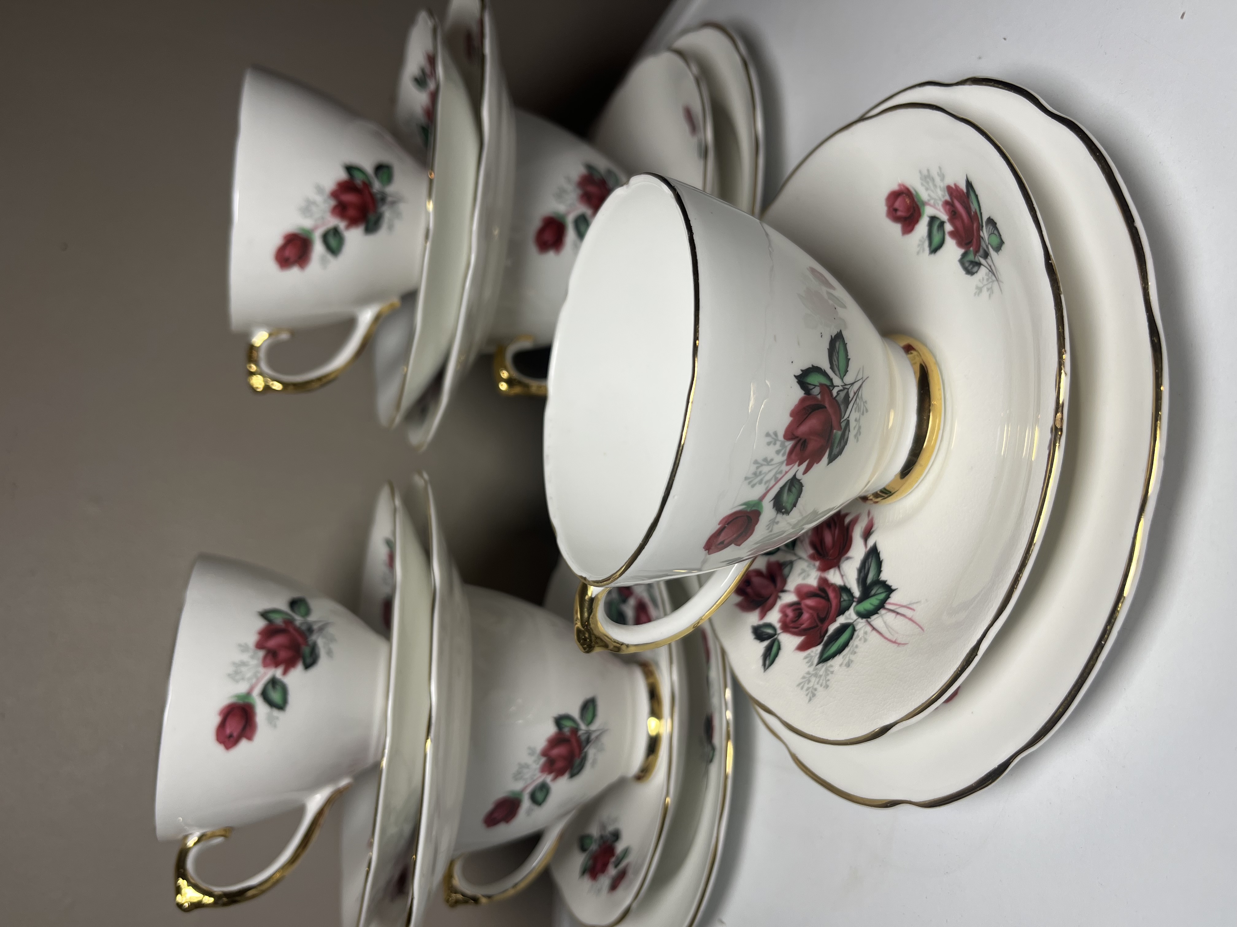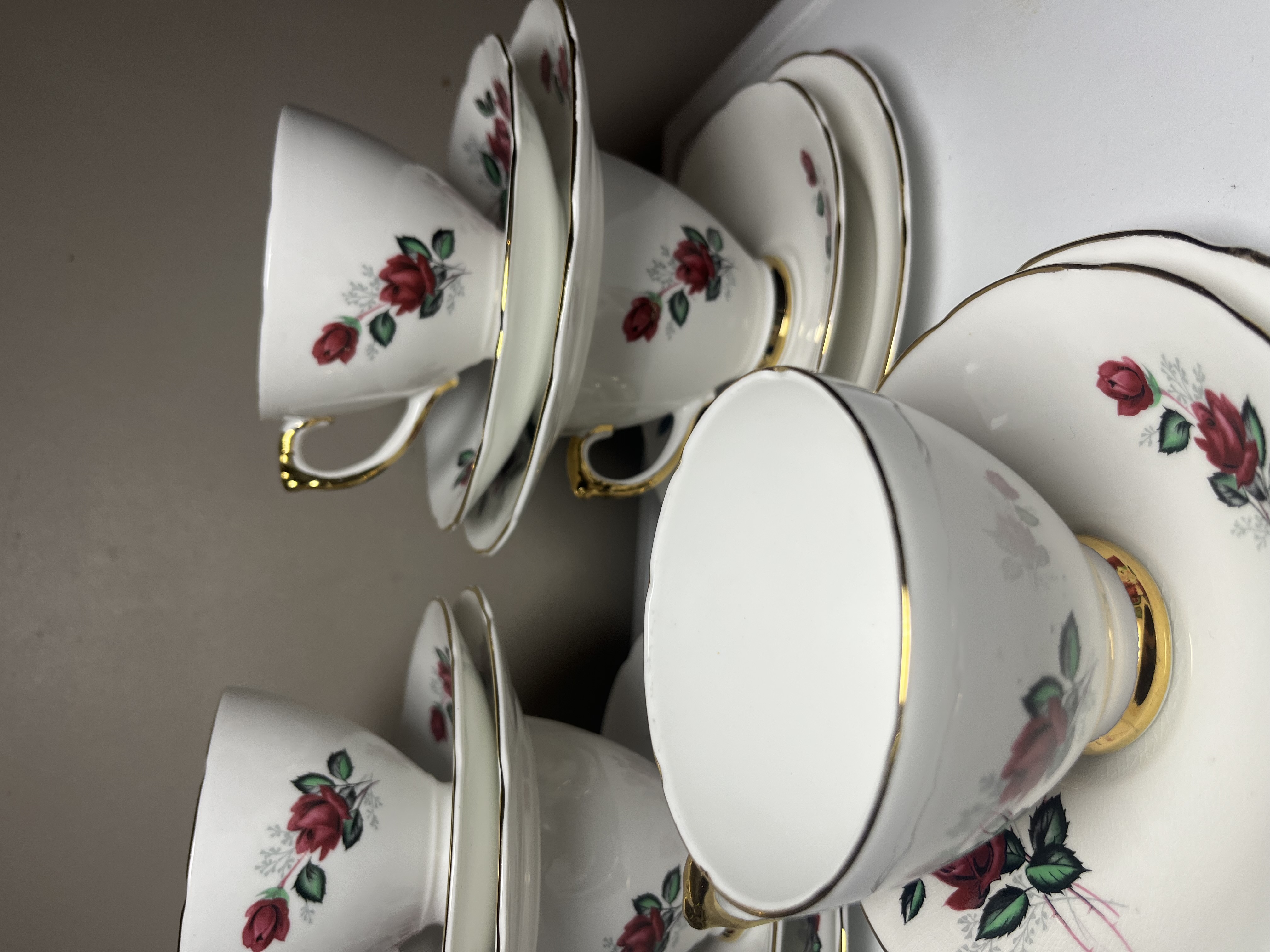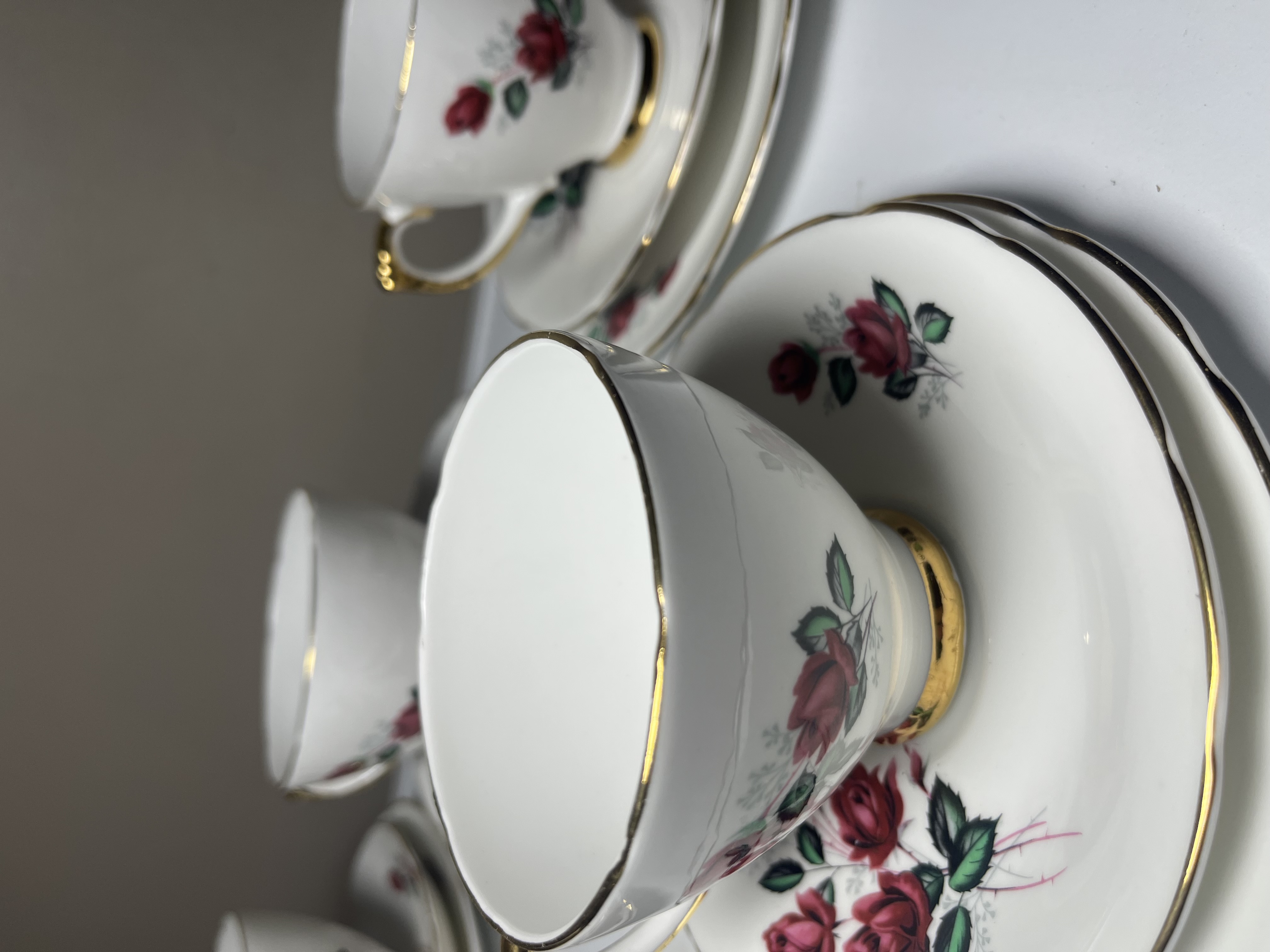 Design & Features: This charming set showcases the beloved “Red Rose” pattern, featuring vibrant red roses with delicate green and gray foliage, gracefully presented on a pristine white bone china ground. Each cup boasts a wide gold band at the base of its pedestal and a gold vine accenting the handle, complemented by intricate gold trimming on the rims of the cups, saucers, and side plates. The teacups are tulip-shaped with finely scalloped rims, and the entire set exudes a classic, timeless elegance perfect for afternoon tea or display