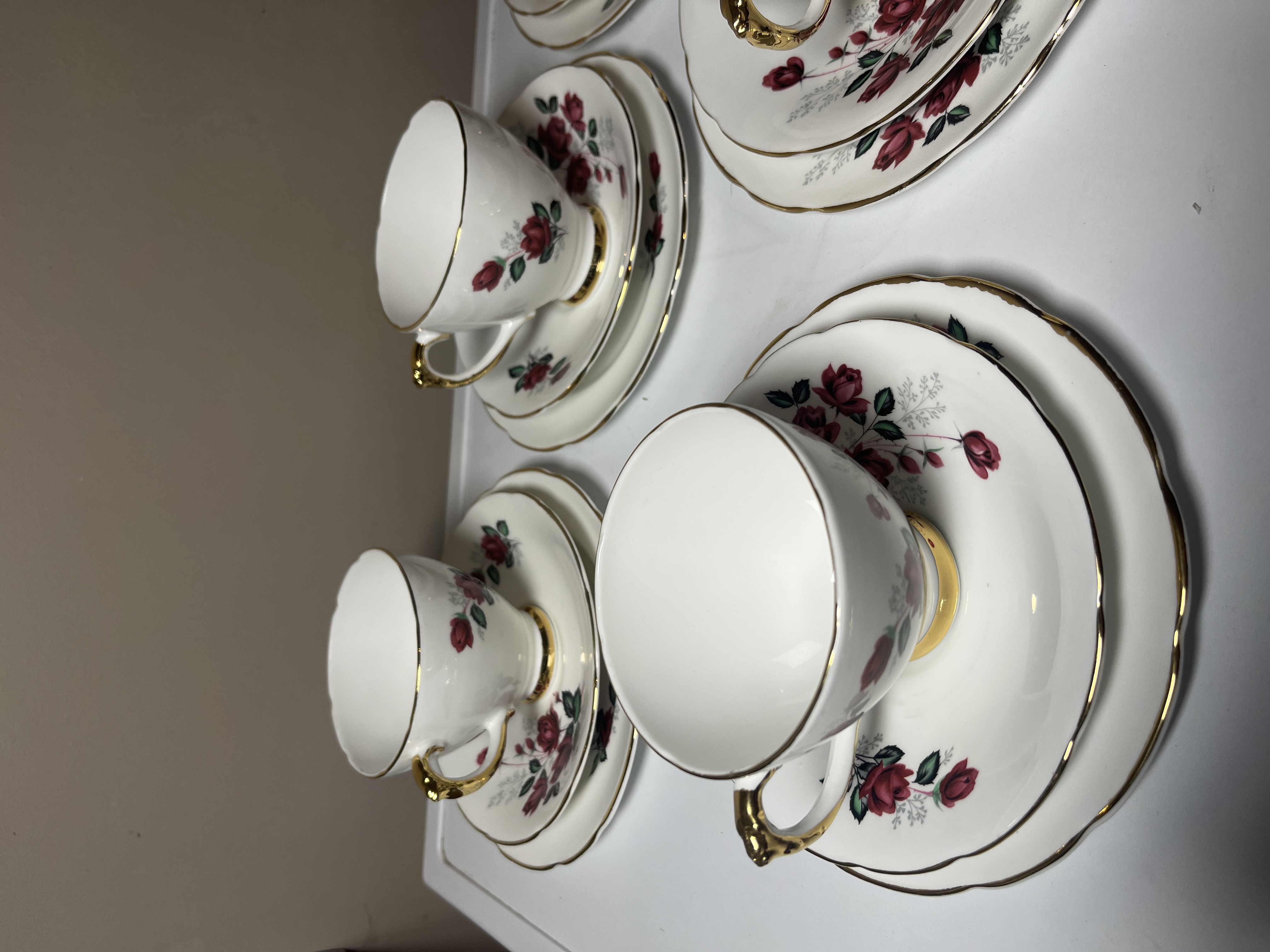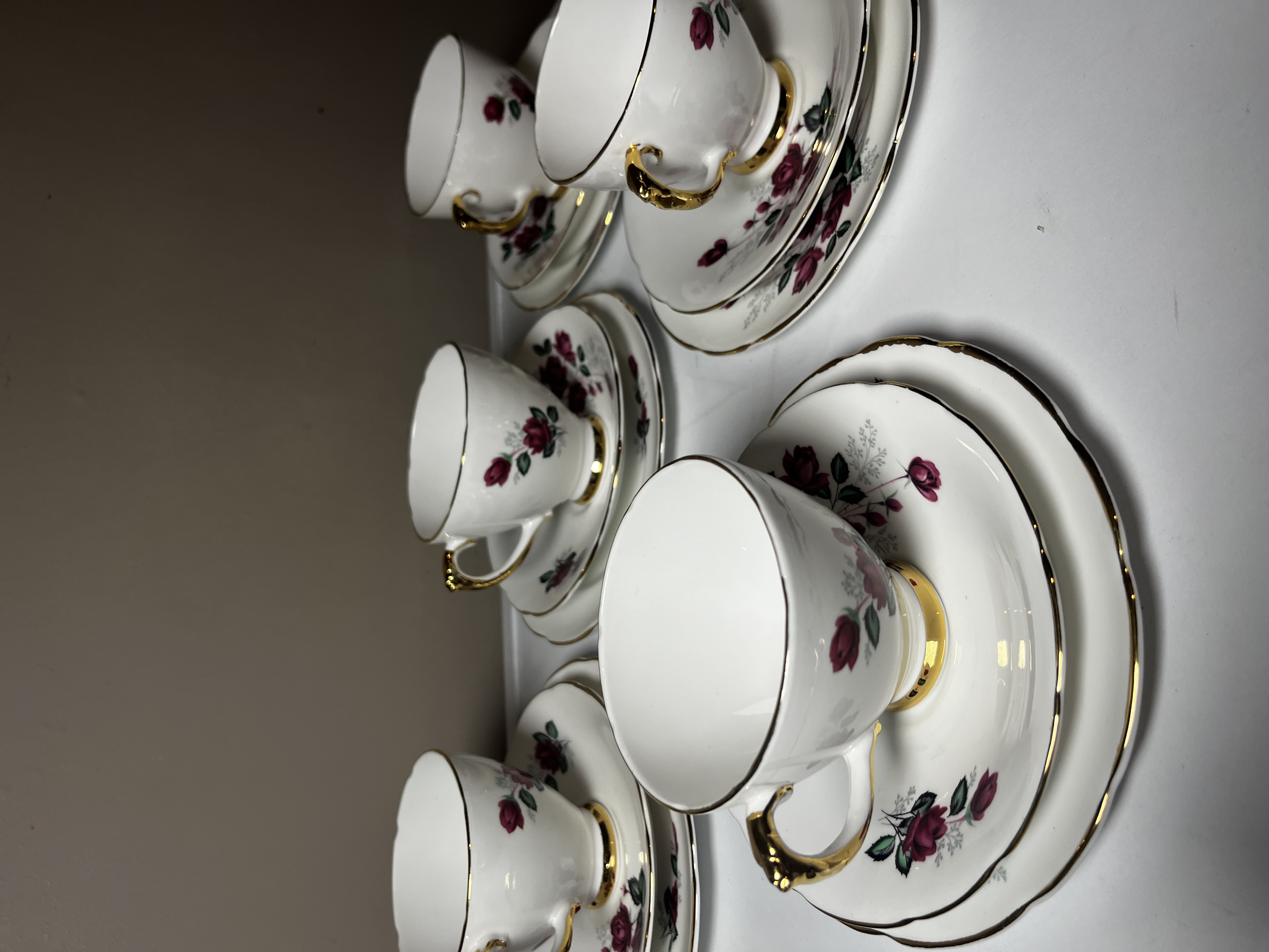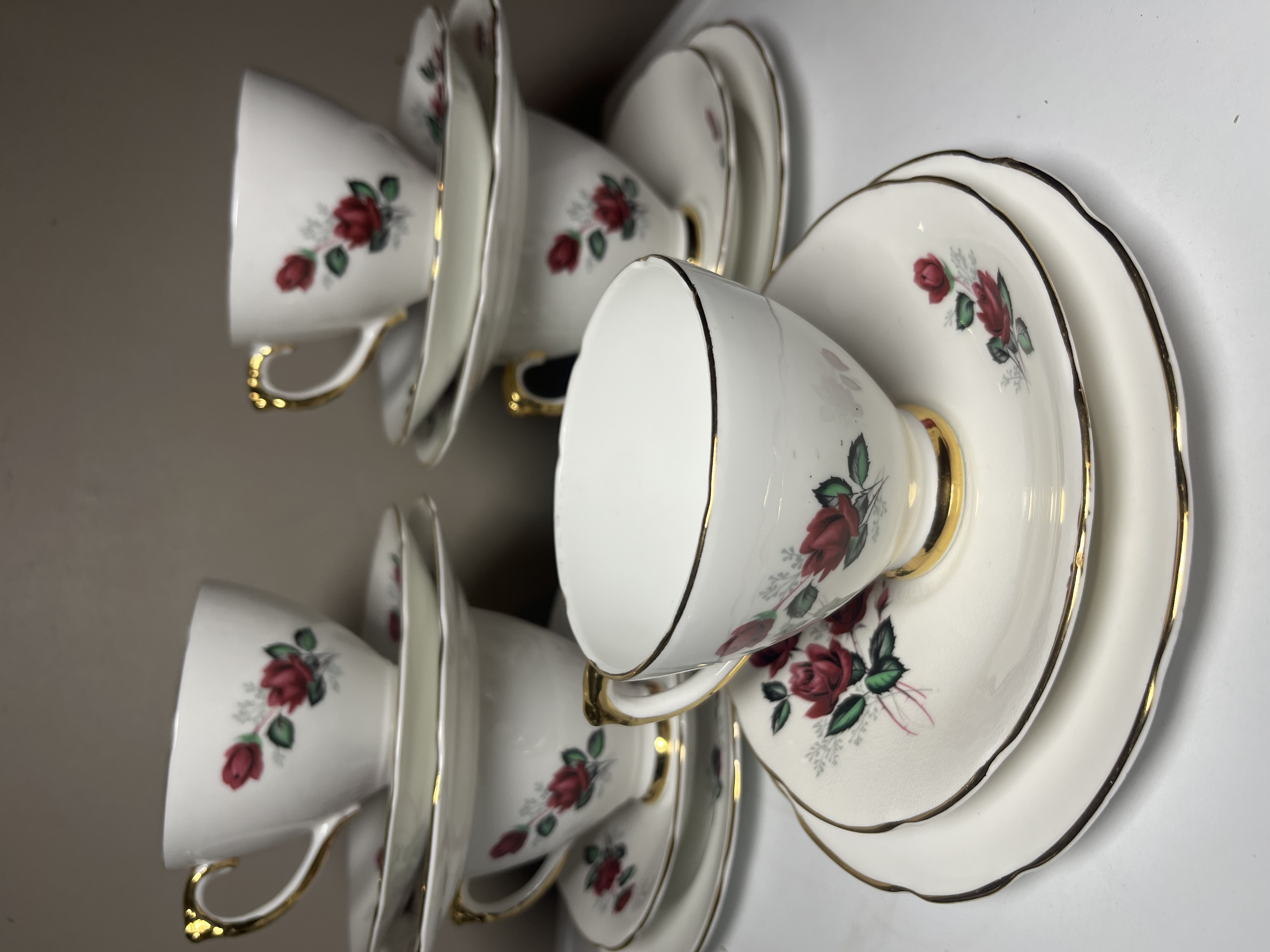 Design & Features: This charming set showcases the beloved “Red Rose” pattern, featuring vibrant red roses with delicate green and gray foliage, gracefully presented on a pristine white bone china ground. Each cup boasts a wide gold band at the base of its pedestal and a gold vine accenting the handle, complemented by intricate gold trimming on the rims of the cups, saucers, and side plates. The teacups are tulip-shaped with finely scalloped rims, and the entire set exudes a classic, timeless elegance perfect for afternoon tea or display