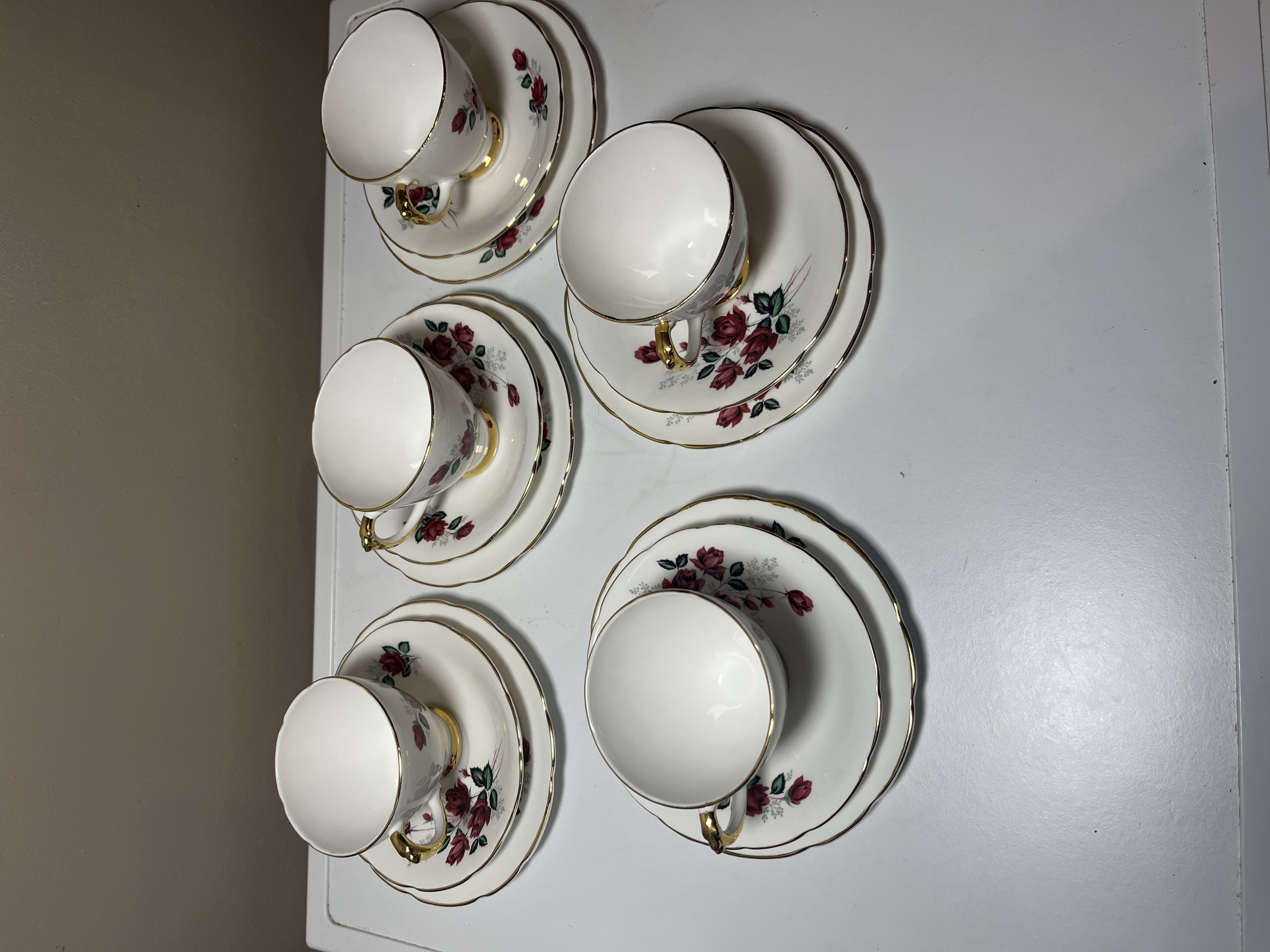 Lot includes: A stunning set of five (5) matching vintage English Bone China tea trios, each comprising a teacup, saucer, and side plate.