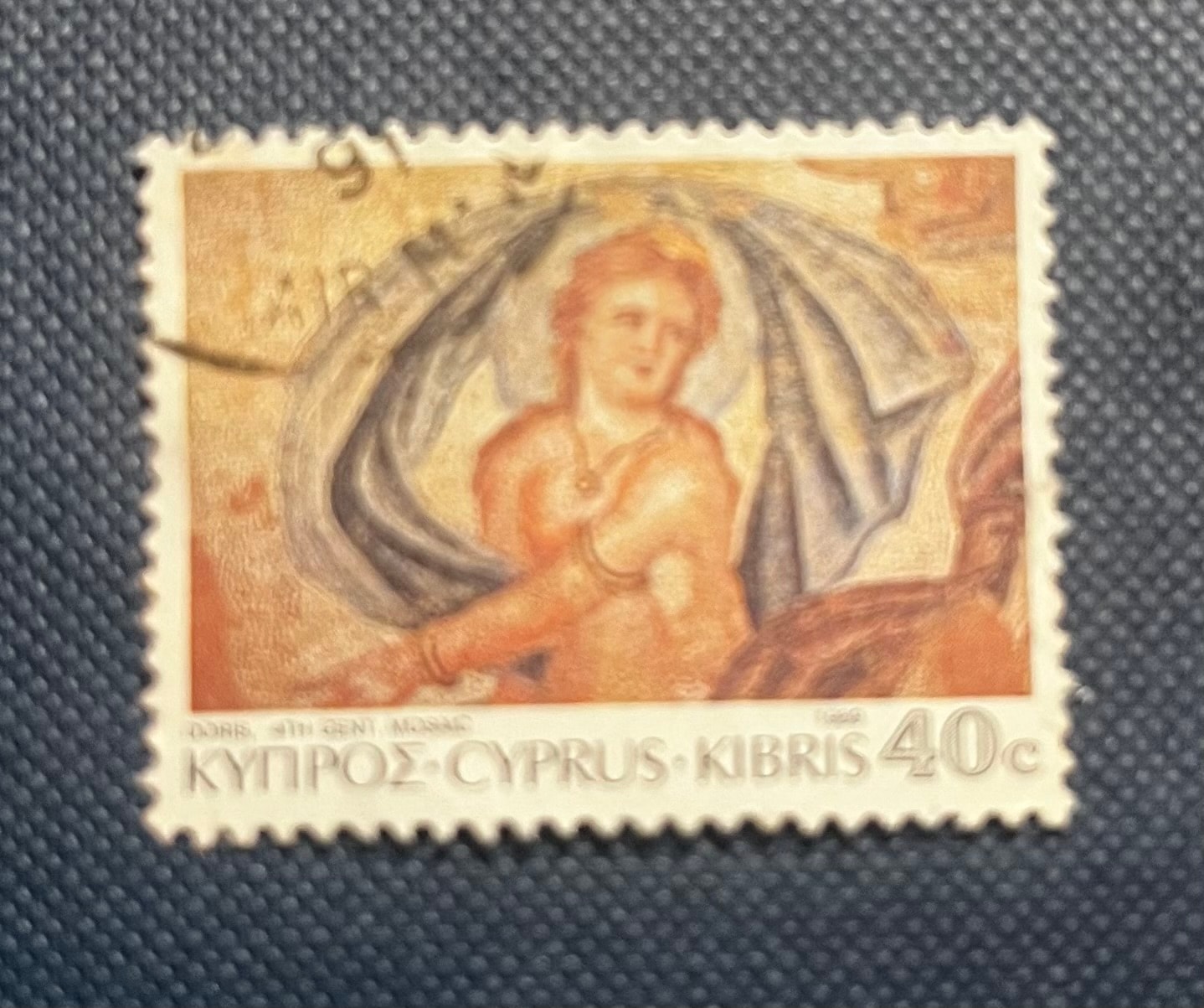A Cyprus 1989 SG767 40c Roman Mosaics from Paphos – Doris Used postage stamp. This rectangular, perforated stamp depicts a polychromatic classical or mythological figure, likely female and partially draped, rendered in warm orange, brown, and yellow tones against a light background with blue-grey drapery. The bottom left features the text “DORIS, 4TH CENT. MOSAIC, ” beneath which are the words “KYПРОΣ CYPRUS KIBRIS.” The denomination “40c” is printed in the bottom right corner.