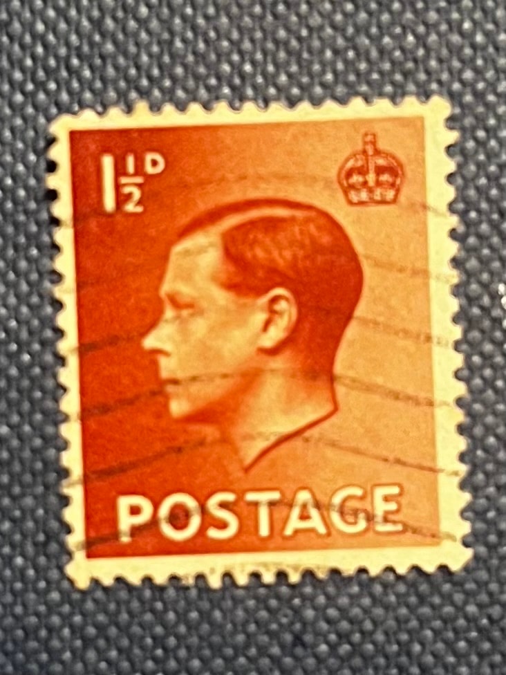A Great Britain King Edward VIII 1 1/2d used postage stamp. This perforated stamp is printed on paper in a reddish-orange hue, featuring a left-facing profile bust of King Edward VIII. A small crown emblem is visible in the upper right corner, with the denomination “1 1/2D” prominently displayed in the upper left. The word “POSTAGE” is printed along the bottom edge. Stylistically, it is consistent with a 20th-century British definitive issue.