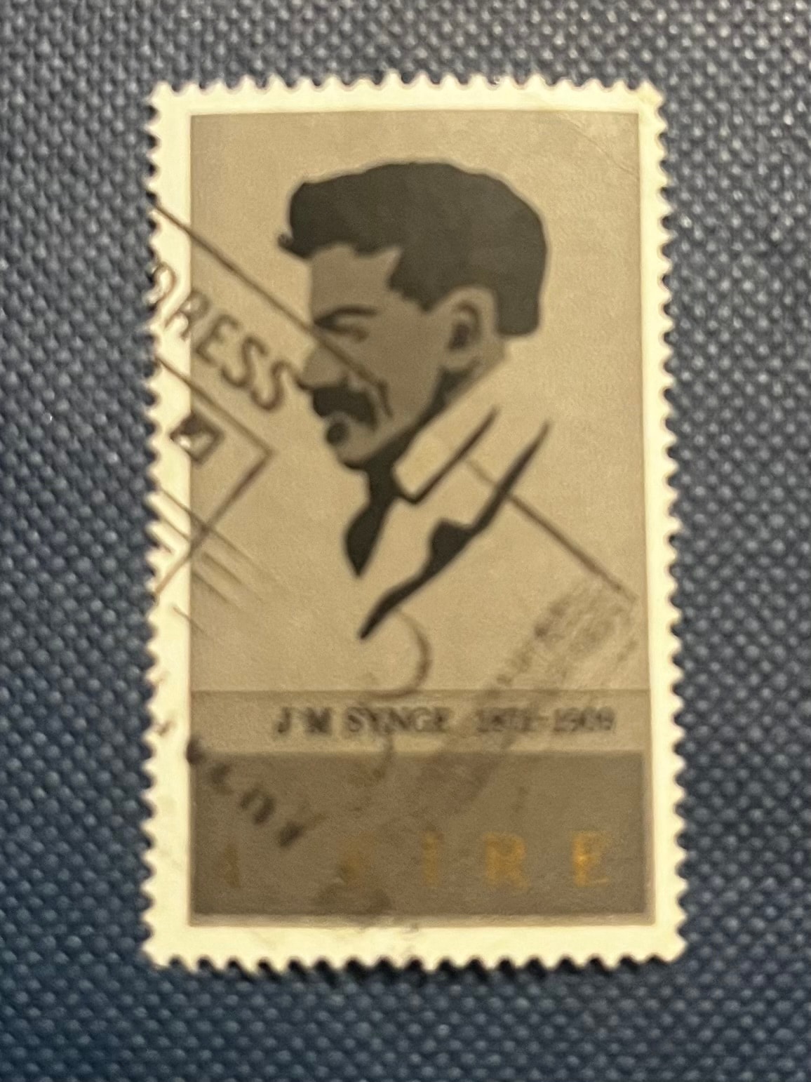 A 1971 Irish commemorative postage stamp featuring John Millington Synge. The stamp depicts an illustrative, two-tone portrait in profile of J. M. Synge (1871-1909) with a mustache, rendered as a dark silhouette against a lighter background. The name ‘J. M. SYNGE’ and dates ‘1871-1909’ are inscribed below the portrait, with ‘EIRE’ visible at the bottom. Made of paper with perforated edges, the stamp exhibits a muted color palette, primarily beige and black.