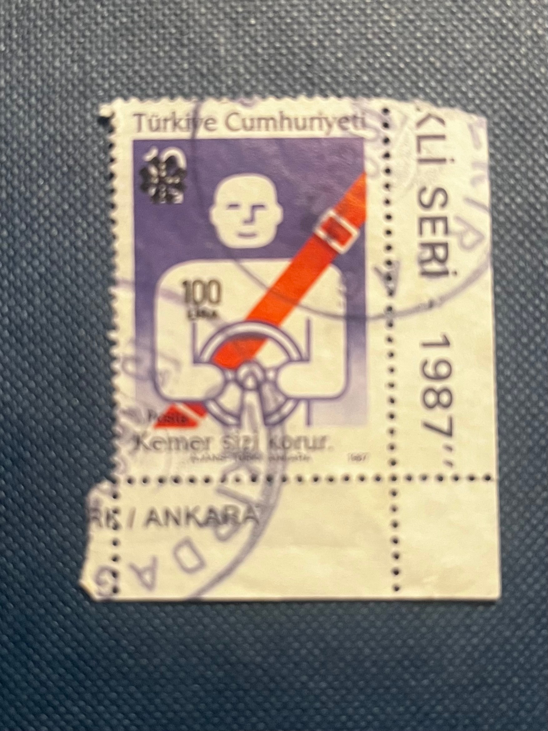 A Turkish postage stamp from the 1987 ‘Traffic Types’ series, identified as Scott Catalog #2466. This 100 Lira denomination stamp features a modern illustrative design in purple, white, and red, depicting an abstract figure wearing a seatbelt and holding a steering wheel. Inscriptions include ‘Türkiye Cumhuriyeti’ (Republic of Turkey) at the top, ‘GÜVENLİ SERİ’ (Safe Series) vertically along the right edge, and ‘Kemer Sizi korur.’ (Seat belt protects you.) at the bottom. A circular postmark is visible on the bottom left, partially obscuring text but clearly showing ‘ANKARA’ and ’16’. Made of paper.